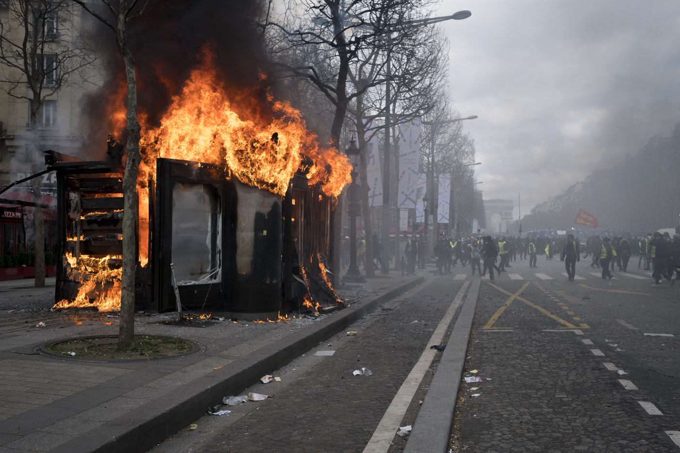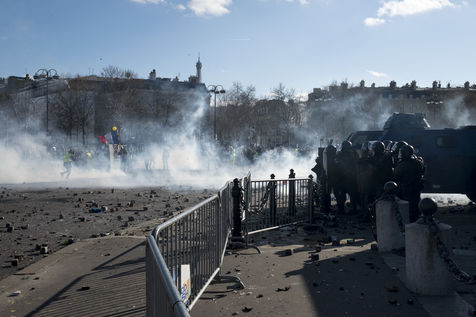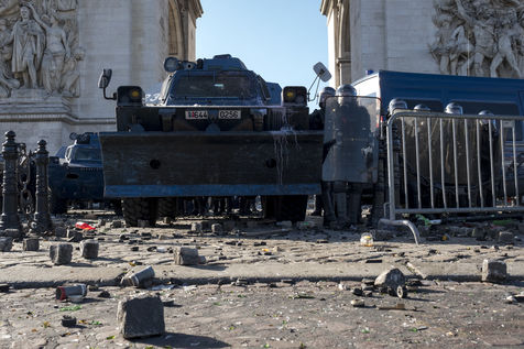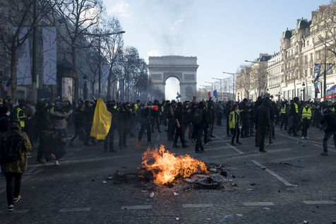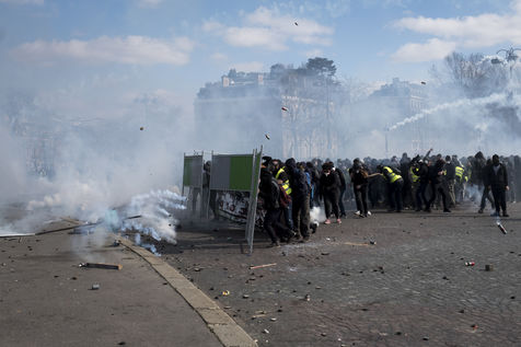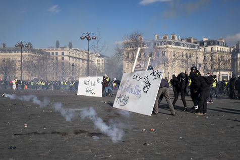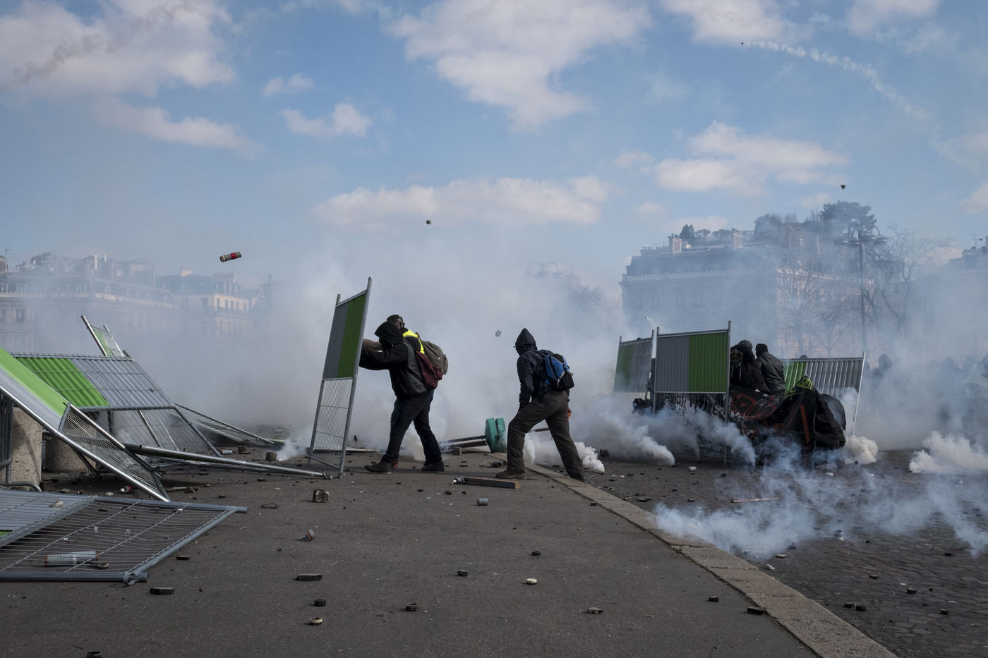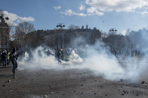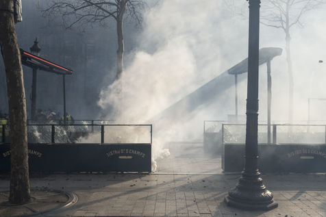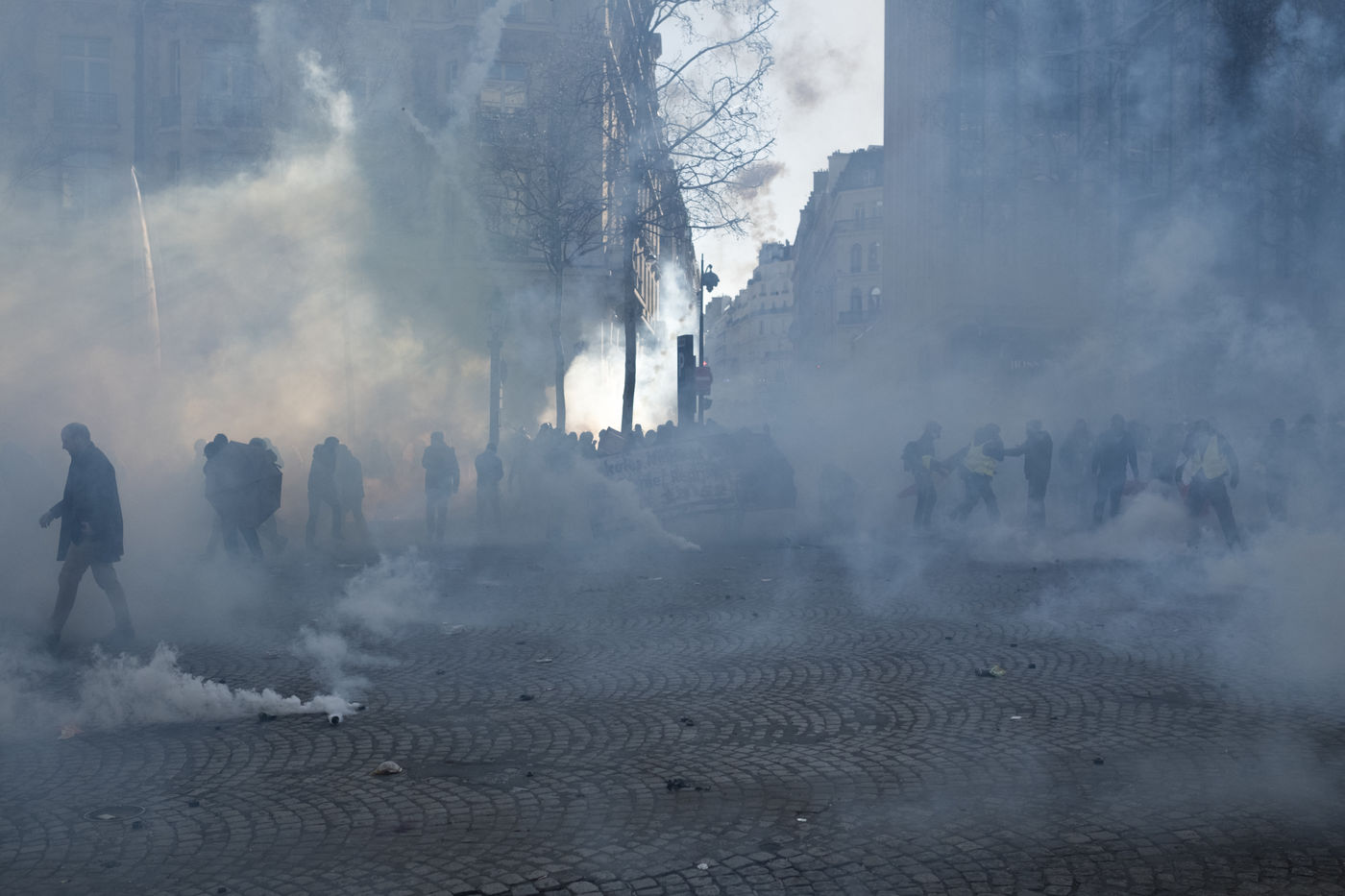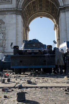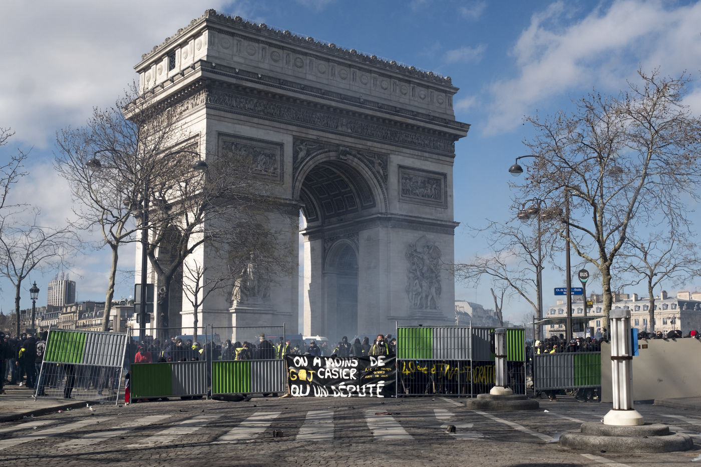 Paris, le 16 mars 2019. Pour les quatre mois du mouvement des Gilets Jaunes, et au lendemain de la fin du Grand Débat national voulu par le Président Macron, environ dix mille manifestants se sont retrouvés sur les Champs-Elysées et la Place de l'Etoile. Des affrontements ont rapidement éclaté au pied de l'Arc de Triomphe entre les forces de l'ordre et certains manifestants, dont des "Black Blocks", et ont duré jusqu'en fin de journée. De nombreuses boutiques et restaurants, dont le Fouquets, ont été vandalisés ou incendiés.