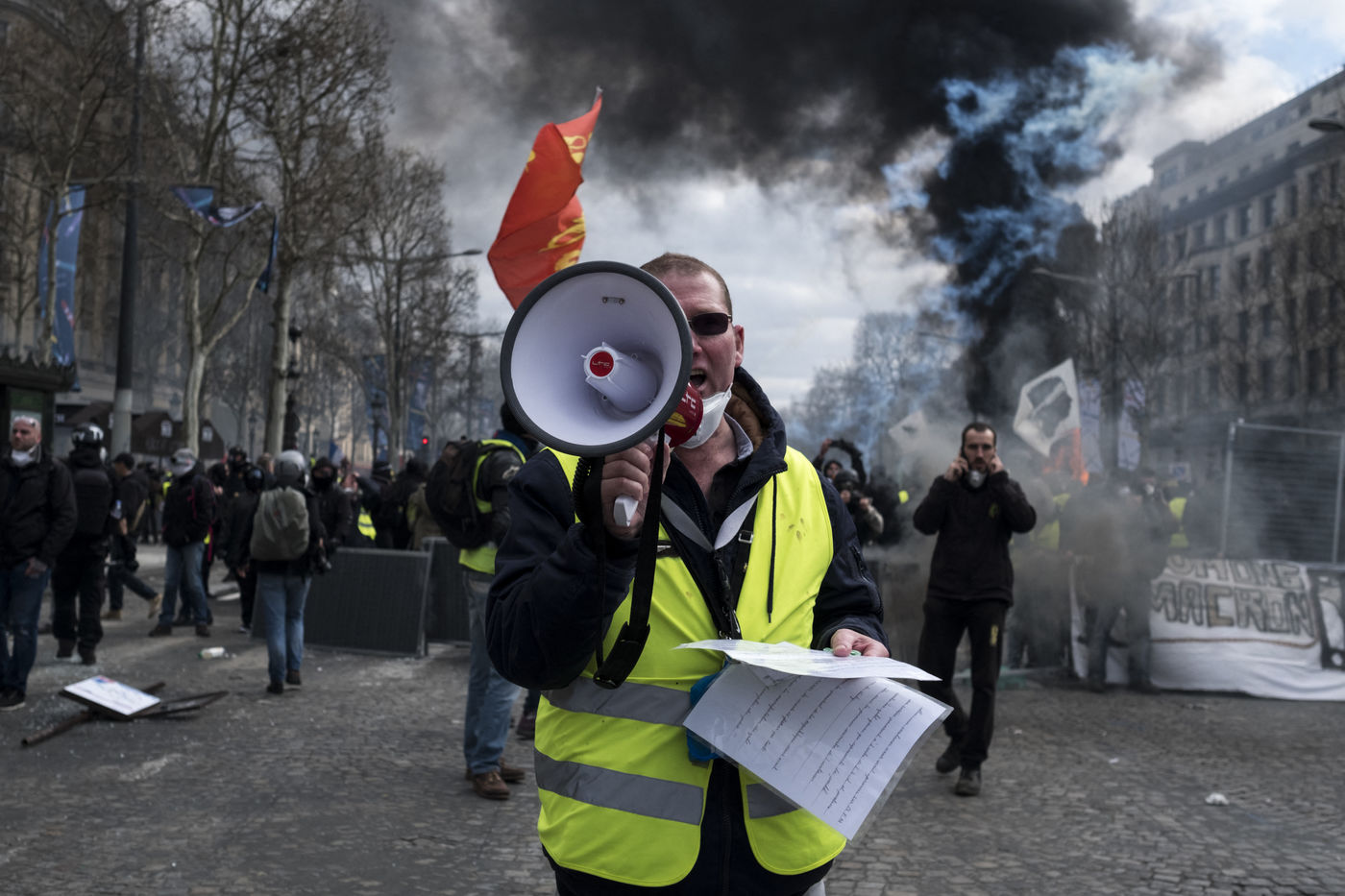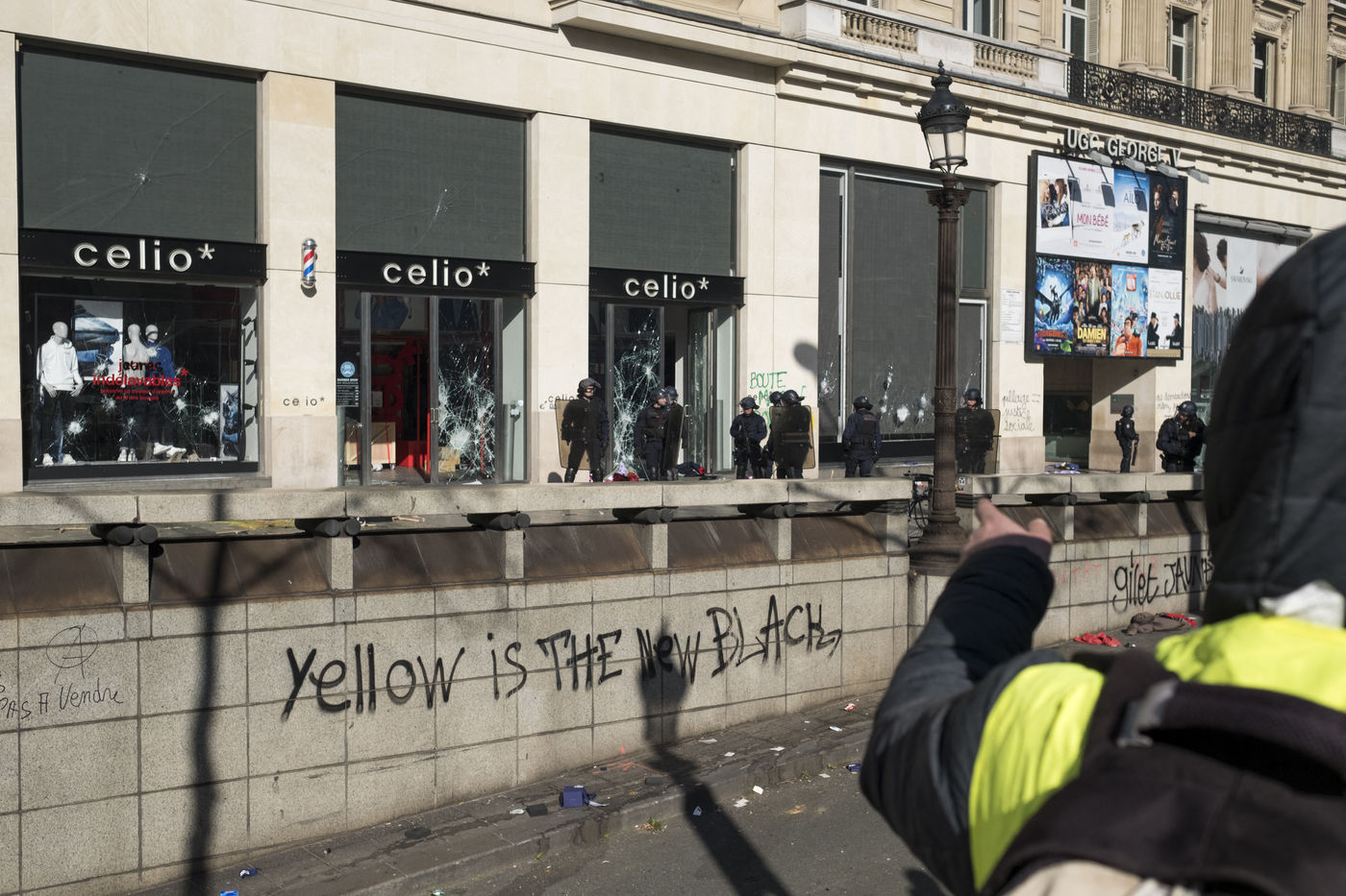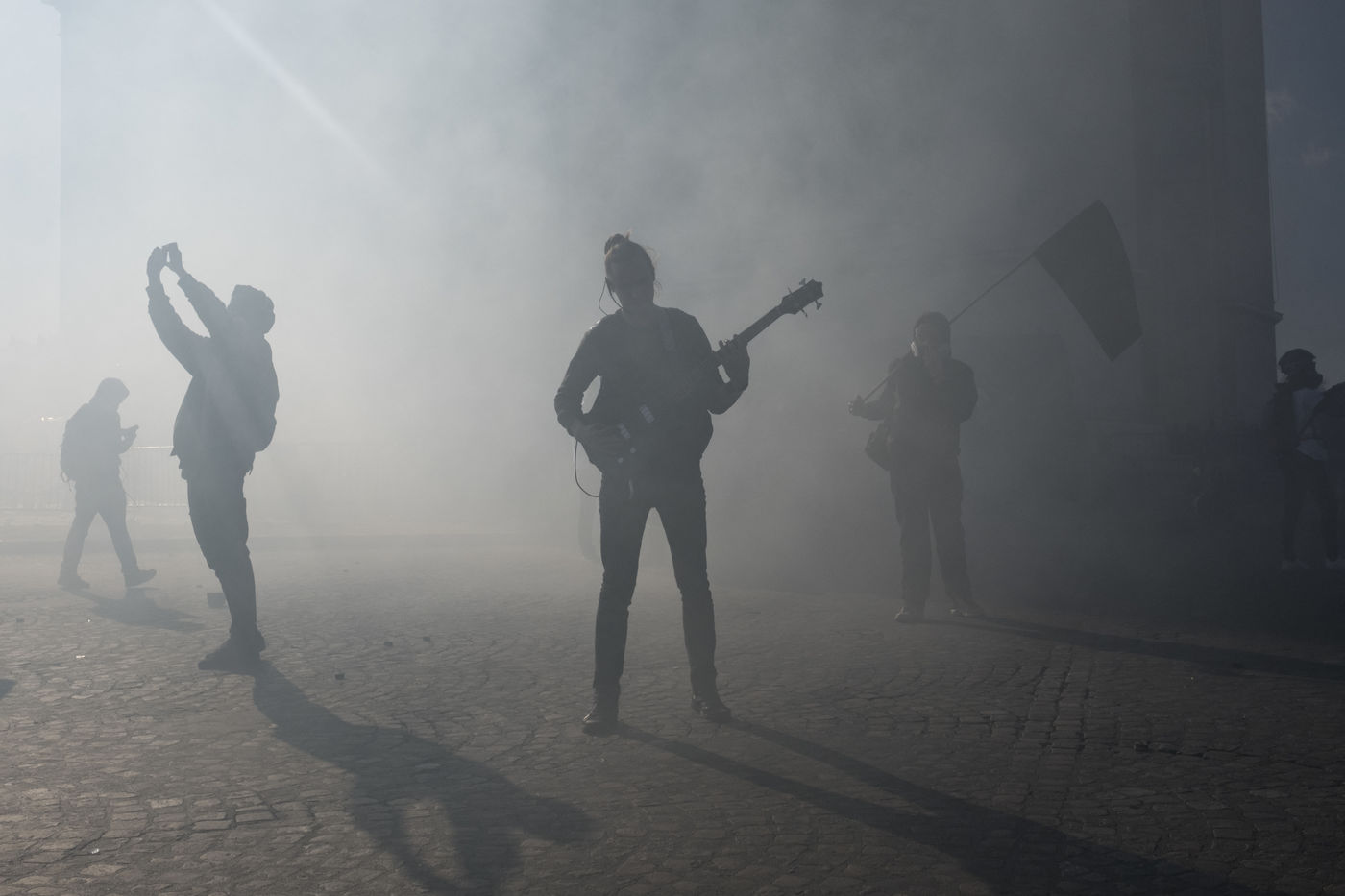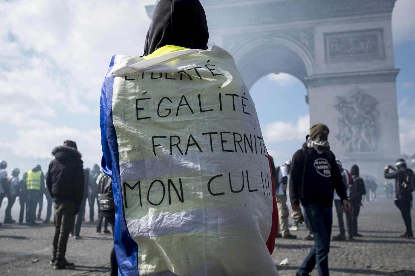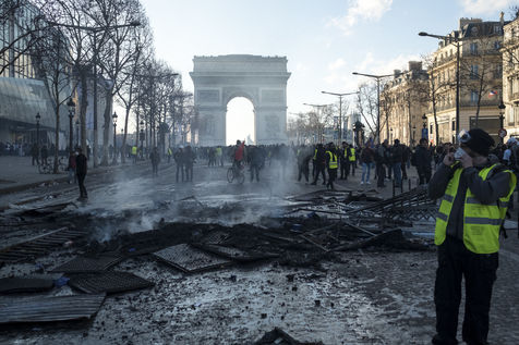Paris, le 16 mars 2019. Pour les quatre mois du mouvement des Gilets Jaunes, et au lendemain de la fin du Grand Débat national voulu par le Président Macron, environ dix mille manifestants se sont retrouvés sur les Champs-Elysées et la Place de l'Etoile. Des affrontements ont rapidement éclaté au pied de l'Arc de Triomphe entre les forces de l'ordre et certains manifestants, dont des "Black Blocks", et ont duré jusqu'en fin de journée. De nombreuses boutiques et restaurants, dont le Fouquets, ont été vandalisés ou incendiés.
