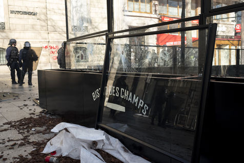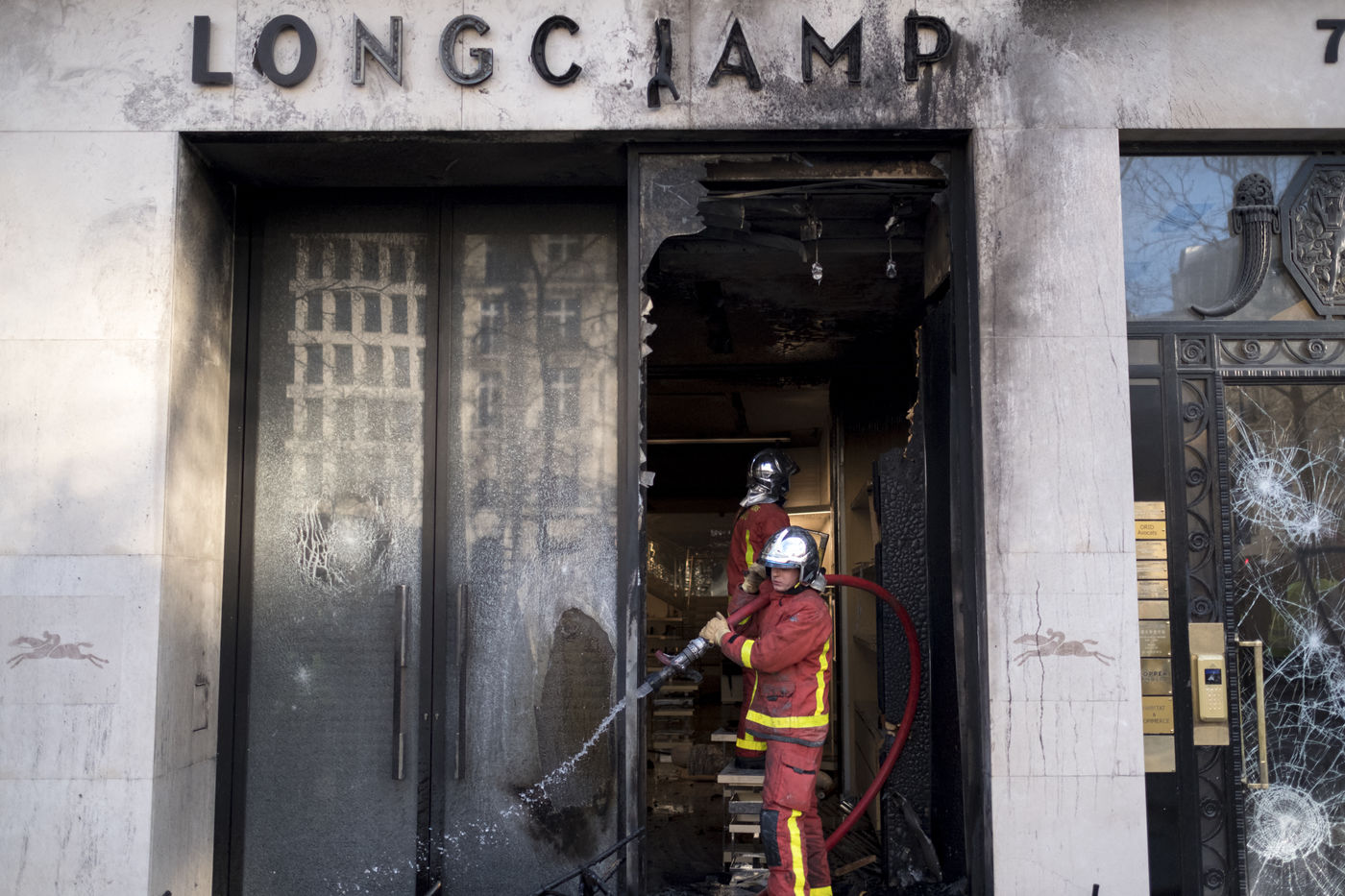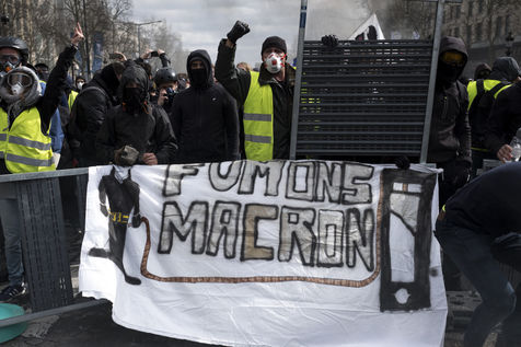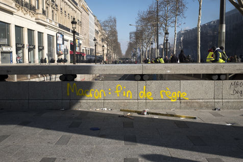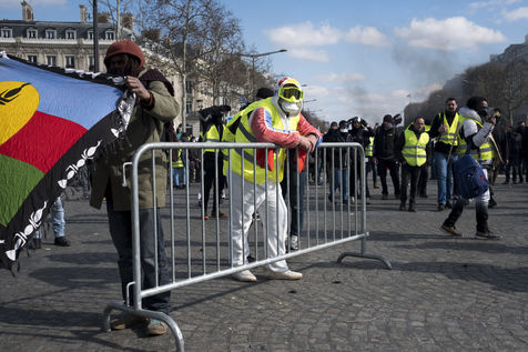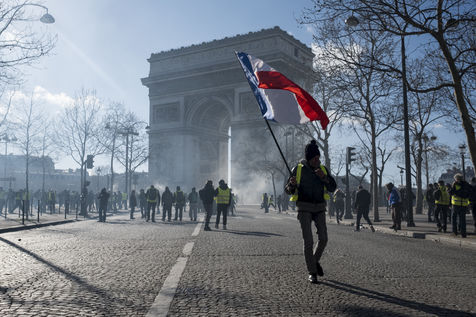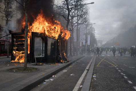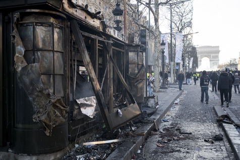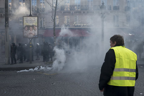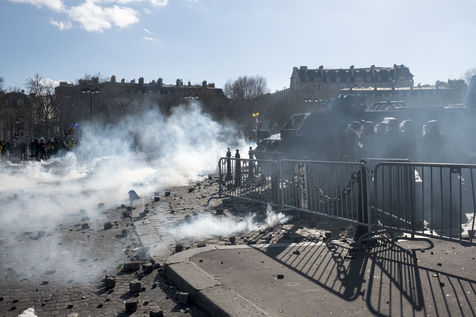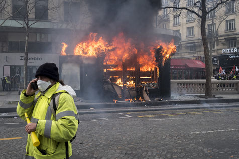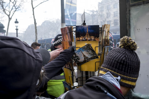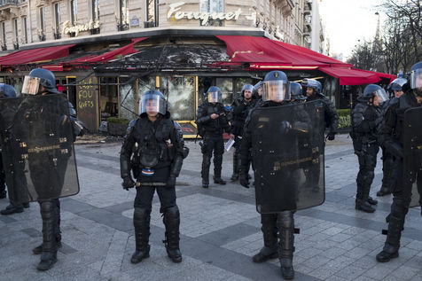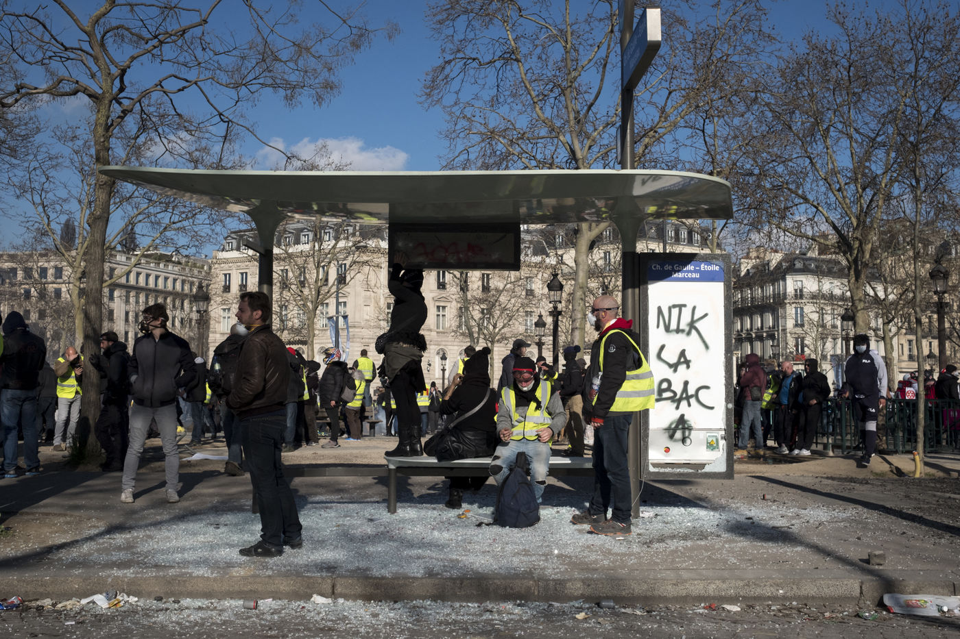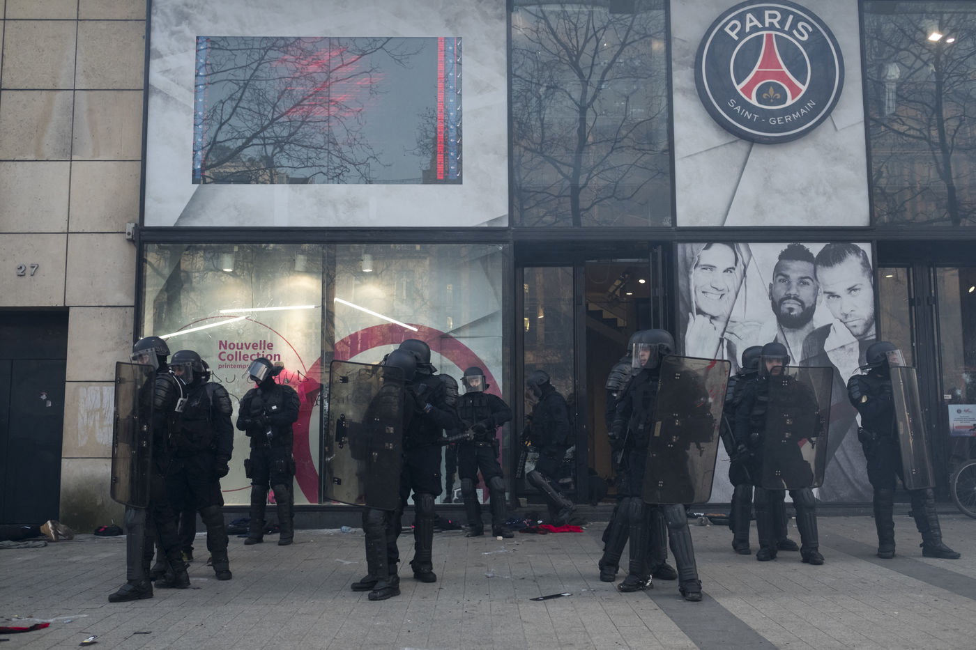 Paris, le 16 mars 2019. Pour les quatre mois du mouvement des Gilets Jaunes, et au lendemain de la fin du Grand Débat national voulu par le Président Macron, environ dix mille manifestants se sont retrouvés sur les Champs-Elysées et la Place de l'Etoile. Des affrontements ont rapidement éclaté au pied de l'Arc de Triomphe entre les forces de l'ordre et certains manifestants, dont des "Black Blocks", et ont duré jusqu'en fin de journée. De nombreuses boutiques et restaurants, dont le Fouquets, ont été vandalisés ou incendiés.