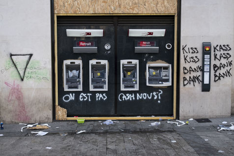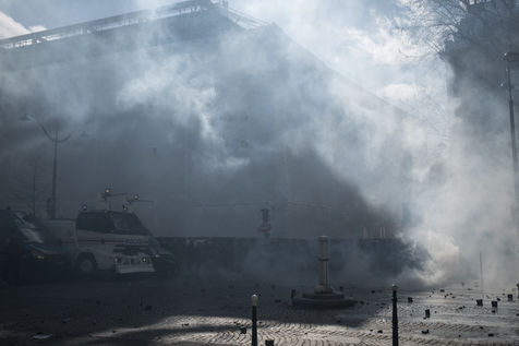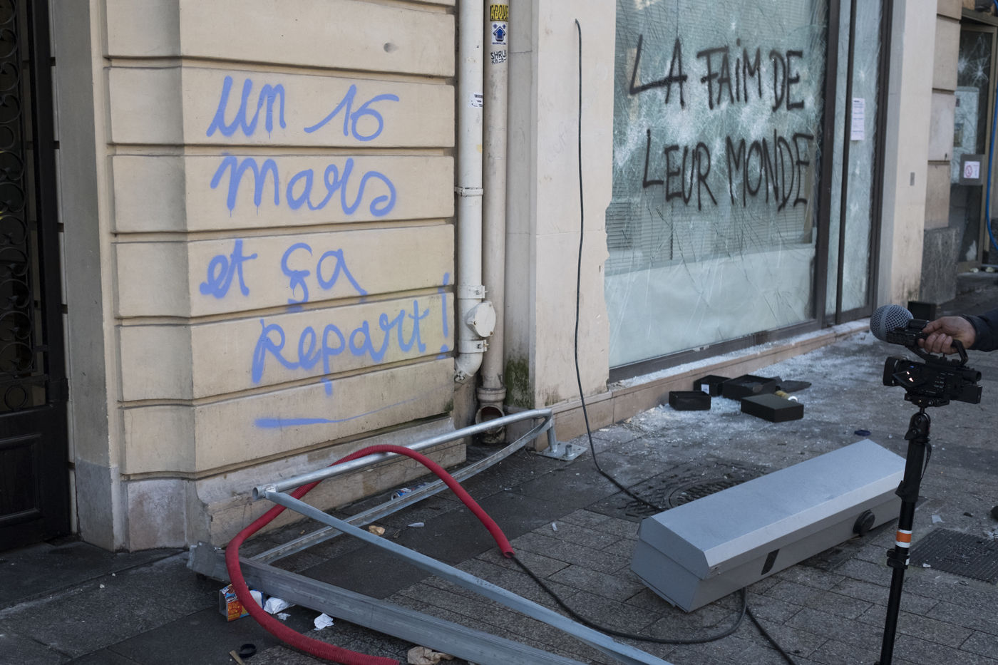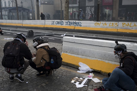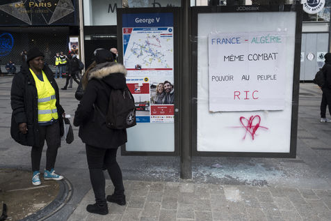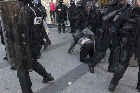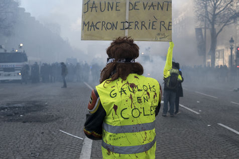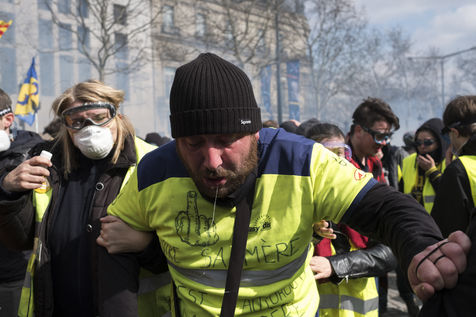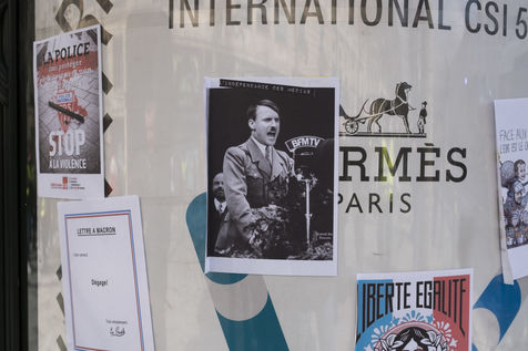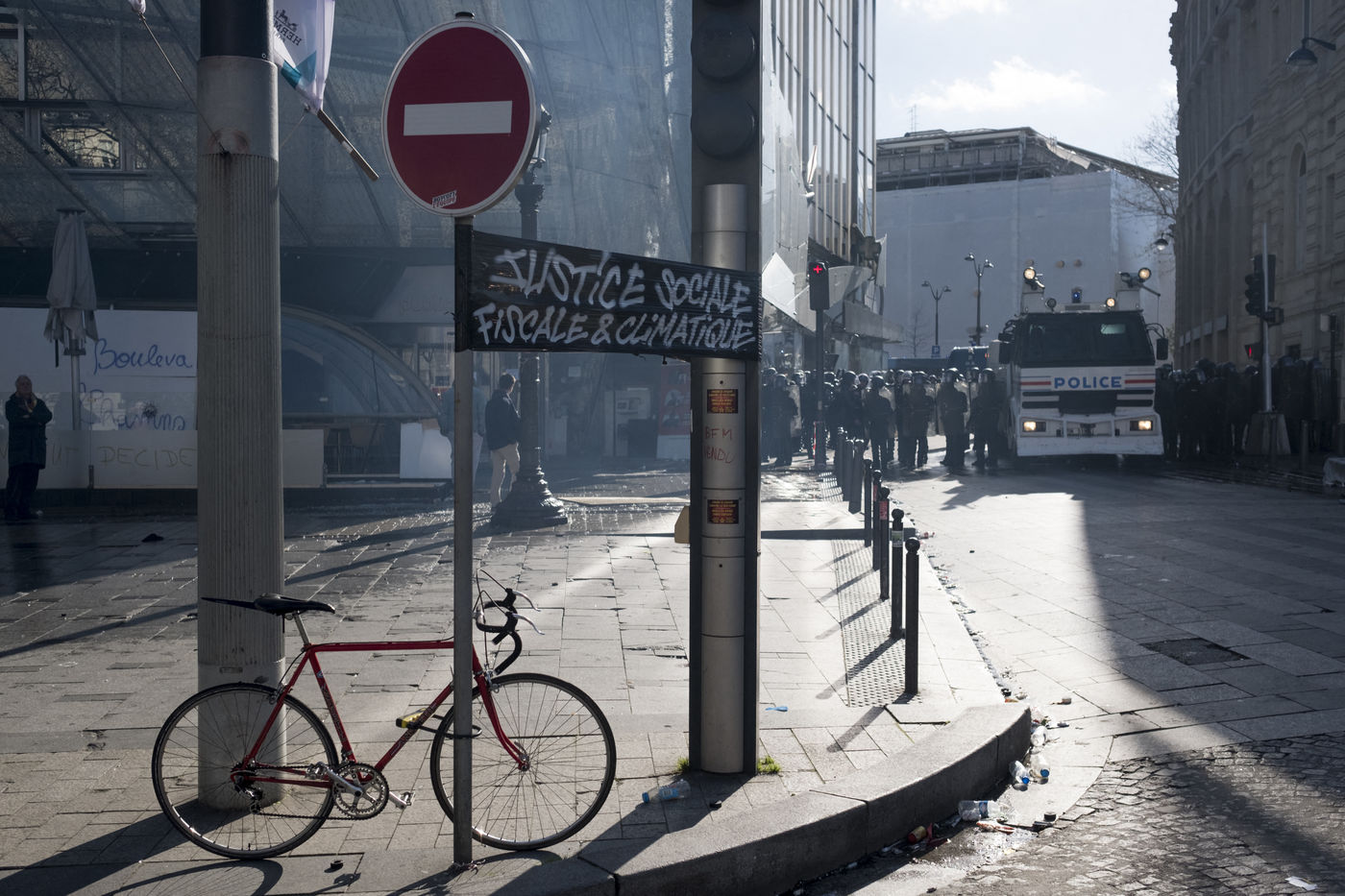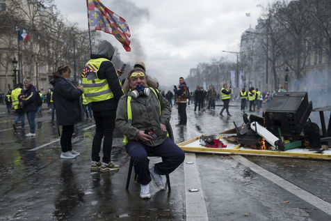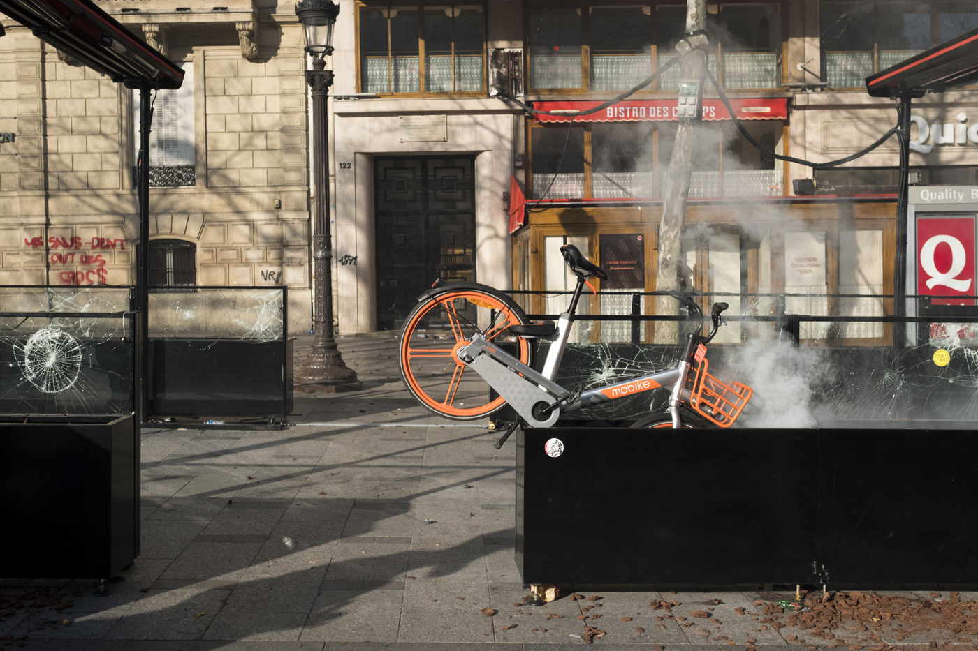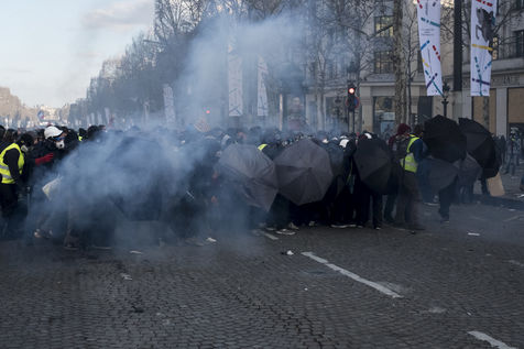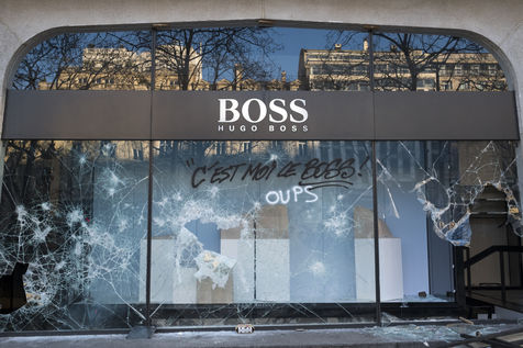 Paris, le 16 mars 2019. Pour les quatre mois du mouvement des Gilets Jaunes, et au lendemain de la fin du Grand Débat national voulu par le Président Macron, environ dix mille manifestants se sont retrouvés sur les Champs-Elysées et la Place de l'Etoile. Des affrontements ont rapidement éclaté au pied de l'Arc de Triomphe entre les forces de l'ordre et certains manifestants, dont des "Black Blocks", et ont duré jusqu'en fin de journée. De nombreuses boutiques et restaurants, dont le Fouquets, ont été vandalisés ou incendiés.