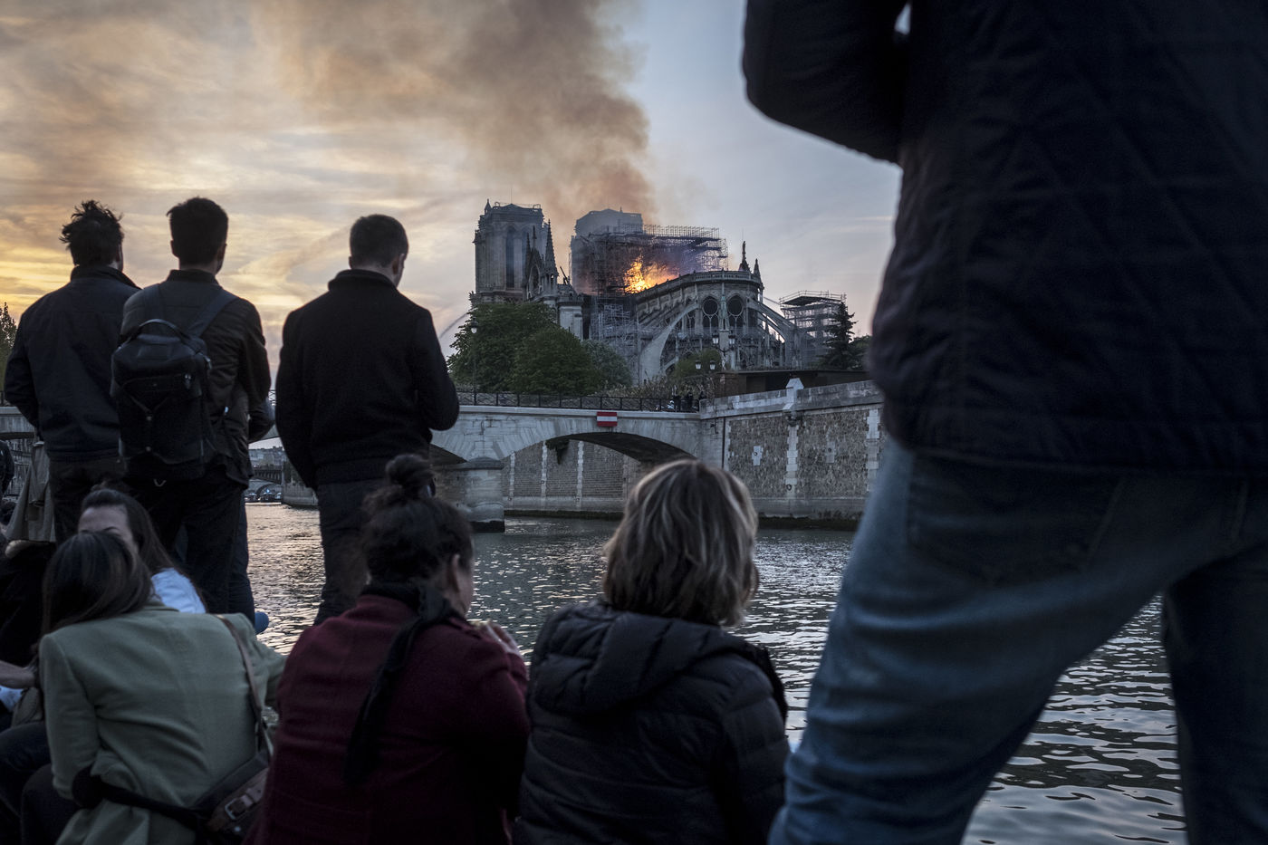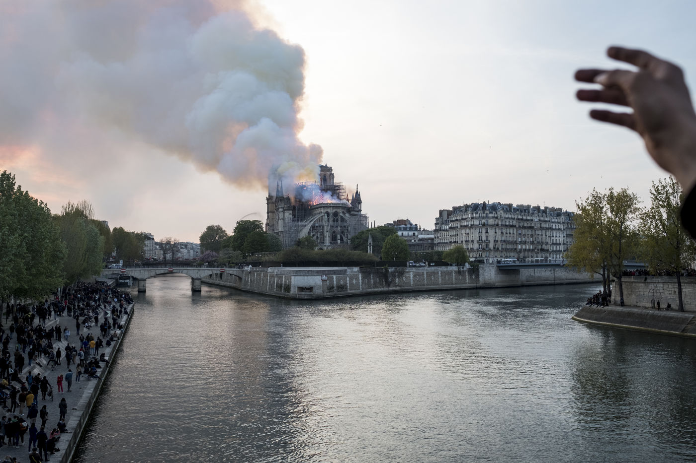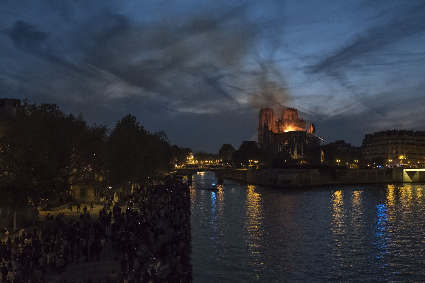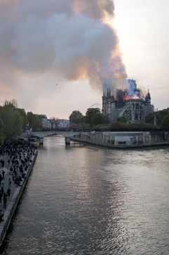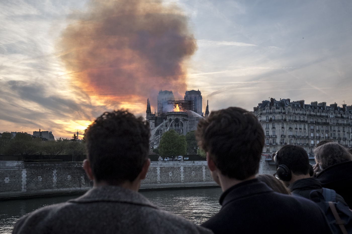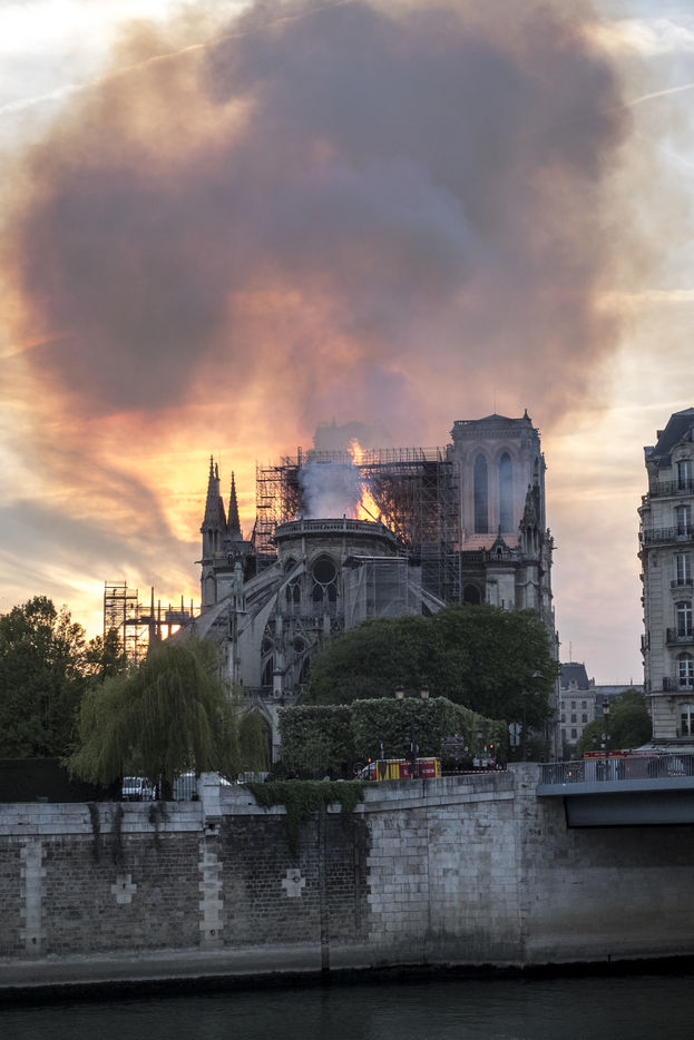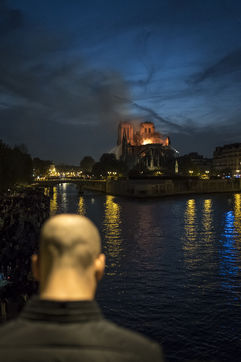 Paris, le 15 avril 2019. Un incendie s'est déclenché sous les combles du toit de Notre Dame de Paris, se propageant rapidement à l'ensemble de la charpente. Près de 500 pompiers lutteront jusque dans la nuit pour enrayer la propagation de l'incendie, sous l'oeil de centaines de parisiens et de touristes, sauvant ainsi un des monuments les plus emblématiques de Paris, vieux de plus de 800 ans.