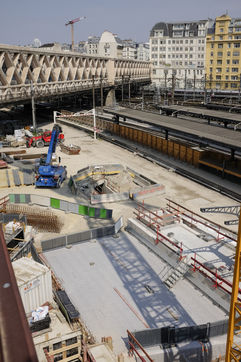 France, Paris 29/04/2022. The construction of the CDG Express, the train that will directly connect Roissy Charles De Gaulle airport and the Gare de l'Est in 20 minutes has begun. Like here on the platforms of Gare de l'Est which will be provided for the CDG Express trains.