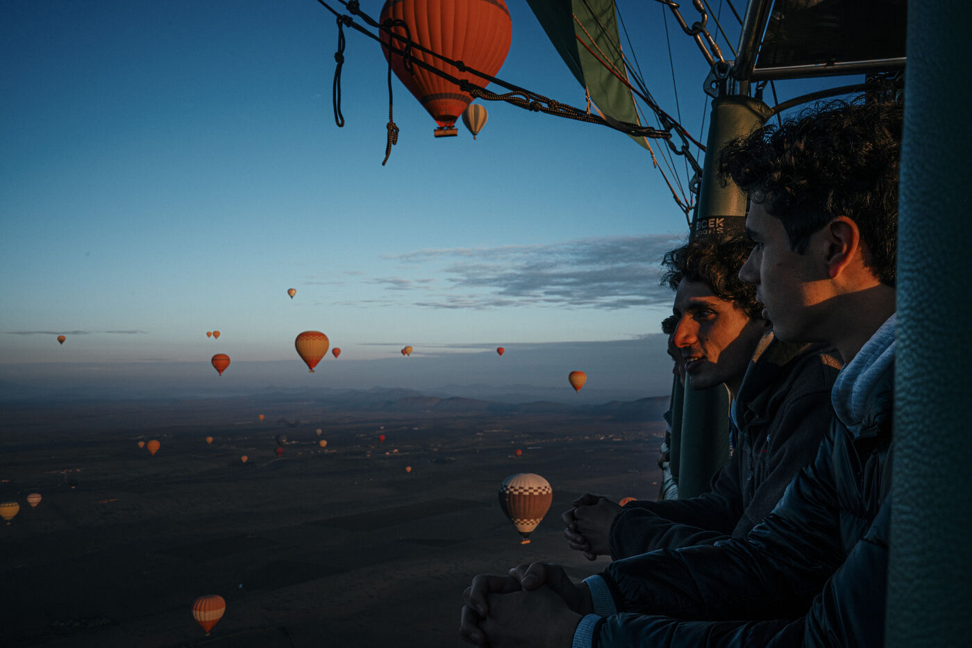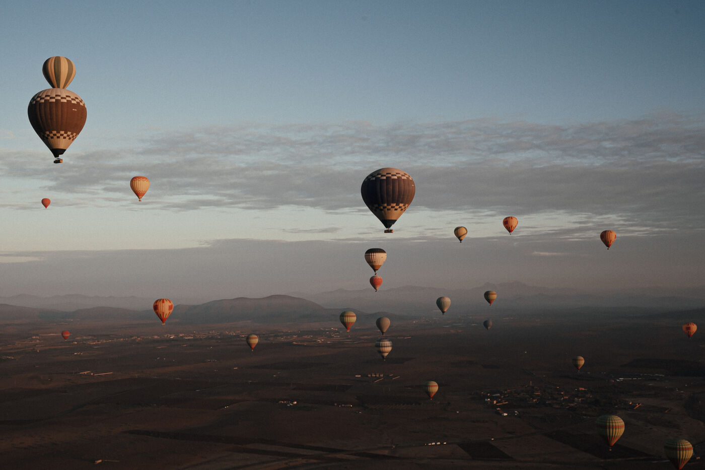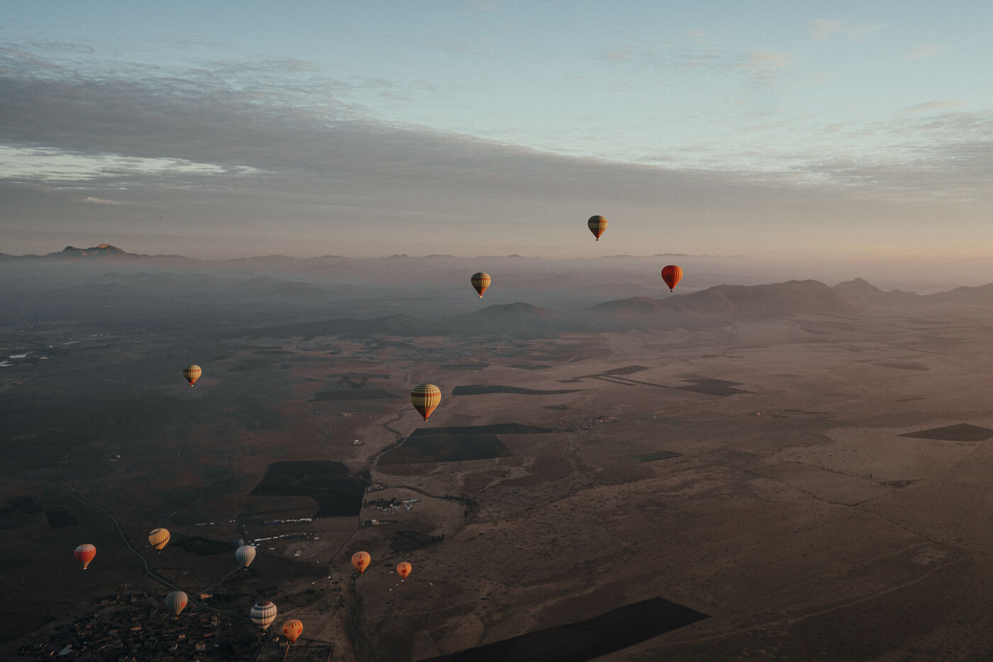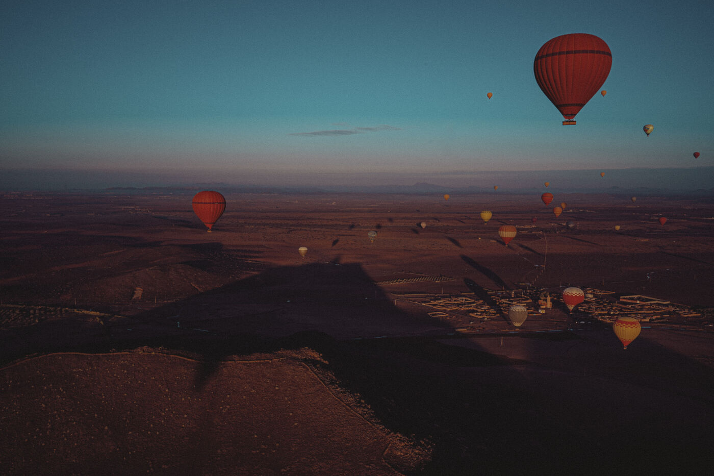 Hot air balloons fly over the desert at sunrise near Marrakech
