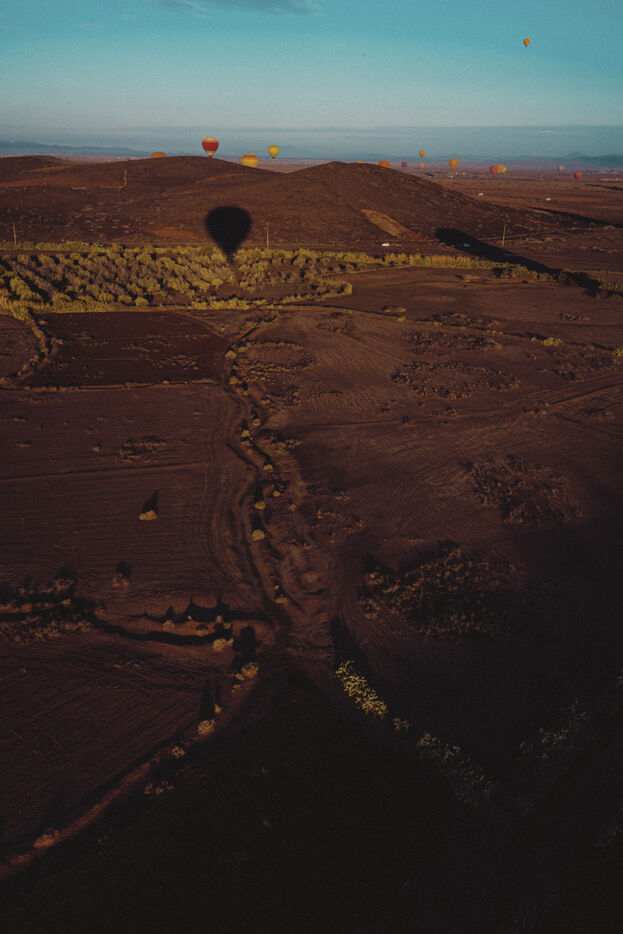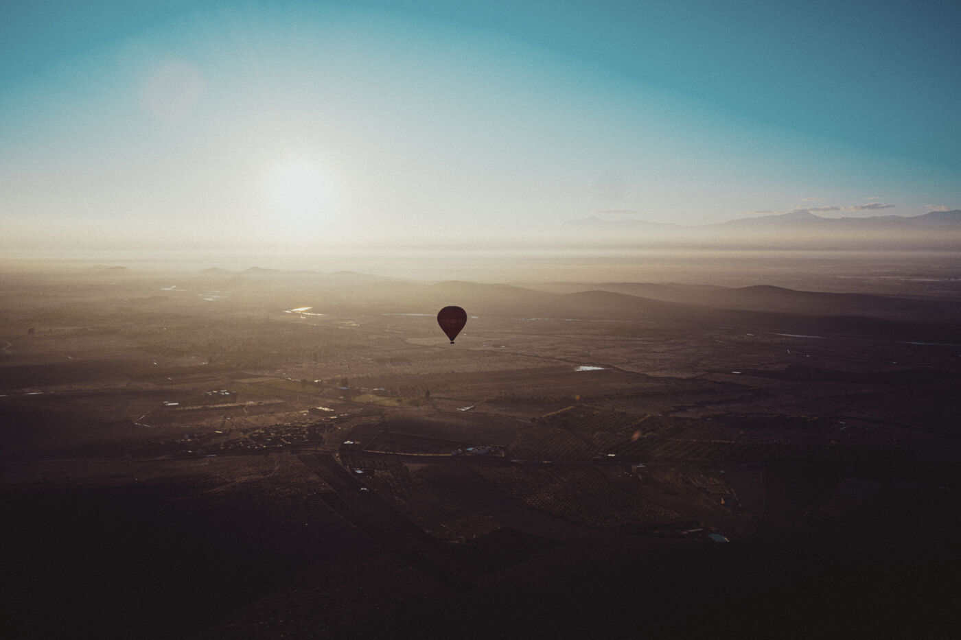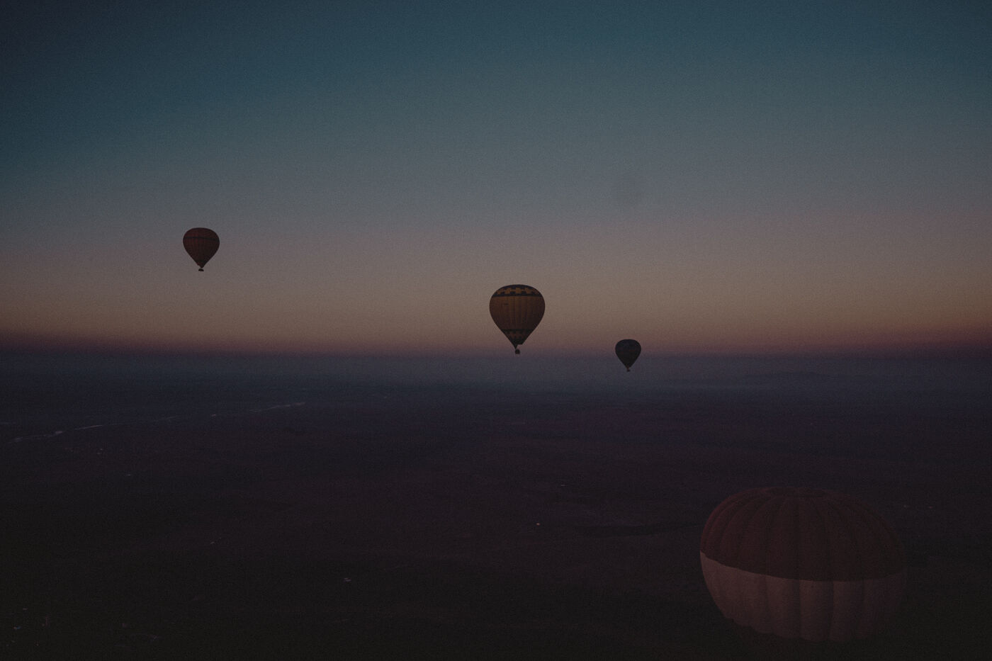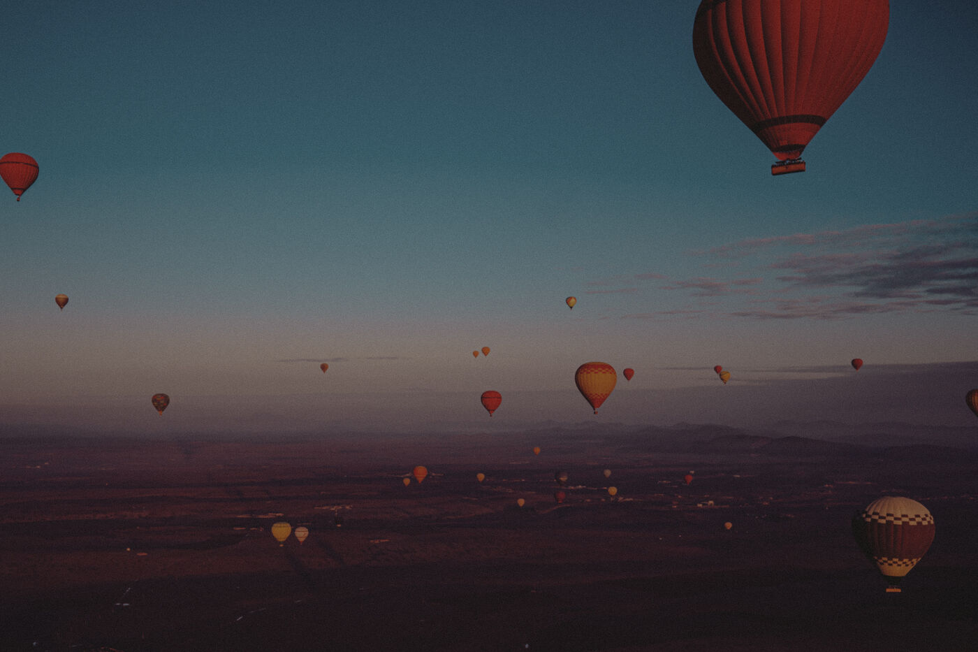 Hot air balloons fly over the desert at sunrise near Marrakech