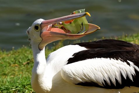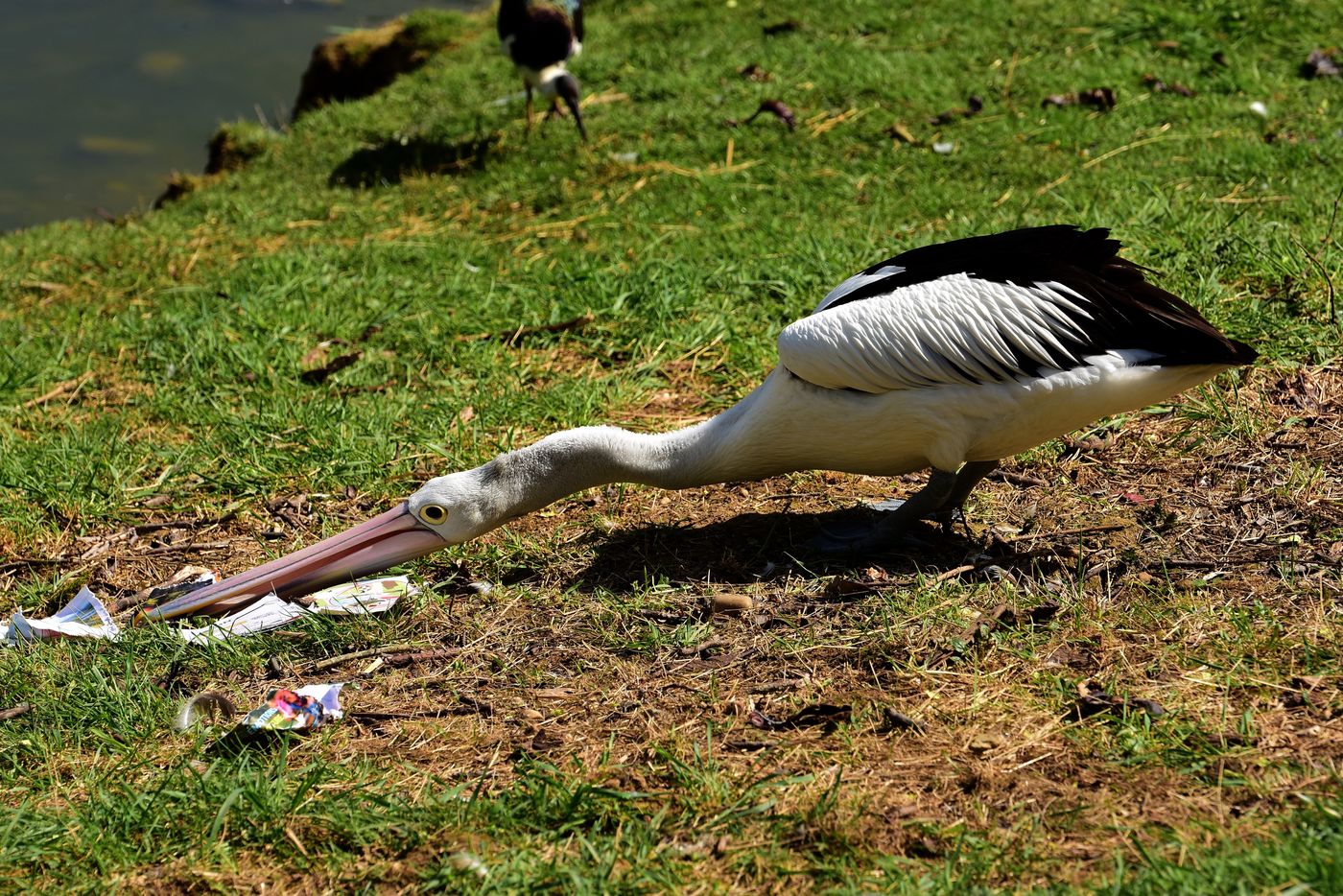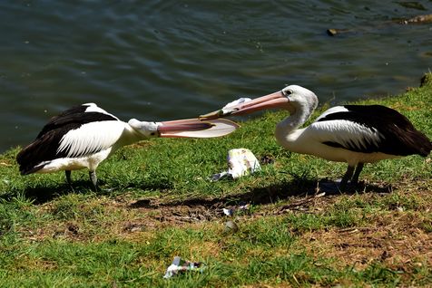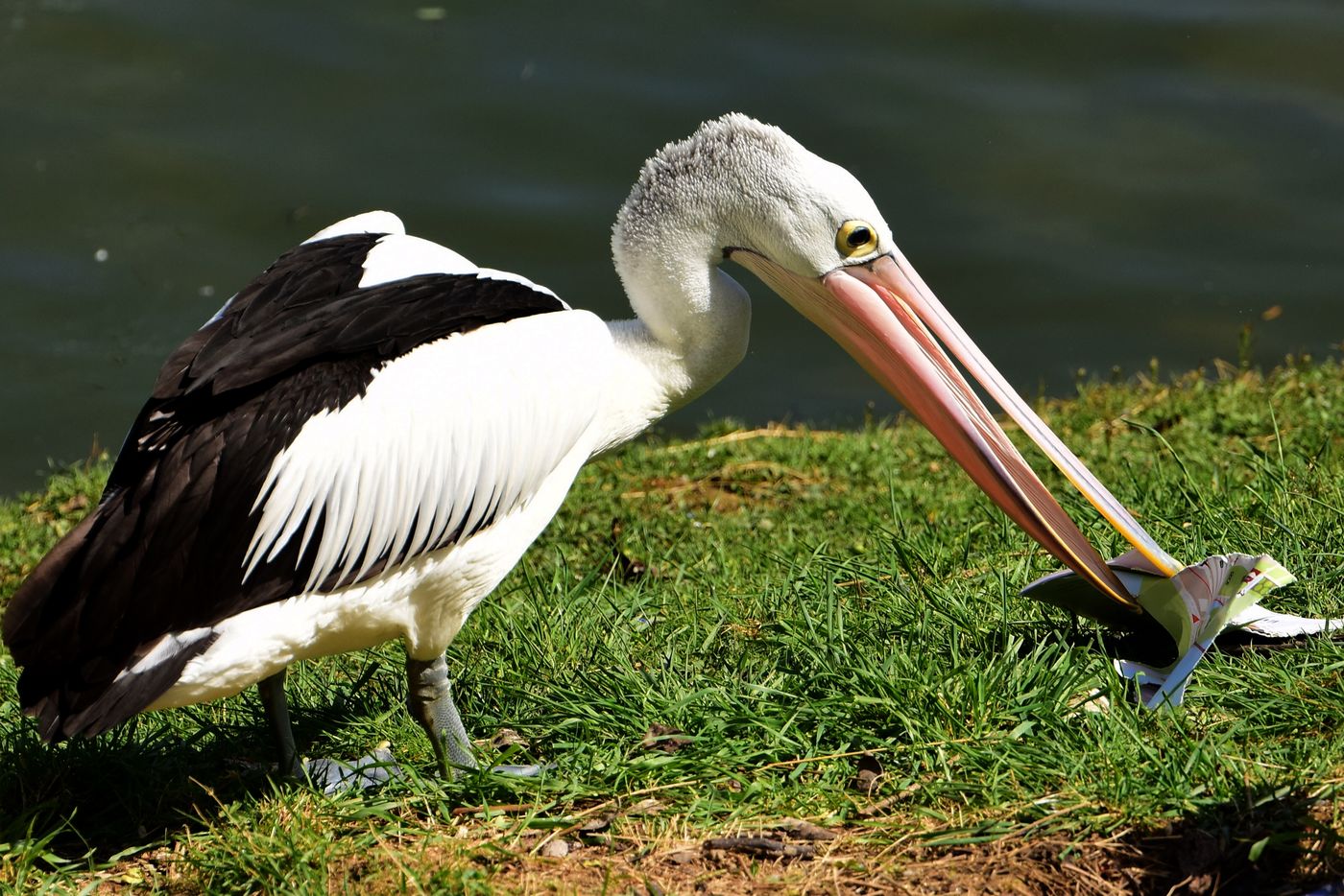 Spectacled Pelicans, Pelecanus Conspicillatus play at the edge of a lake and try to eat the map in paper format of the Bird Park in the Dombes.