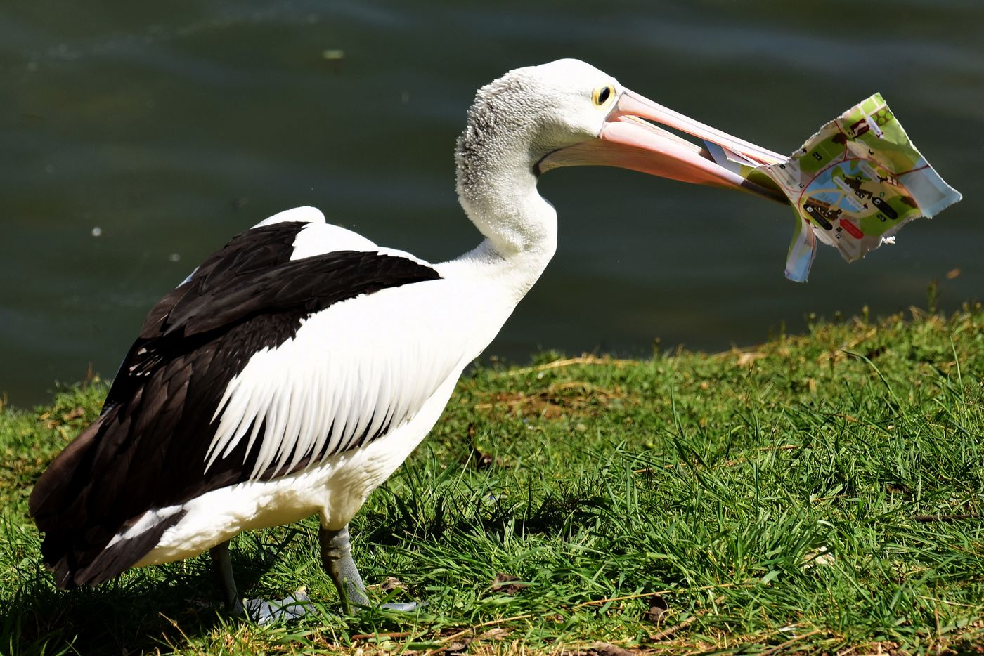 Des Pélicans à Lunettes, Pelecanus Conspicillatus jouent au bord d'un lac et essayent de manger un plan sous format papier du Parc des oiseaux dans les Dombes.