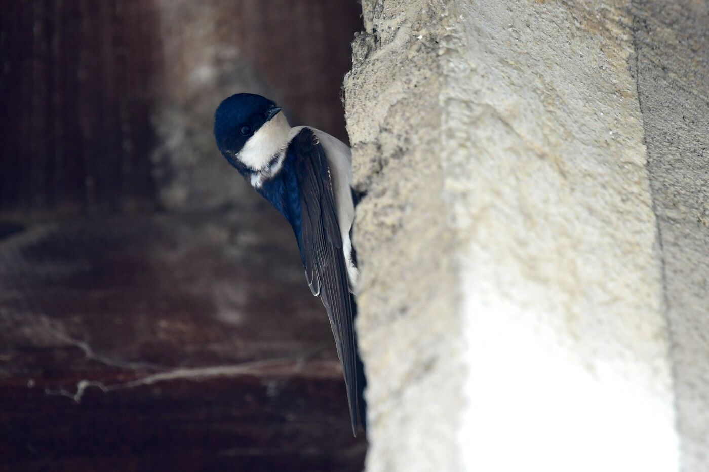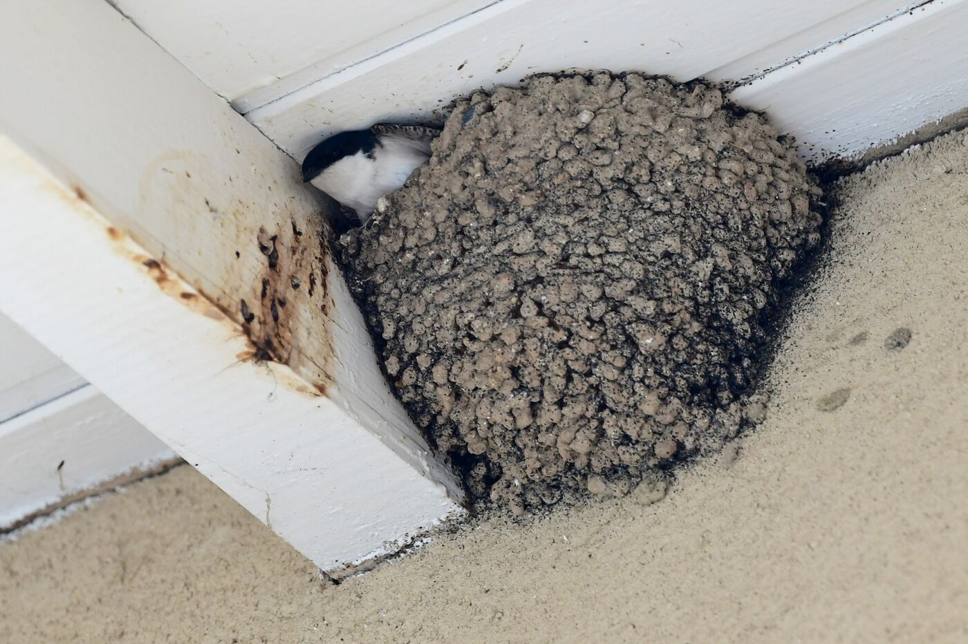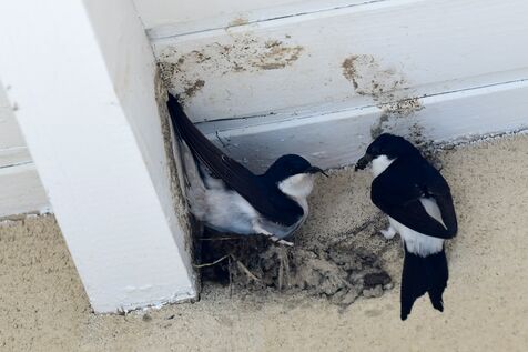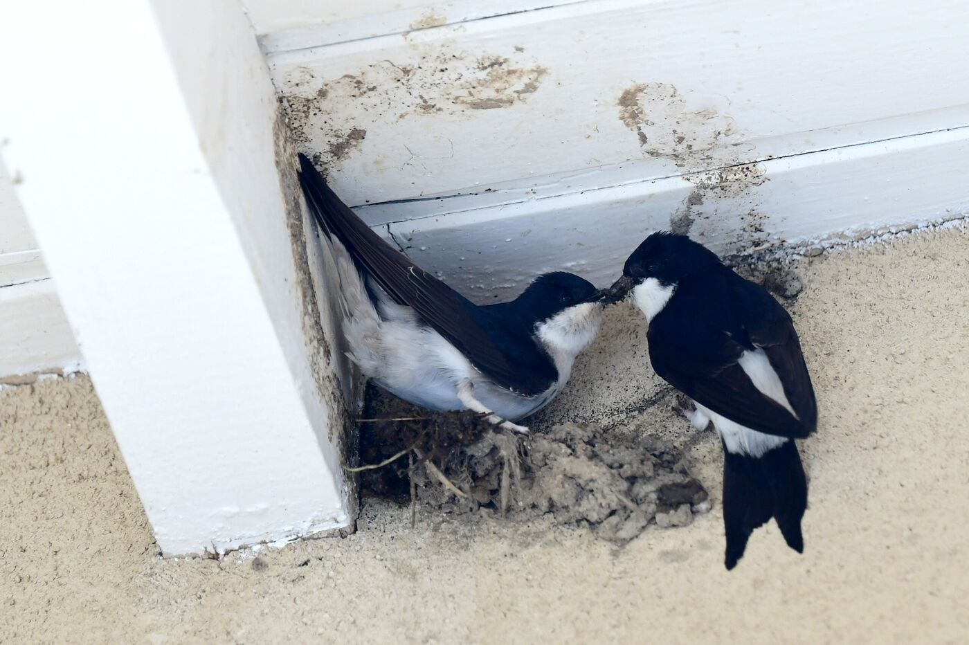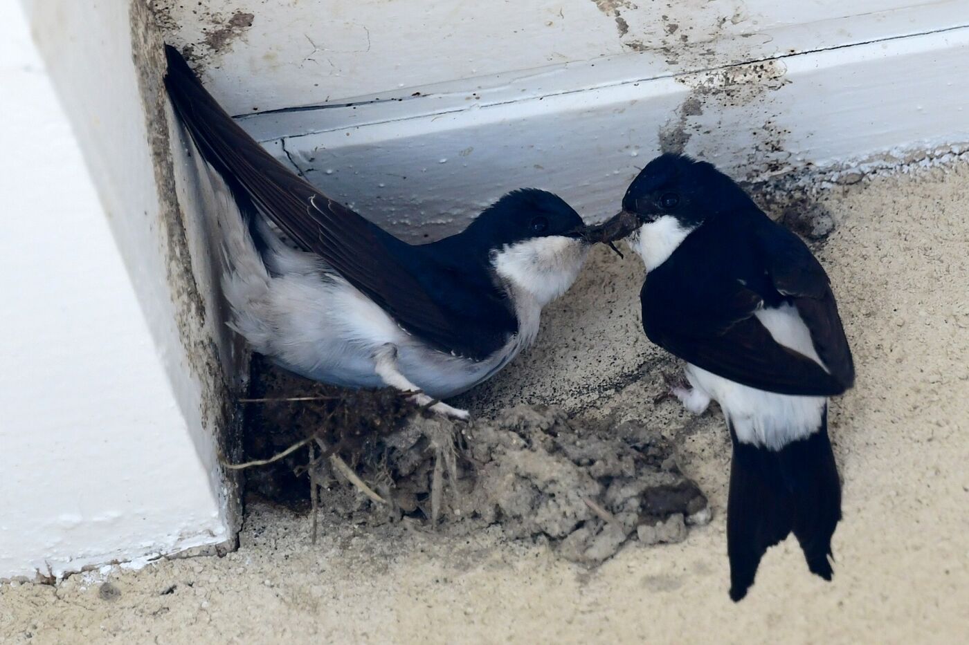 France, Veranne, 2025/05/08. A pair of house martins, Delichon urbicum, rebuilds a nest with a mud mixture on the exterior wall of a house in the village of Véranne in the Pilat Regional Natural Park, France. Photograph by Romain Doucelin / Hans Lucas.