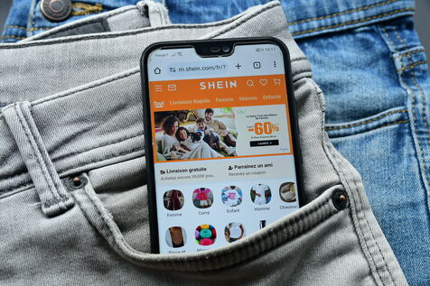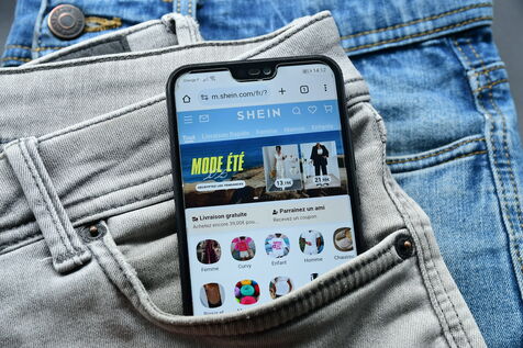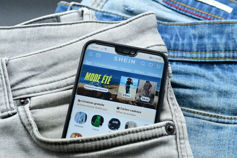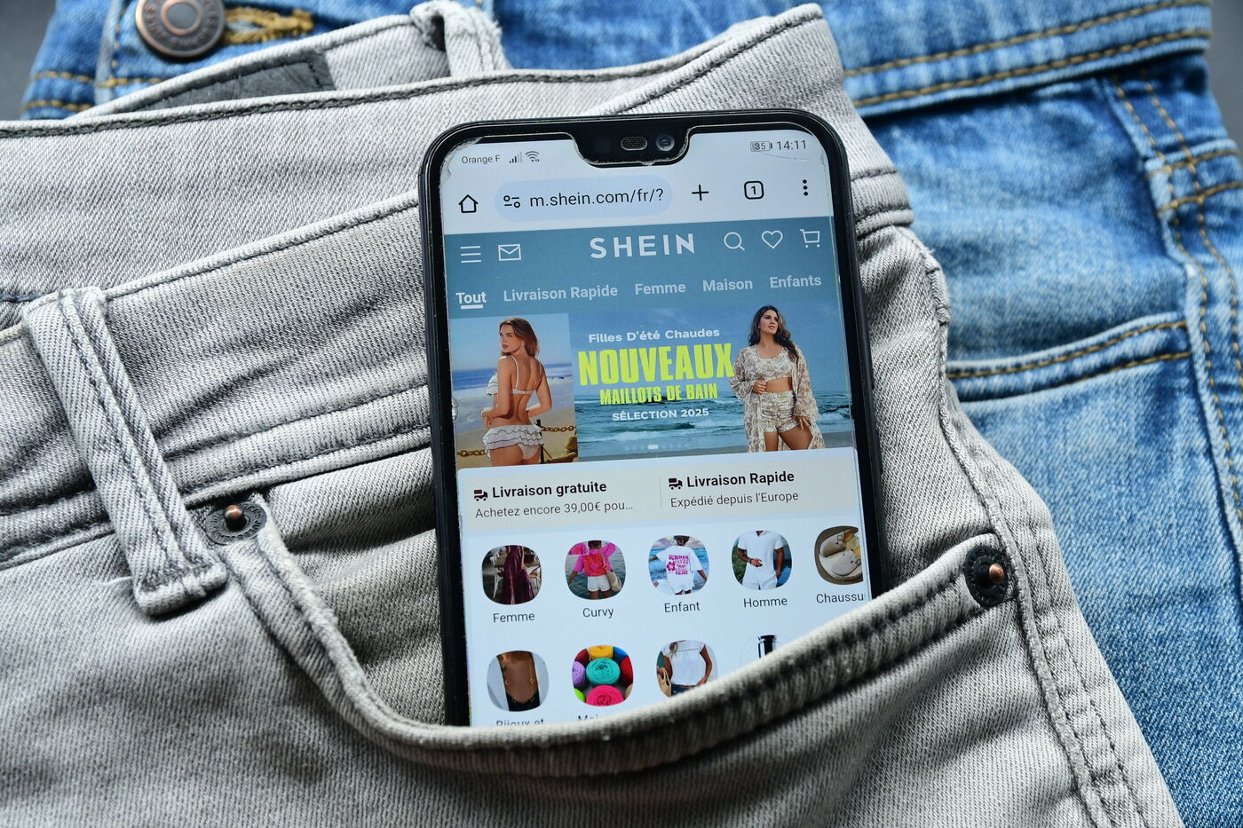 France, Veranne, 2025/06/02. Consultation site web marque de la fast fashion sur un telephone dans un jean. Photographie de Romain Doucelin / Hans Lucas.