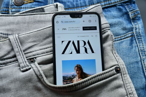 France, Veranne, 2025/06/02. Viewing the fast fashion brand's website on a phone while wearing jeans. Photograph by Romain Doucelin / Hans Lucas.