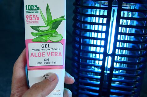 France, Clonas, 2025/07/03. Aloe vera gel and mosquito repellent. Photograph by Romain Doucelin / Hans Lucas.