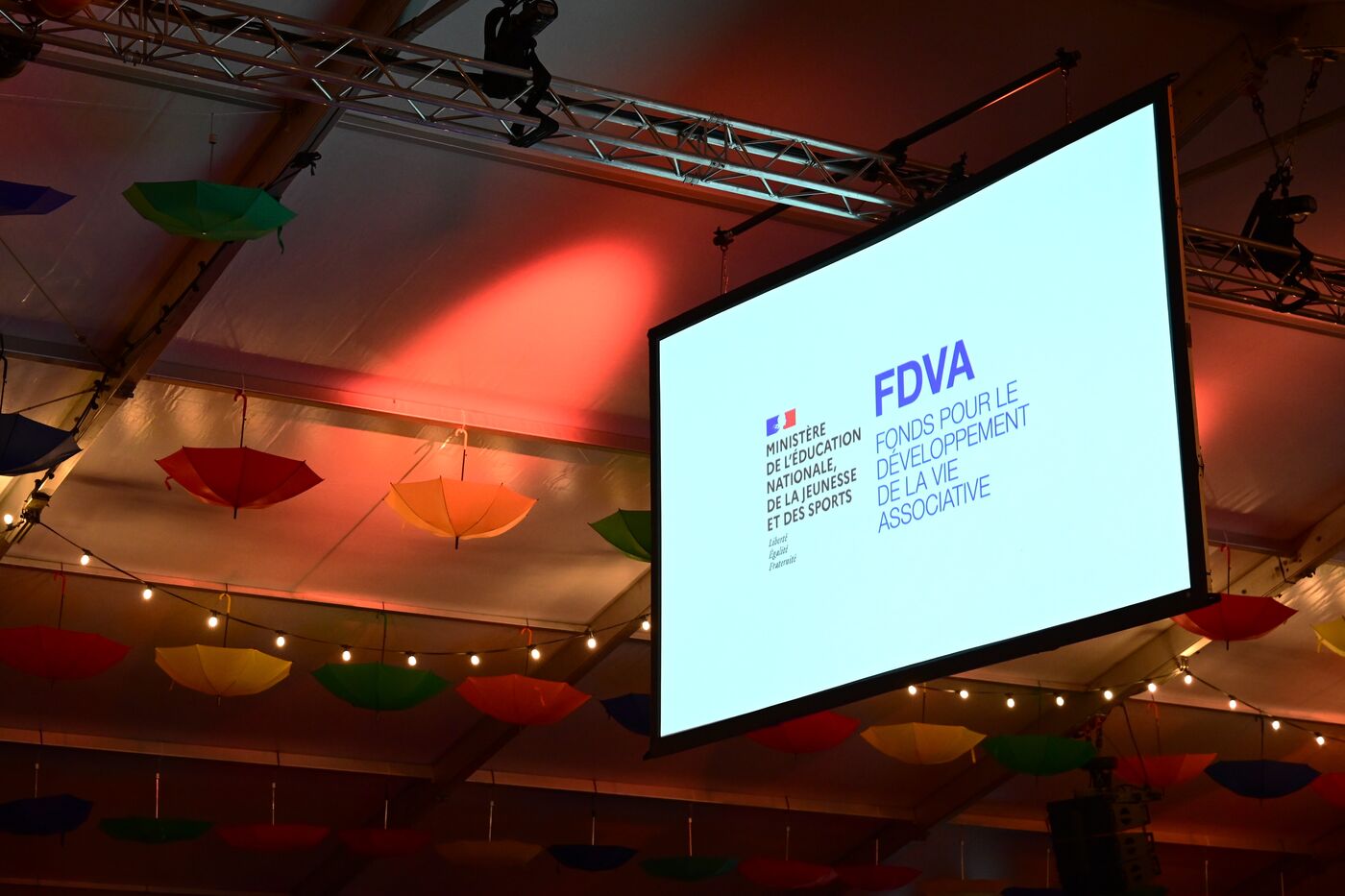 France, Beaujeu, November 2025. Poster for the fund for the development of community life, from the Ministry of National Education, Youth and Sports, during the Beaujeu Sarmentelles Festival. Photograph by Romain Doucelin / Hans Lucas.