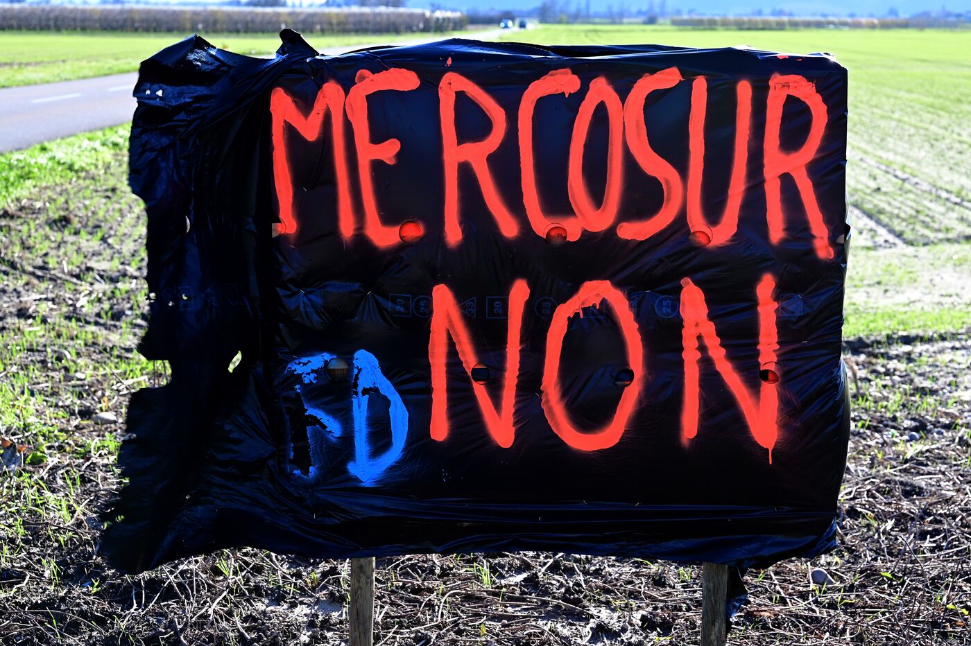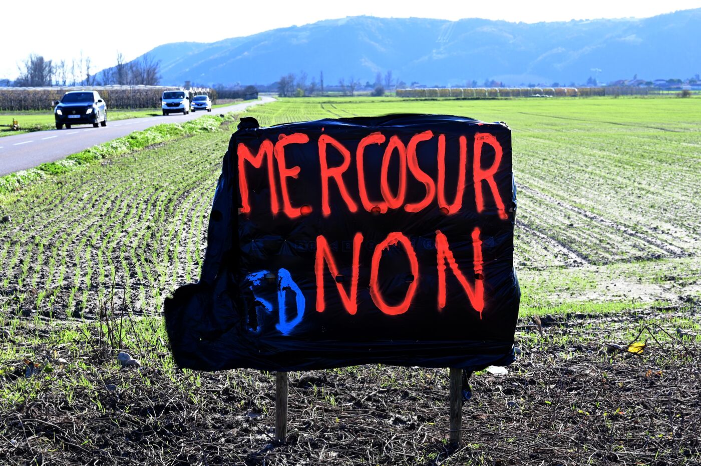 France, Salaise sur sanne, 2025/12/09. Banderole non au Mercosur. Zone de libre echange de plusieurs pays. Photographie de Romain Doucelin / Hans Lucas.