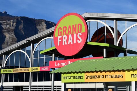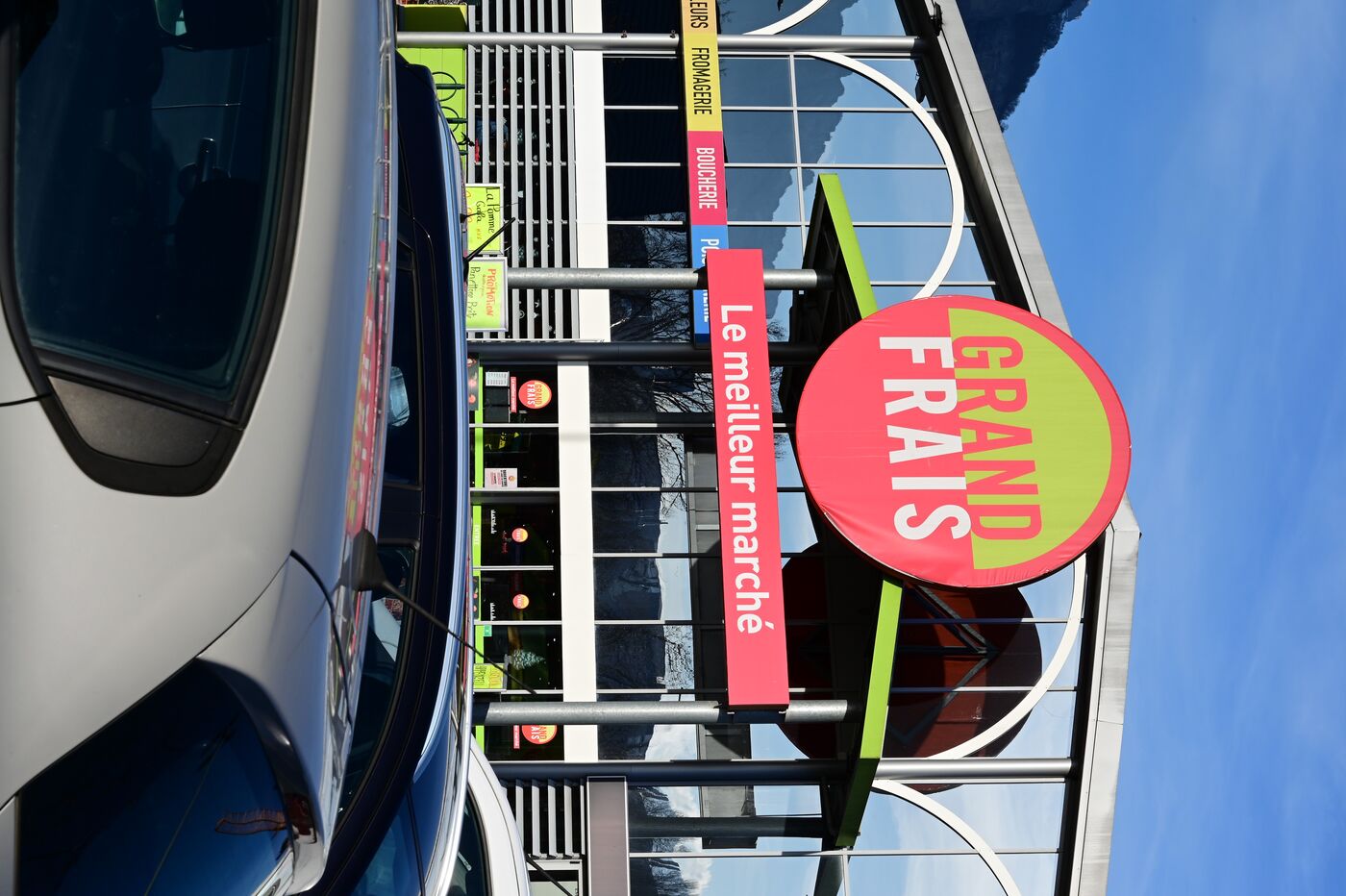 France, Crolles, 2025/12/11. Enseigne de supermarche Grand Frais en Isere. Photographie de Romain Doucelin / Hans Lucas.