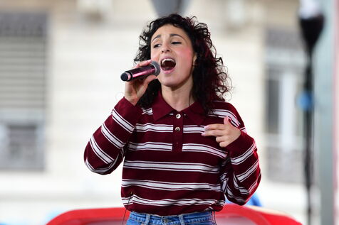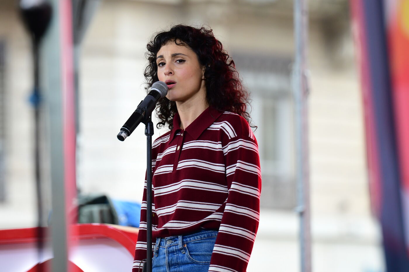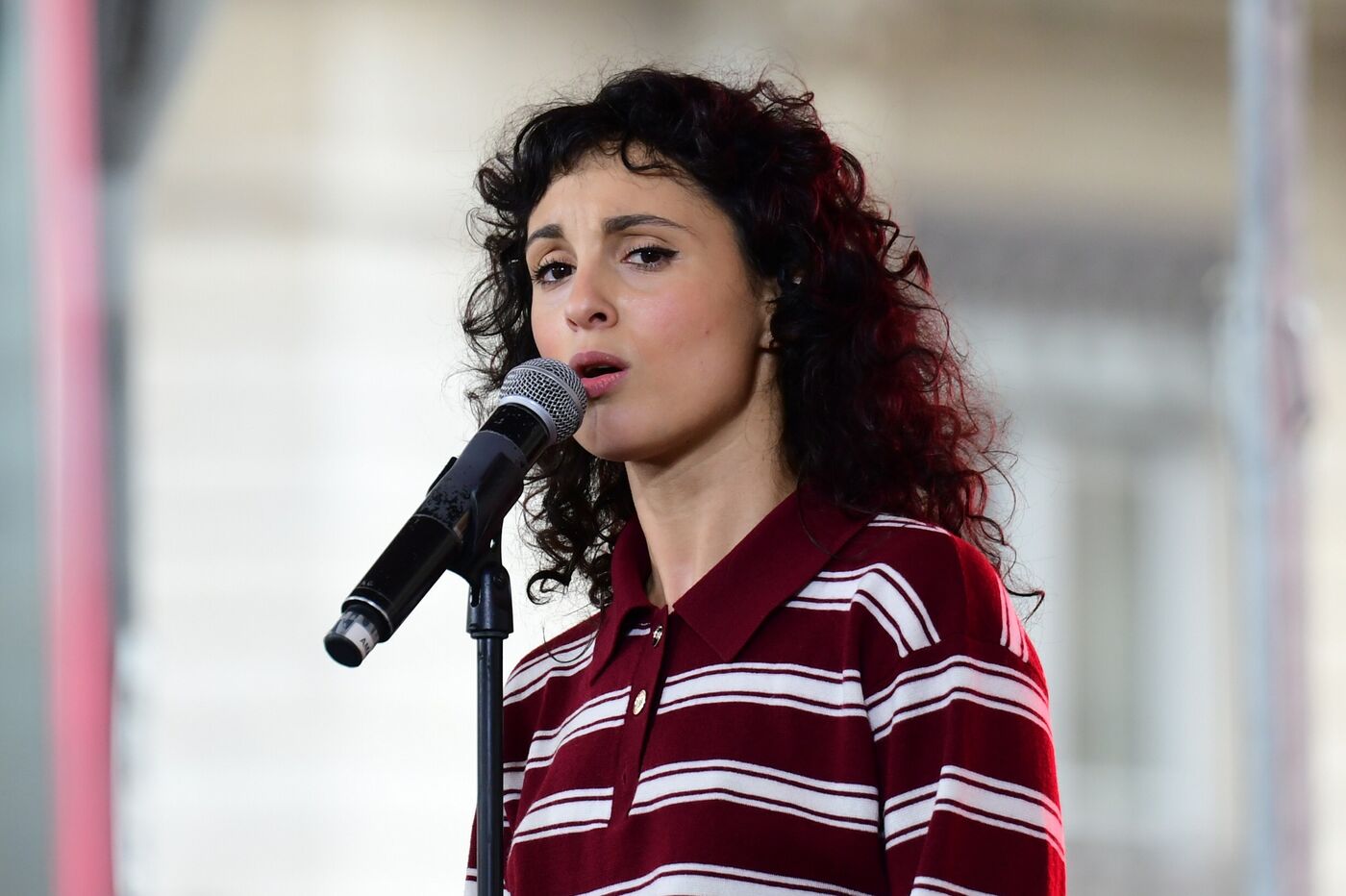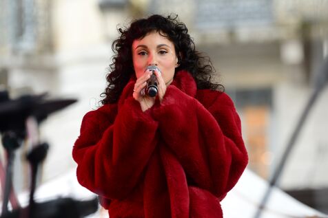 France, Lyon, 2025/12/20. La chanteuse Barbara Pravi chante pour evenement solidaire On Buche Pour Eux, sur la place de la republique. Concert en direct sur la radio scoop. Photographie Romain Doucelin/ Hans Lucas.