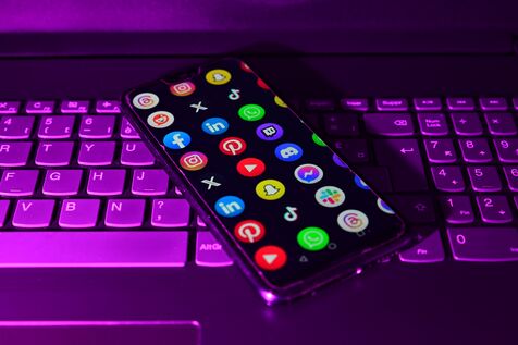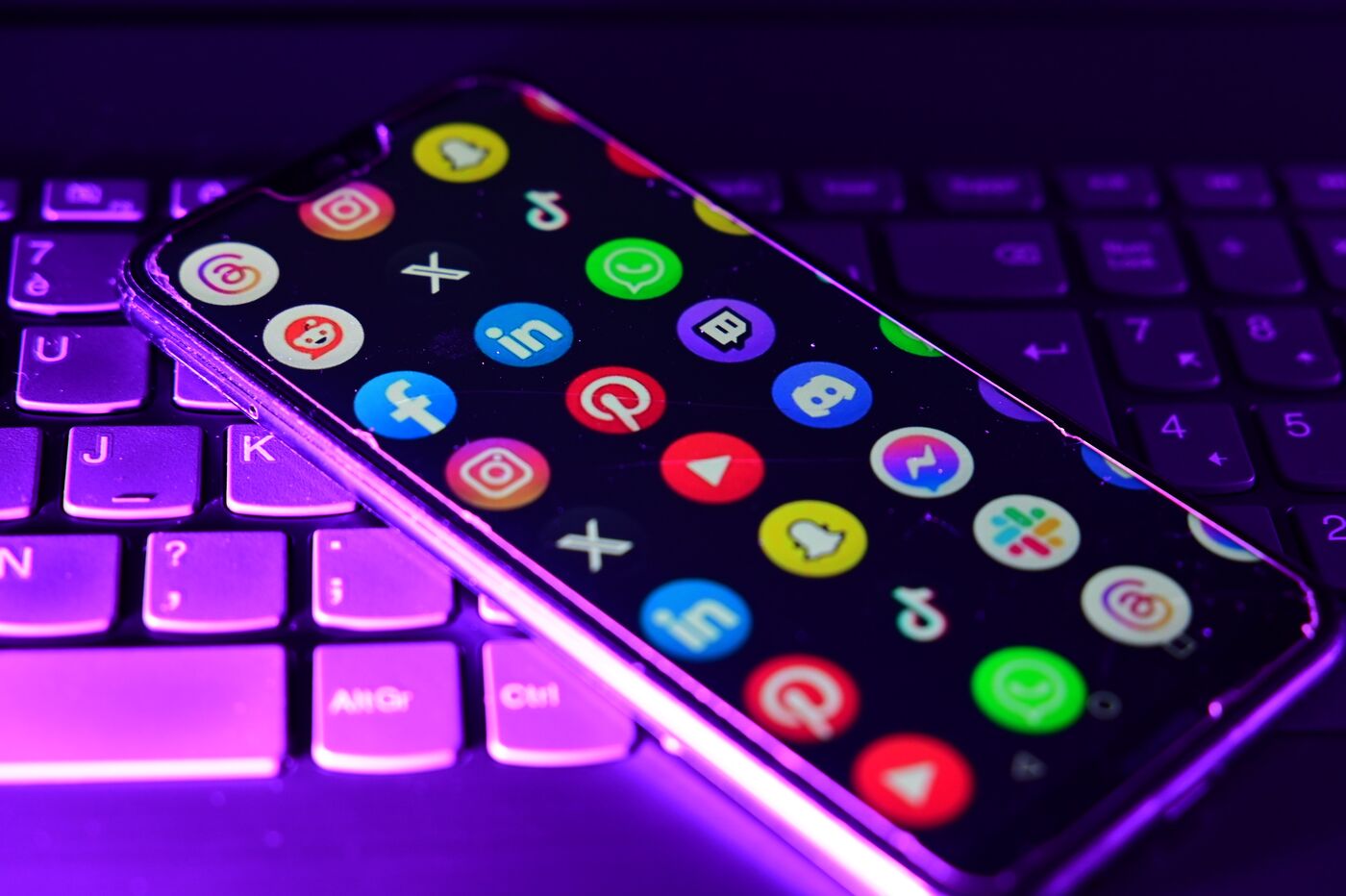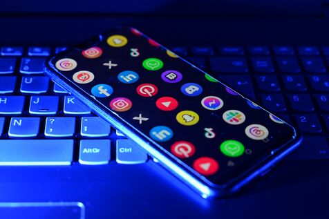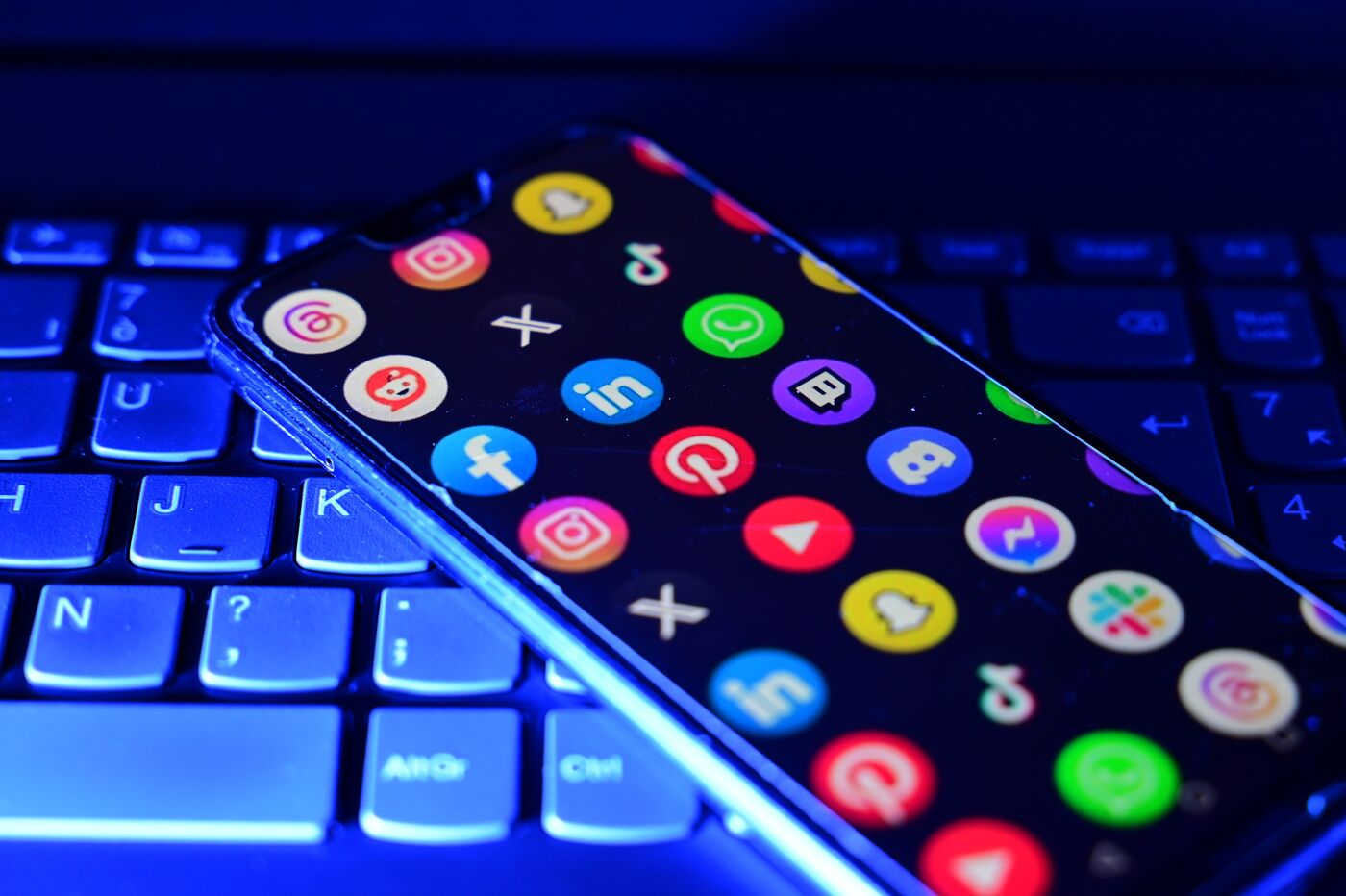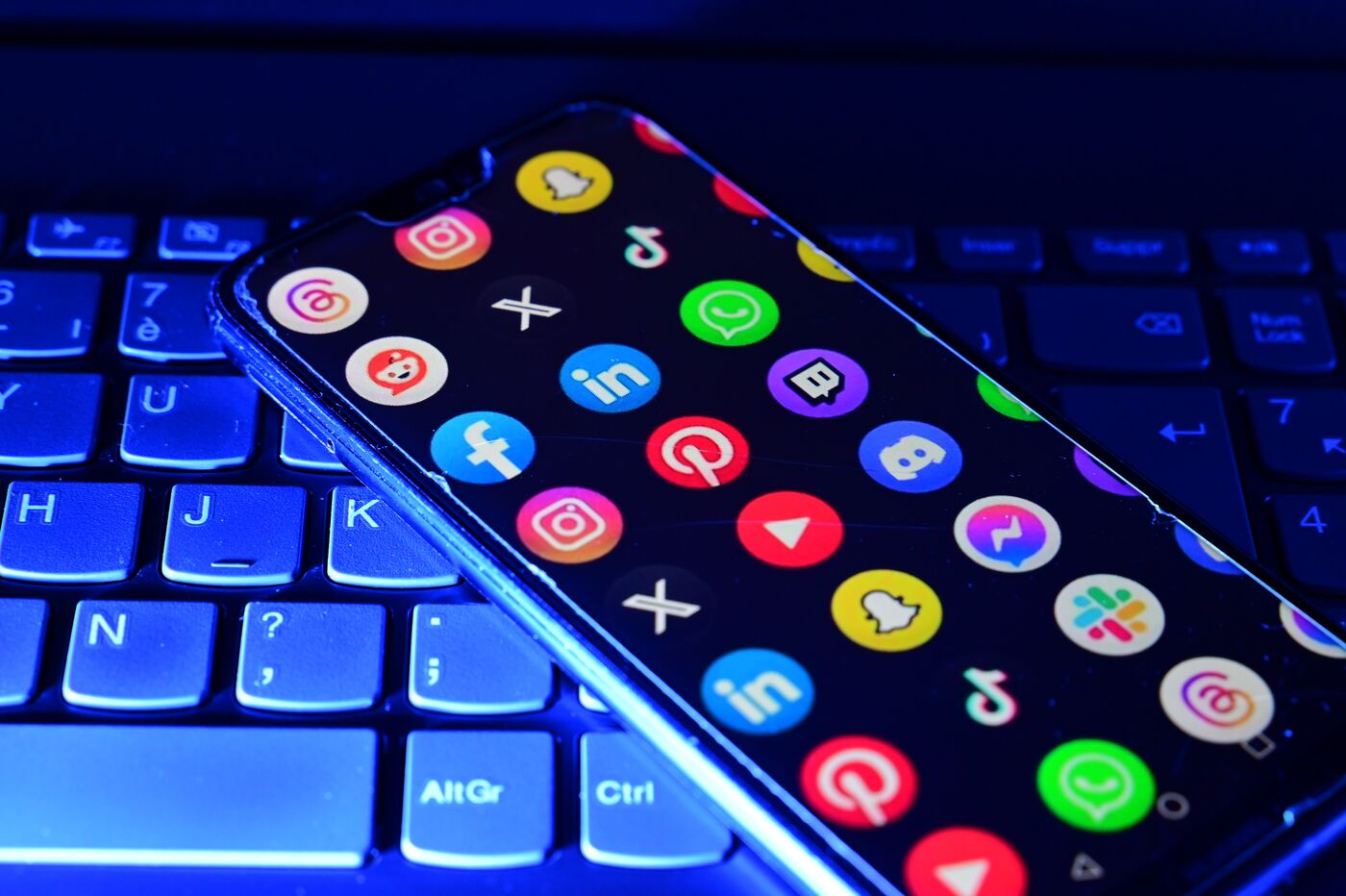 France, Veranne, January 1, 2026. Photomontage of several social networks on a phone. Illustration of the ban on social media for minors under 15 in France. Photograph by Romain Doucelin / Hans Lucas.