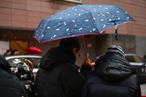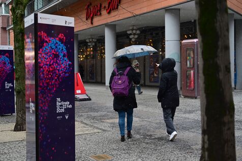 Germany, Berlin, February 13, 2026. People brave the rain and cold with umbrellas and warm clothing in Berlin in February. Photograph by Romain Doucelin / Hans Lucas.