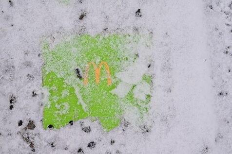 Allemagne, Berlin, 2026/02/17. Emballage en carton sur le sol du restaurant McDonalds recouvert de neige. Photographie de Romain Doucelin / Hans Lucas.