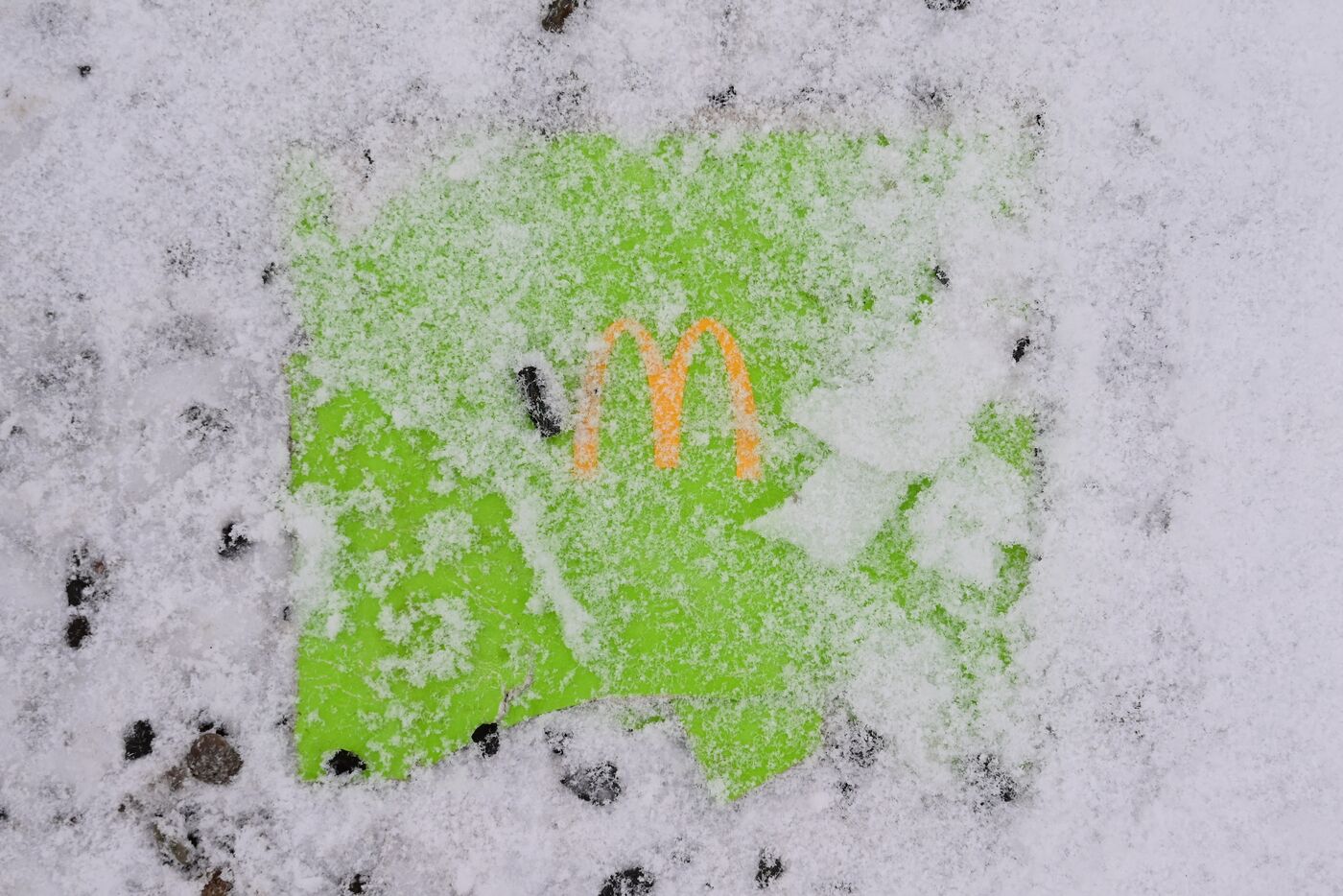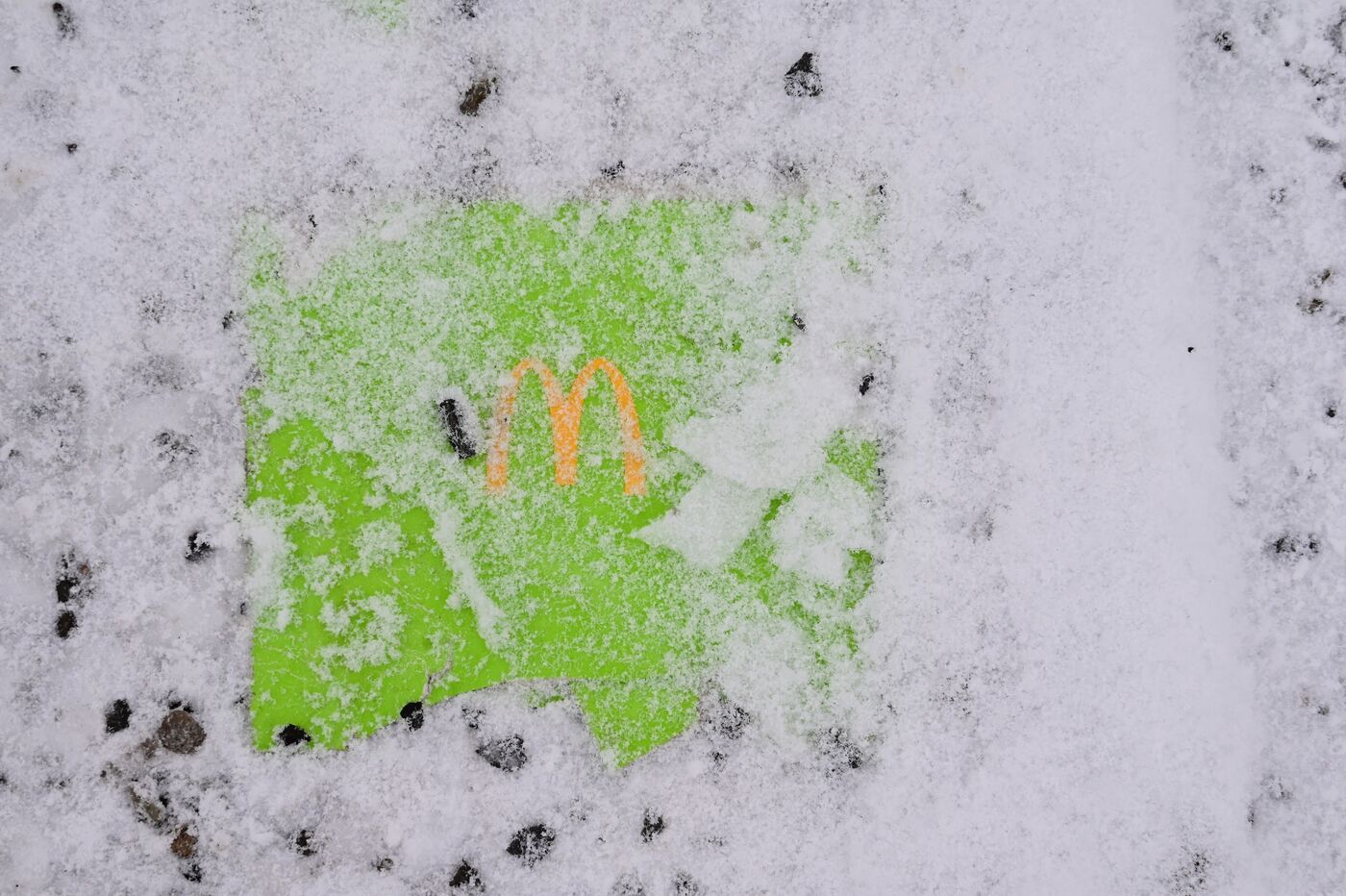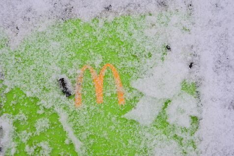 Germany, Berlin, February 17, 2026. Cardboard packaging on the snow-covered floor of a McDonald s restaurant. Photograph by Romain Doucelin / Hans Lucas.