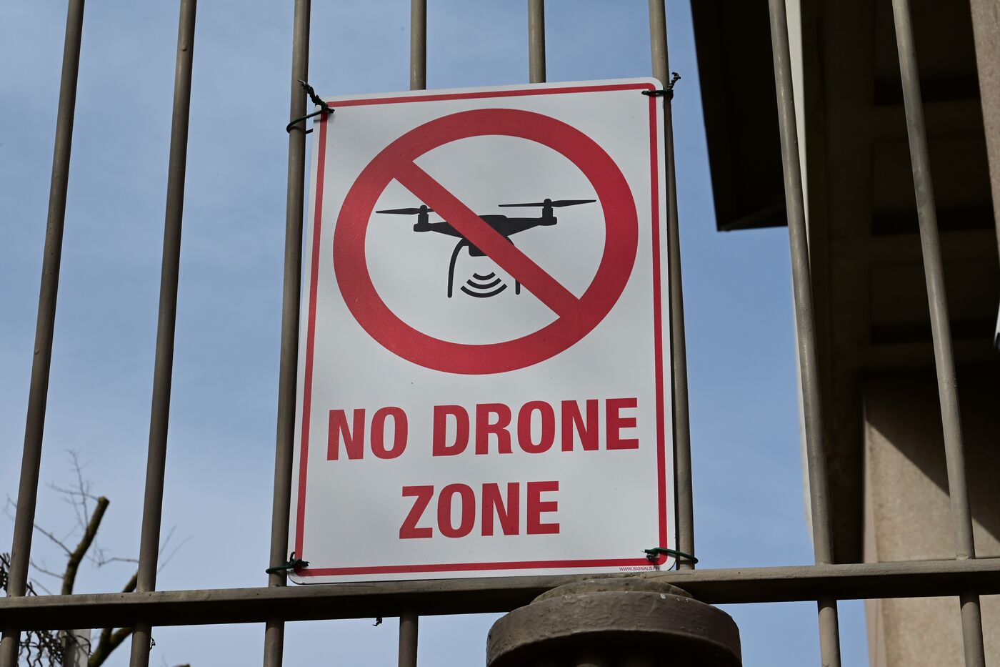 France, Lyon, March 6, 2026. Sign prohibiting drone flights around the Fourviere Tower in Lyon. Photograph by Romain Doucelin / Hans Lucas.