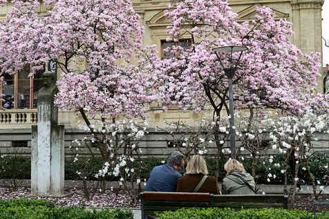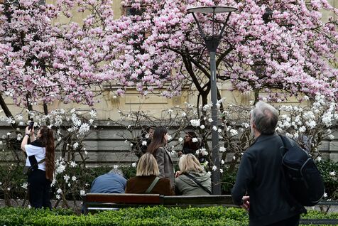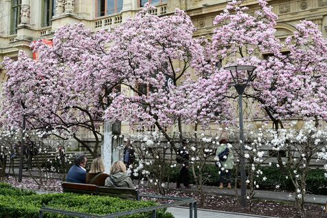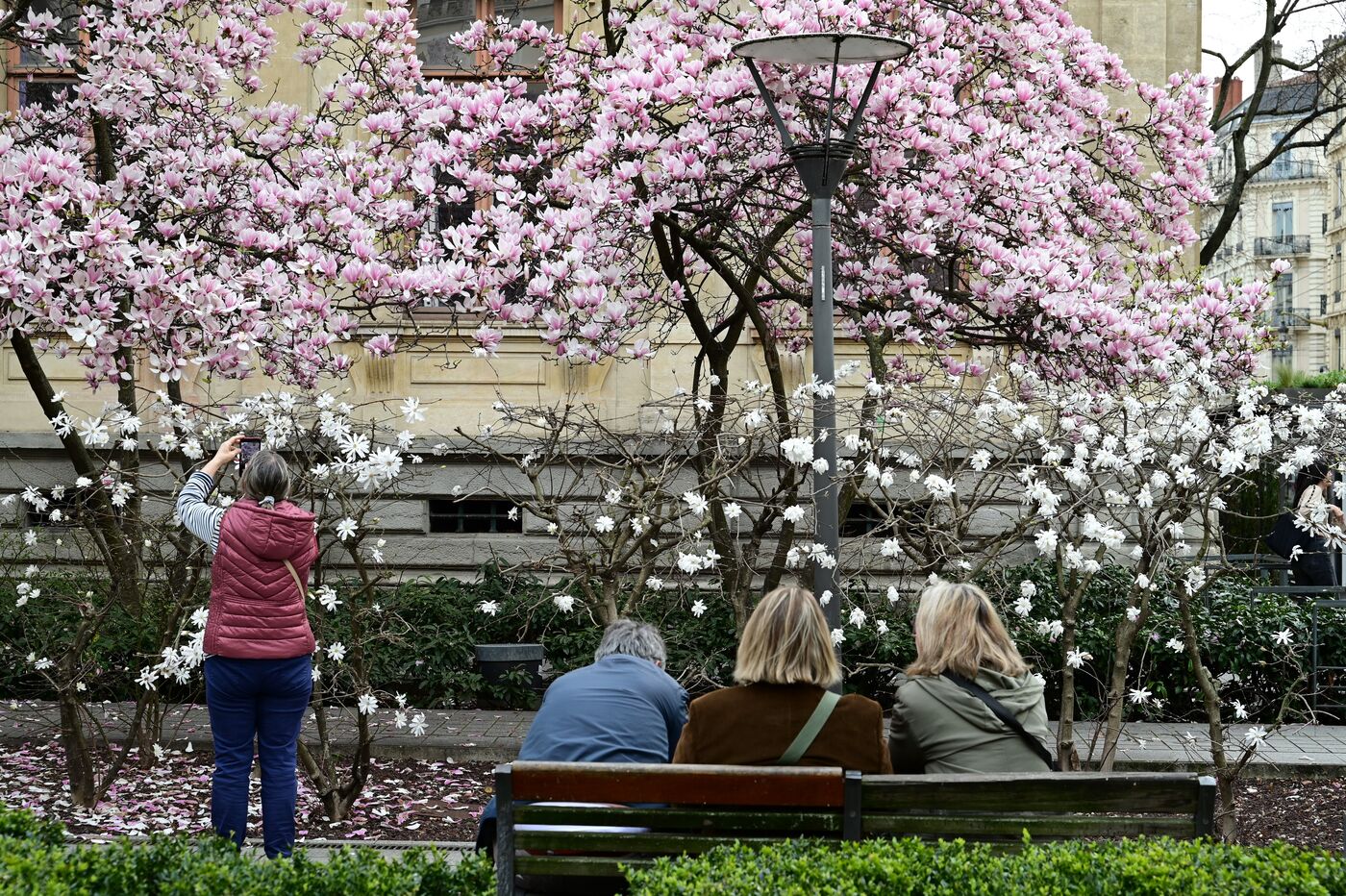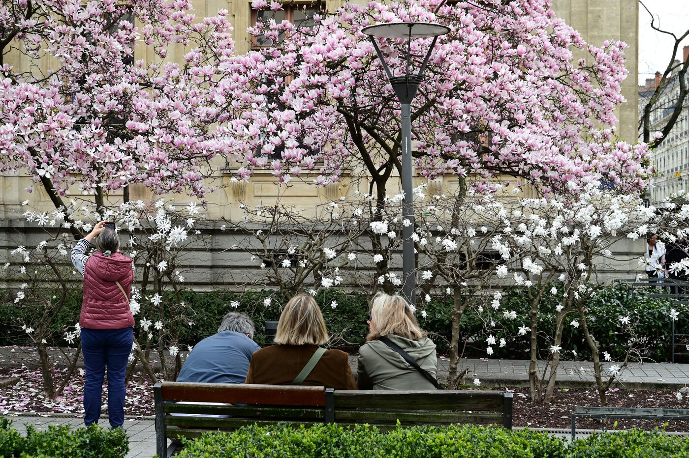 France, Lyon, March 6, 2026. People in front of a magnolia tree and spring flowers in the Place du Palais de la Bourse in Lyon. Photograph by Romain Doucelin / Hans Lucas.