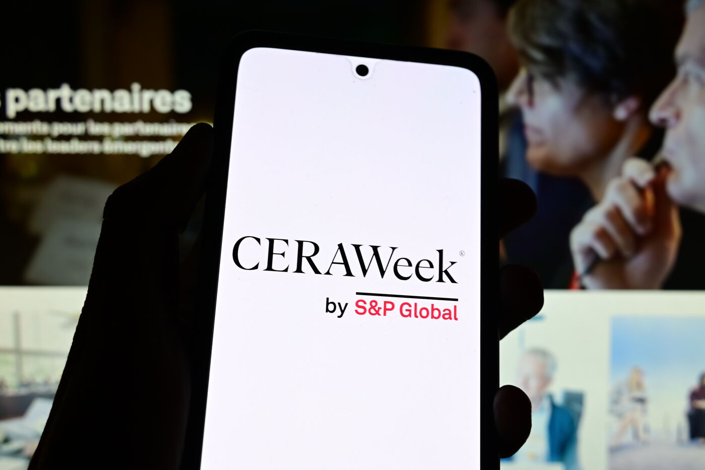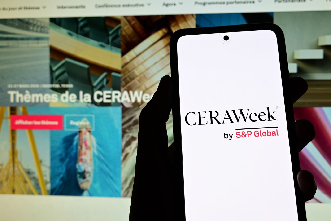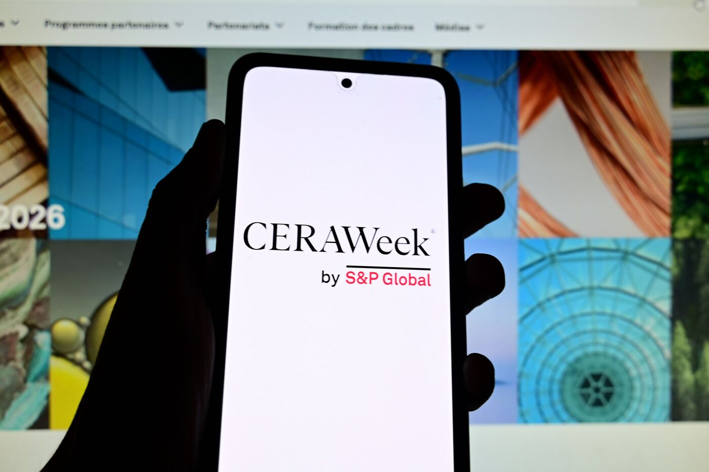 France, Veranne, March 24, 2026. CeraWeek annual energy conference organized by S&P Global. Photomontage. Photograph by Romain Doucelin / Hans Lucas.
