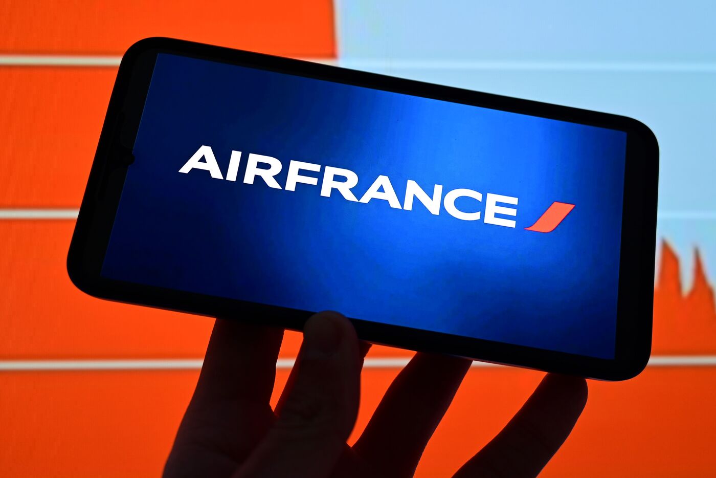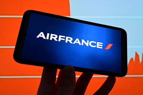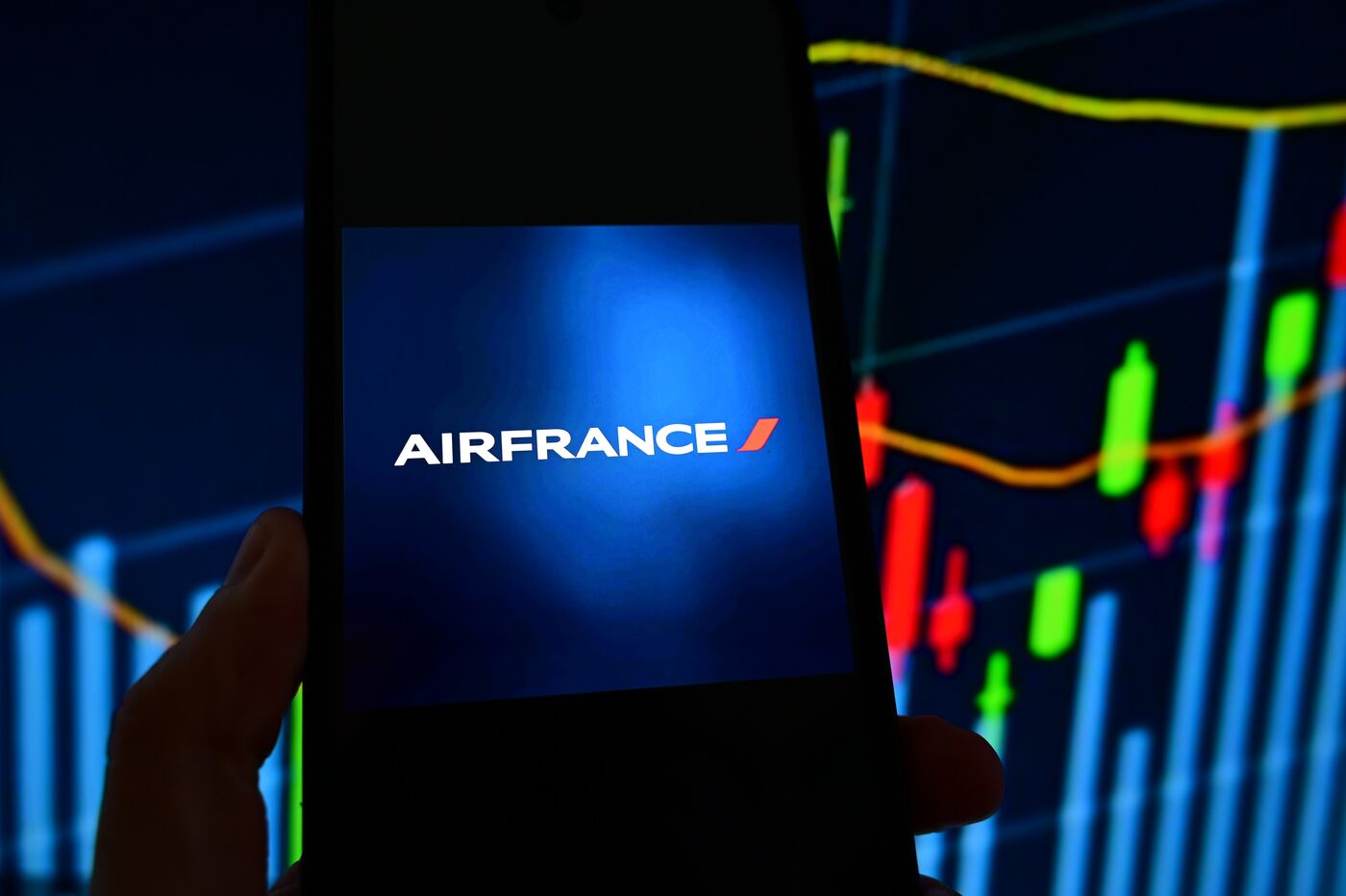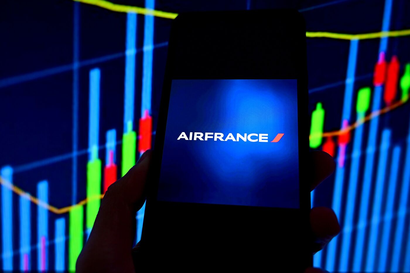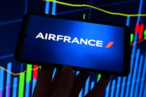France, Veranne, April 2, 2026. Air France airline logo and stock market index in the background. Photomontage. Photograph by Romain Doucelin / Hans Lucas.