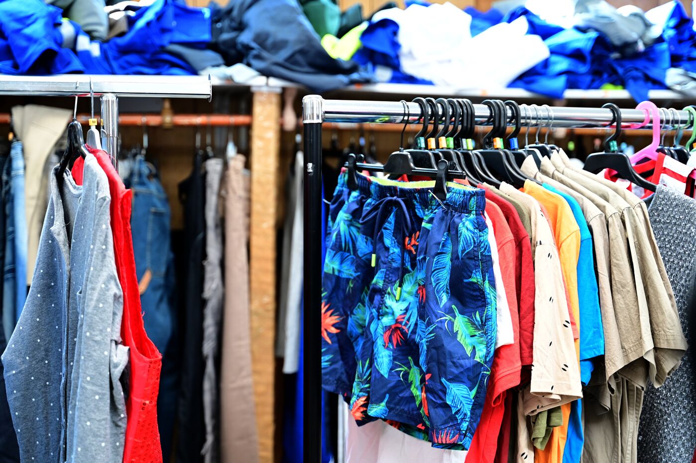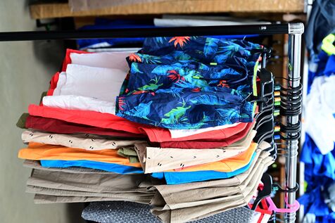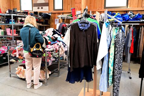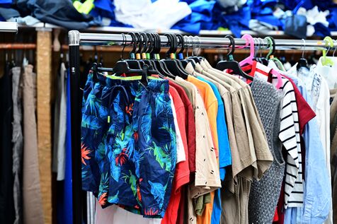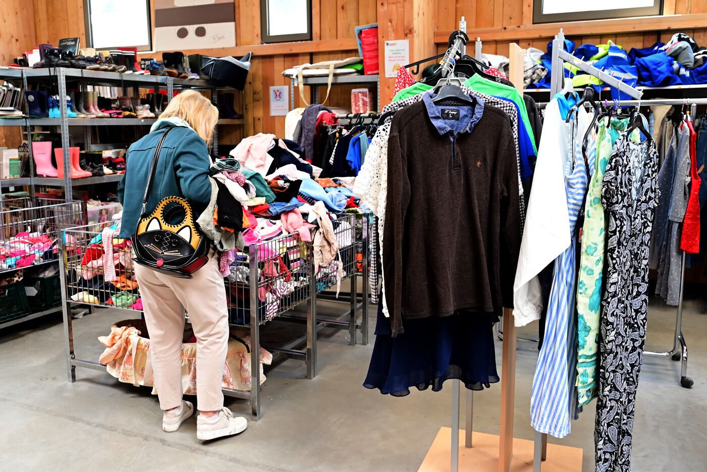 France, Serrieres, April 4, 2026. Two people holding clothes during the Emmaus Spring Sale to support the association's activities and provide housing for those in need. Photograph by Romain Doucelin / Hans Lucas.