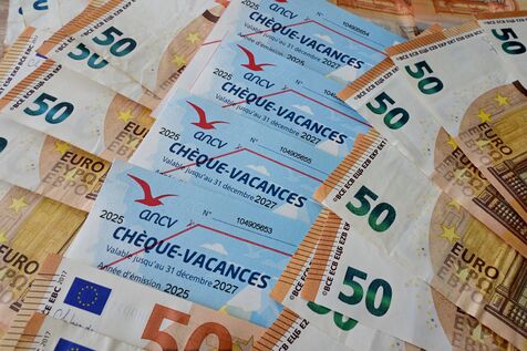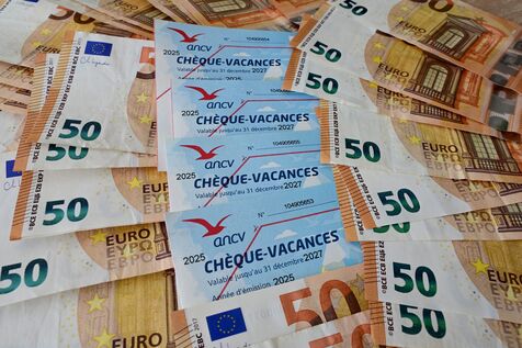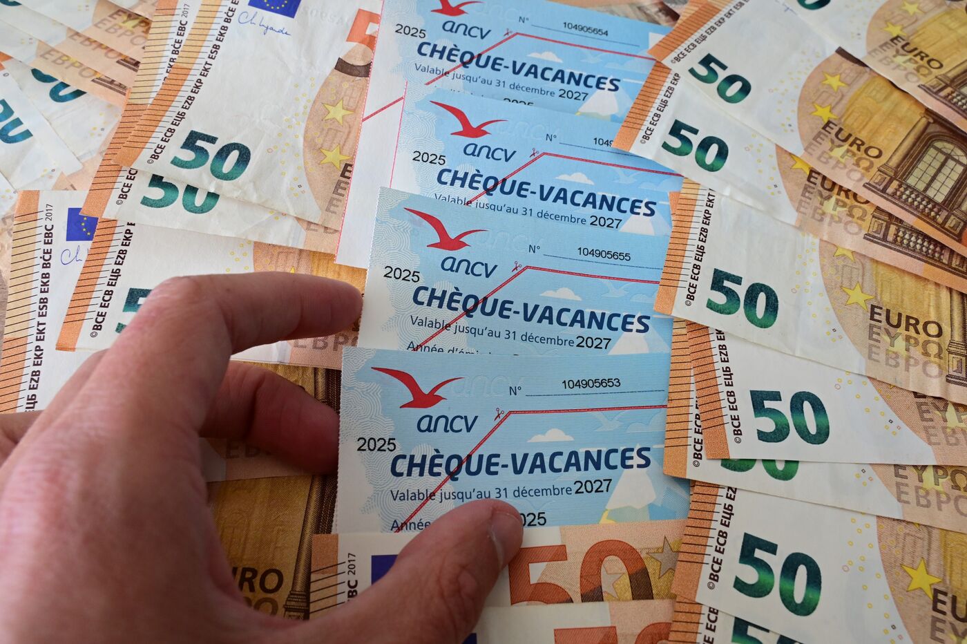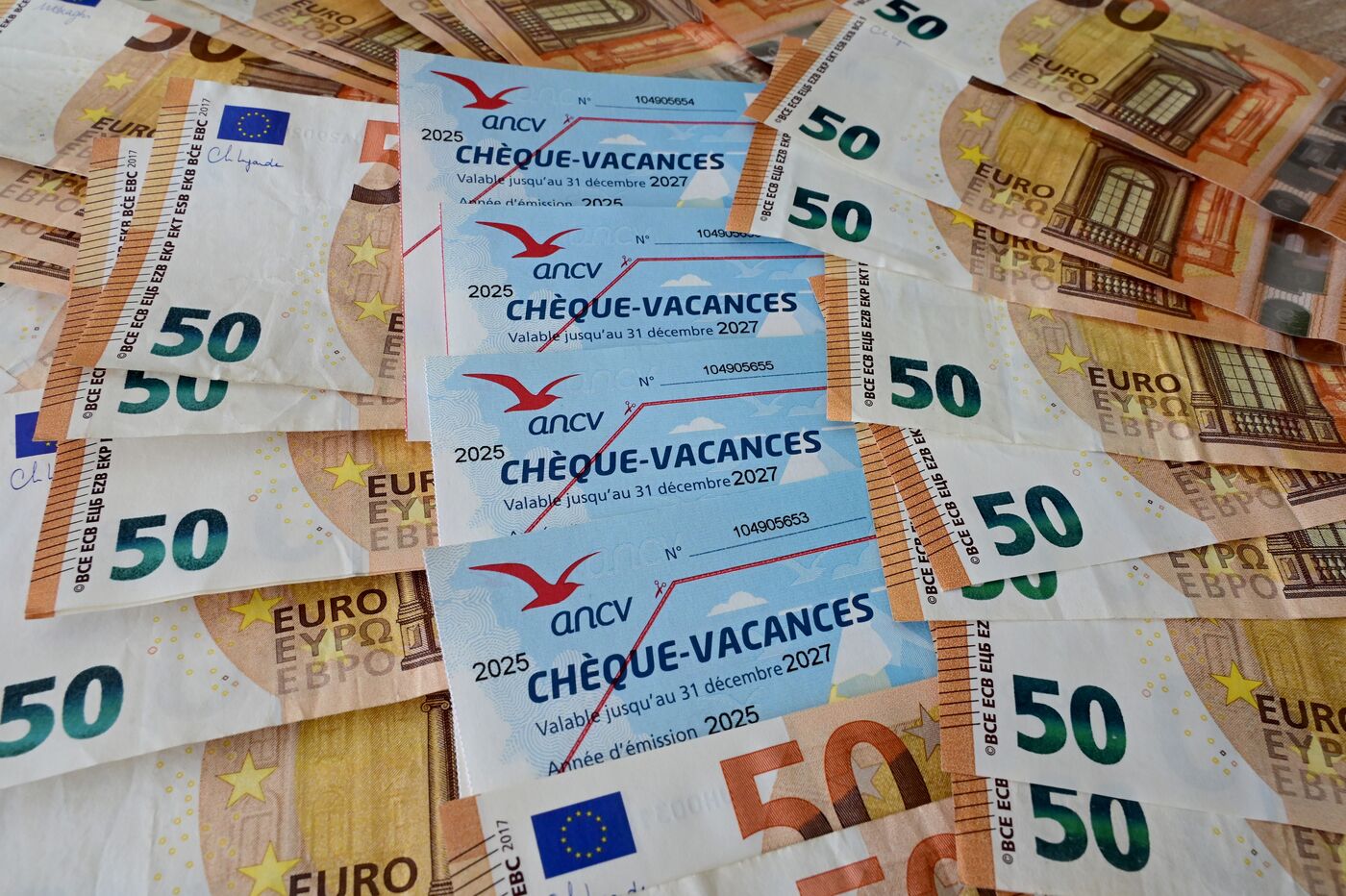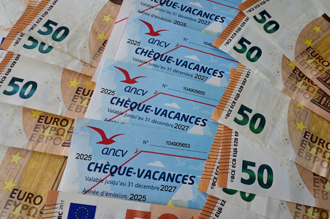 France, Clonas, April 10, 2026. ANCV holiday vouchers and fifty-euro banknotes. Photograph by Romain Doucelin / Hans Lucas.