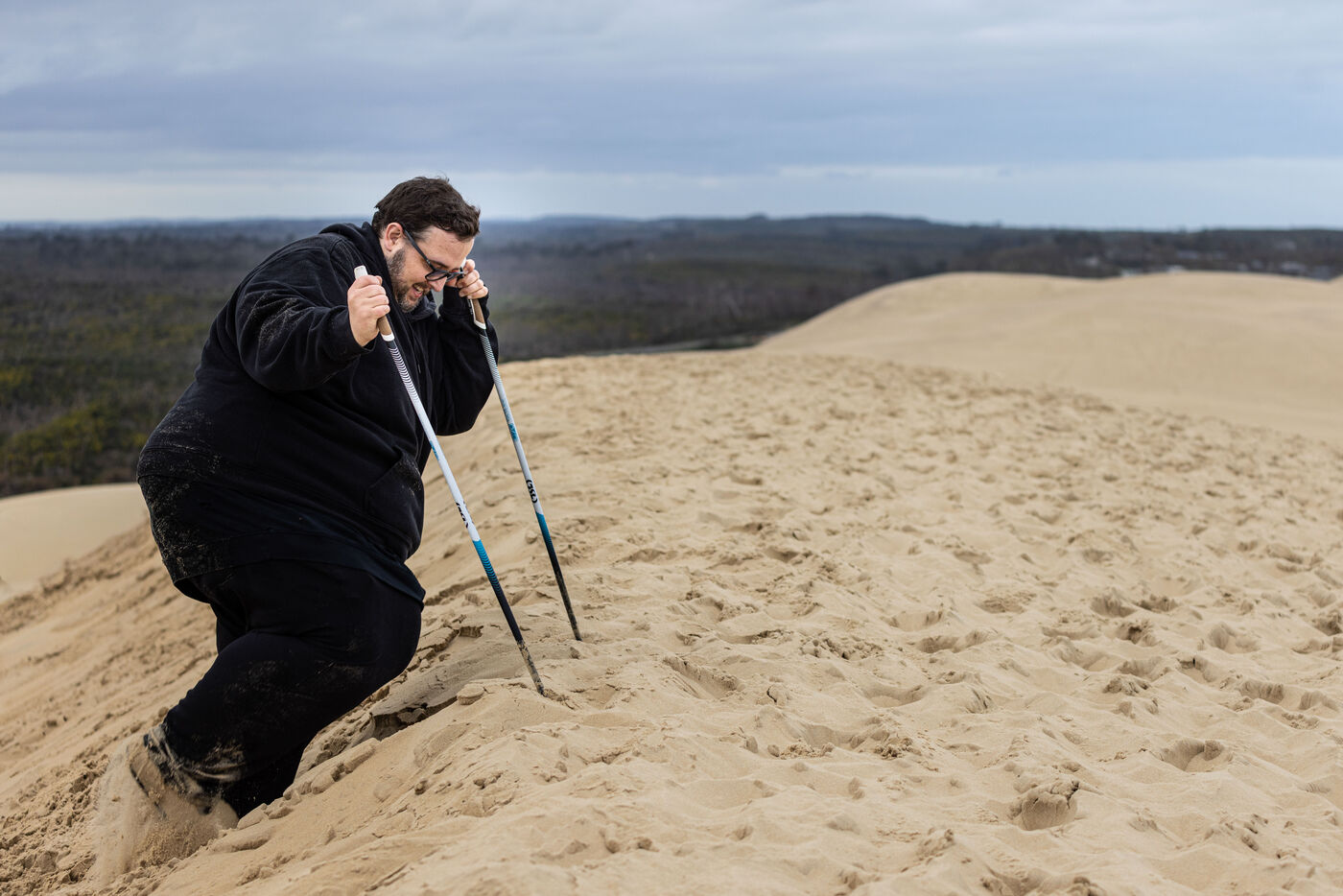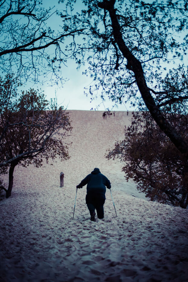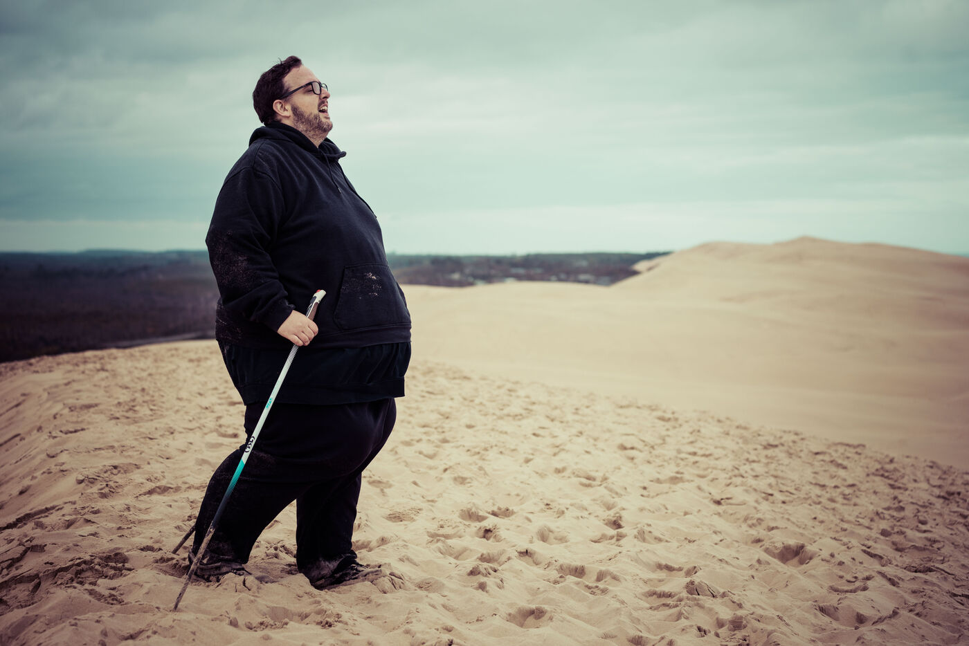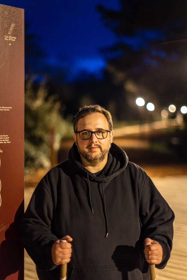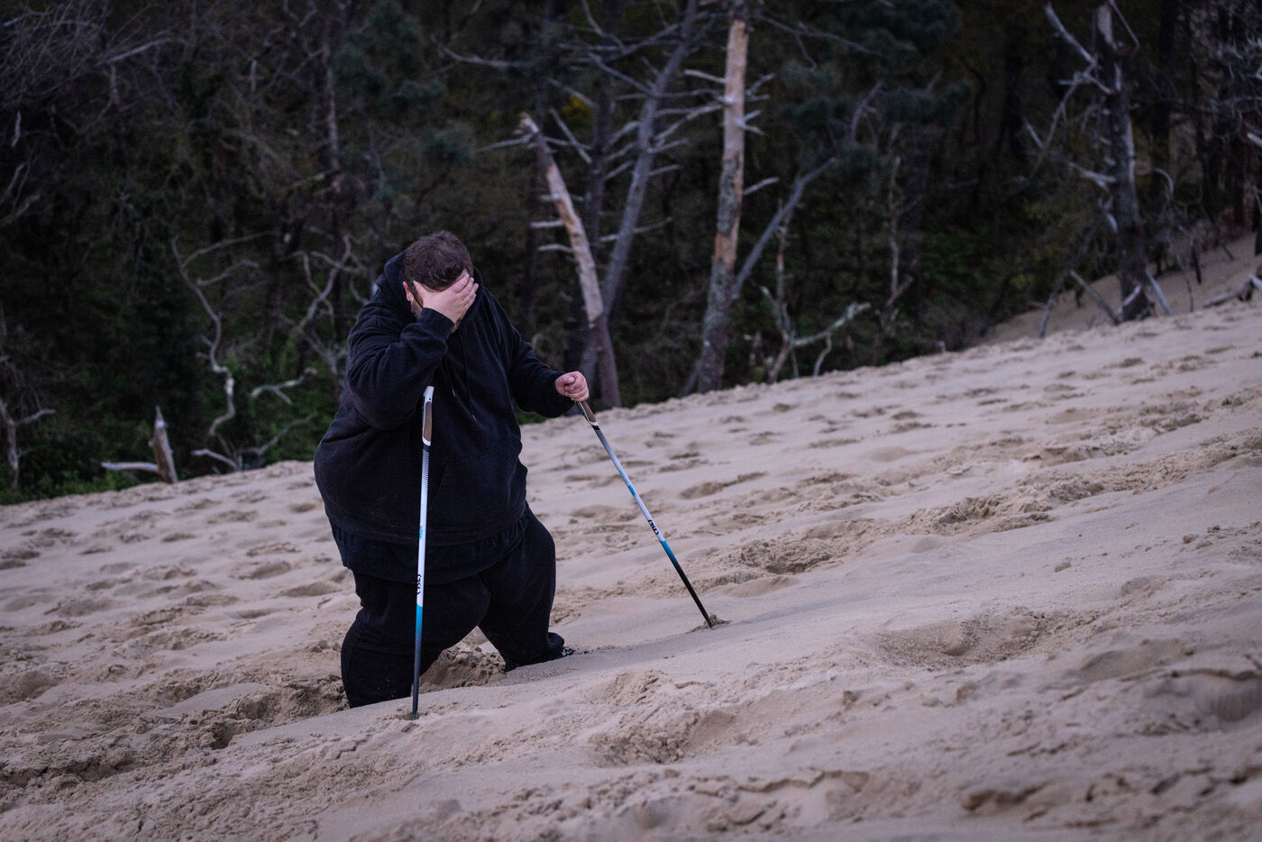 Day and night, in the city, in the mountains or on the Dune du Pilat — which he climbs straight up through the sand, away from the stairs — Micka keeps moving. 6,000 steps a day, a strict routine, and a constant online presence where he openly shares his journey.
