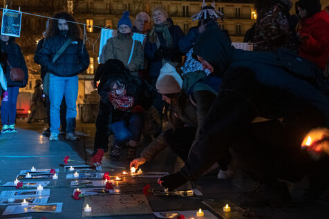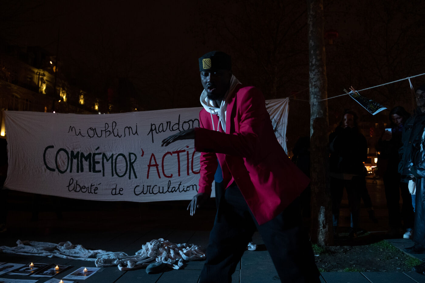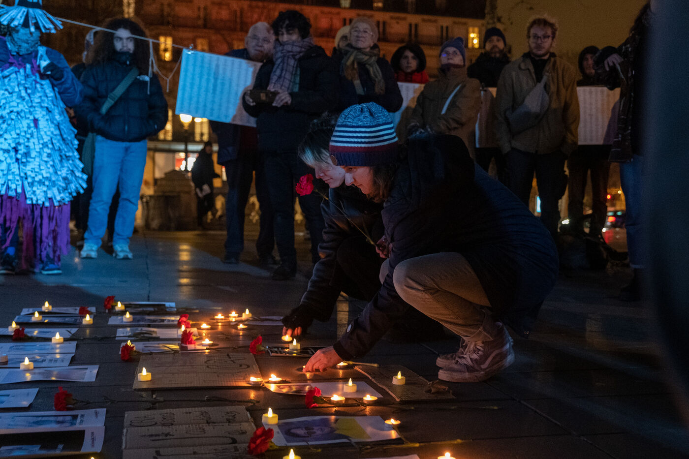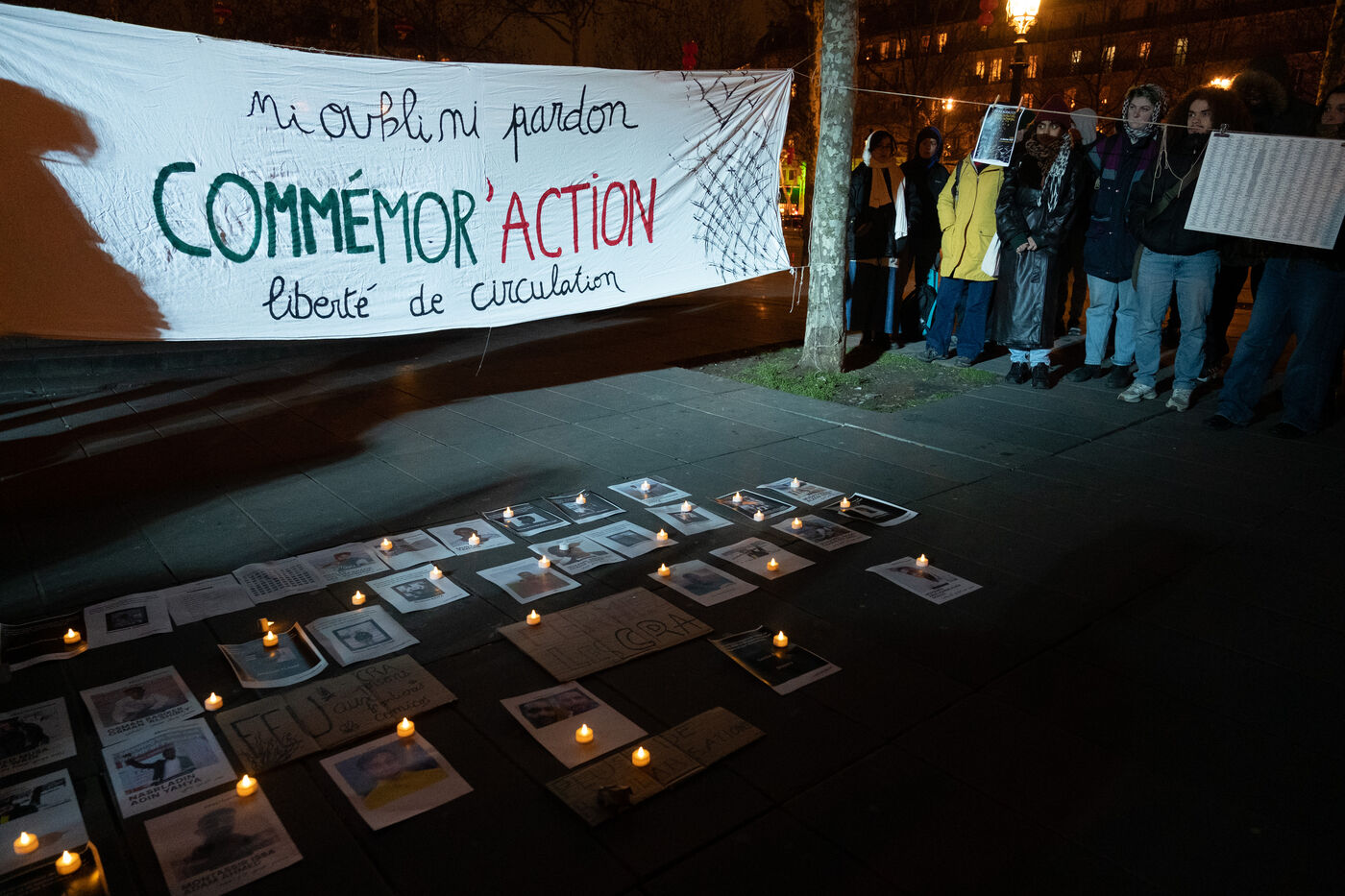 Rassemblement de commémoration des victimes des politiques migratoires aux frontières sur la place de la République à Paris le 6 février 2025.