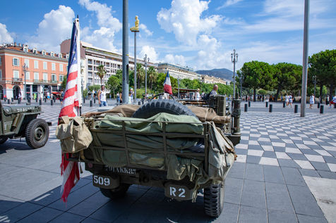 Une cinquantaine de véhicules (char, Jeep?) datant de la seconde guerre mondiale, étaient sur la place Masséna à Nice après avoir défilé dans Nice lors des cérémonies du 78eme anniversaire de la libération de Nice.