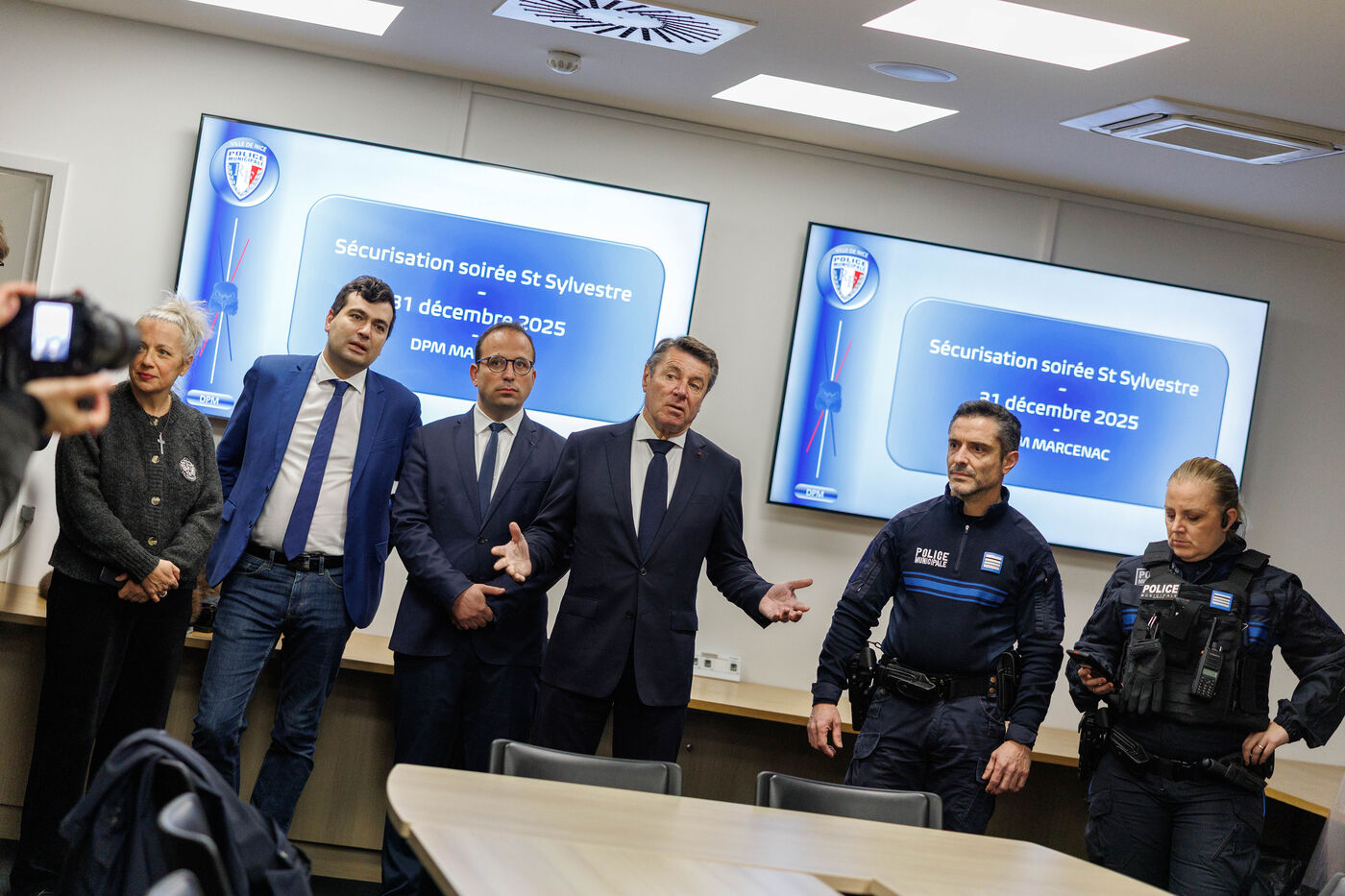 The mayor of Nice attends a briefing with municipal police officers mobilised for New Year's Eve security operations on the eve of New Year's celebrations.