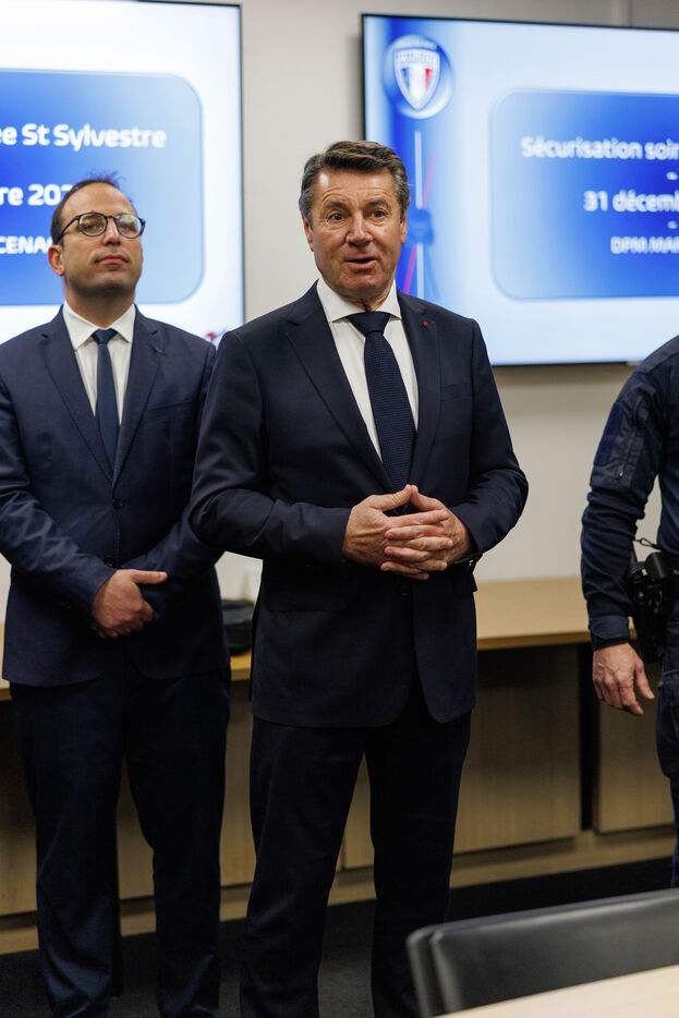 Le maire de Nice assiste à un briefing avec les agents de la police municipale mobilisés pour les opérations de sécurité du réveillon du Nouvel An, à la veille des célébrations du Nouvel An.