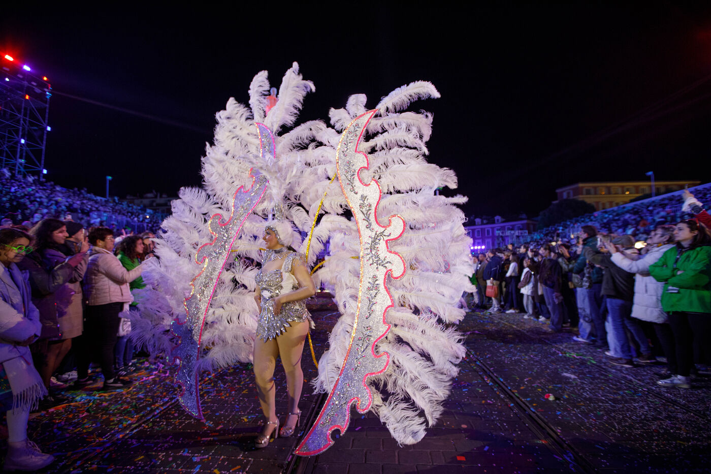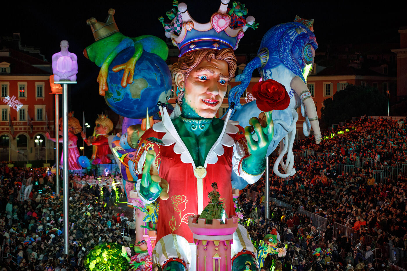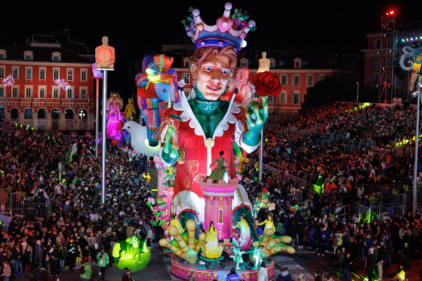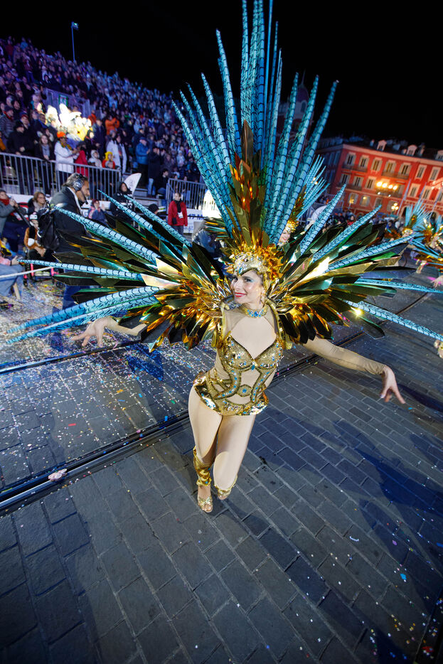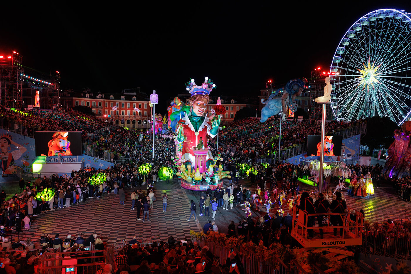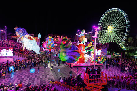 Vue du premier défilé illuminé lors de l'inauguration du Carnaval de Nice 2026, place Masséna. Les chars illuminés défilent devant le public pour le lancement officiel de l'édition 2026 du carnaval, intitulée « Vive la Reine ».