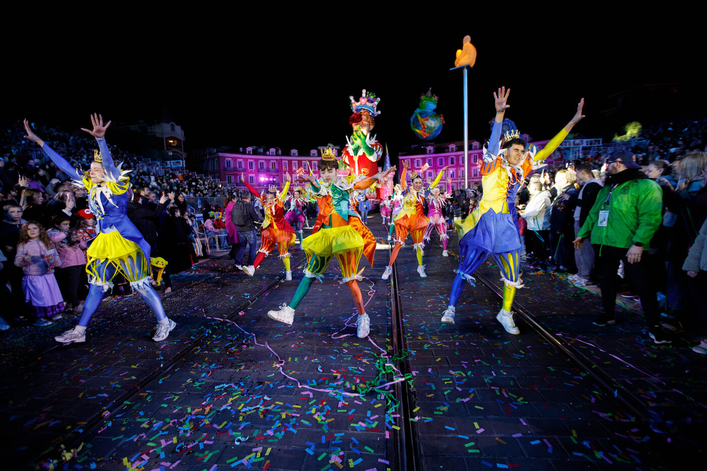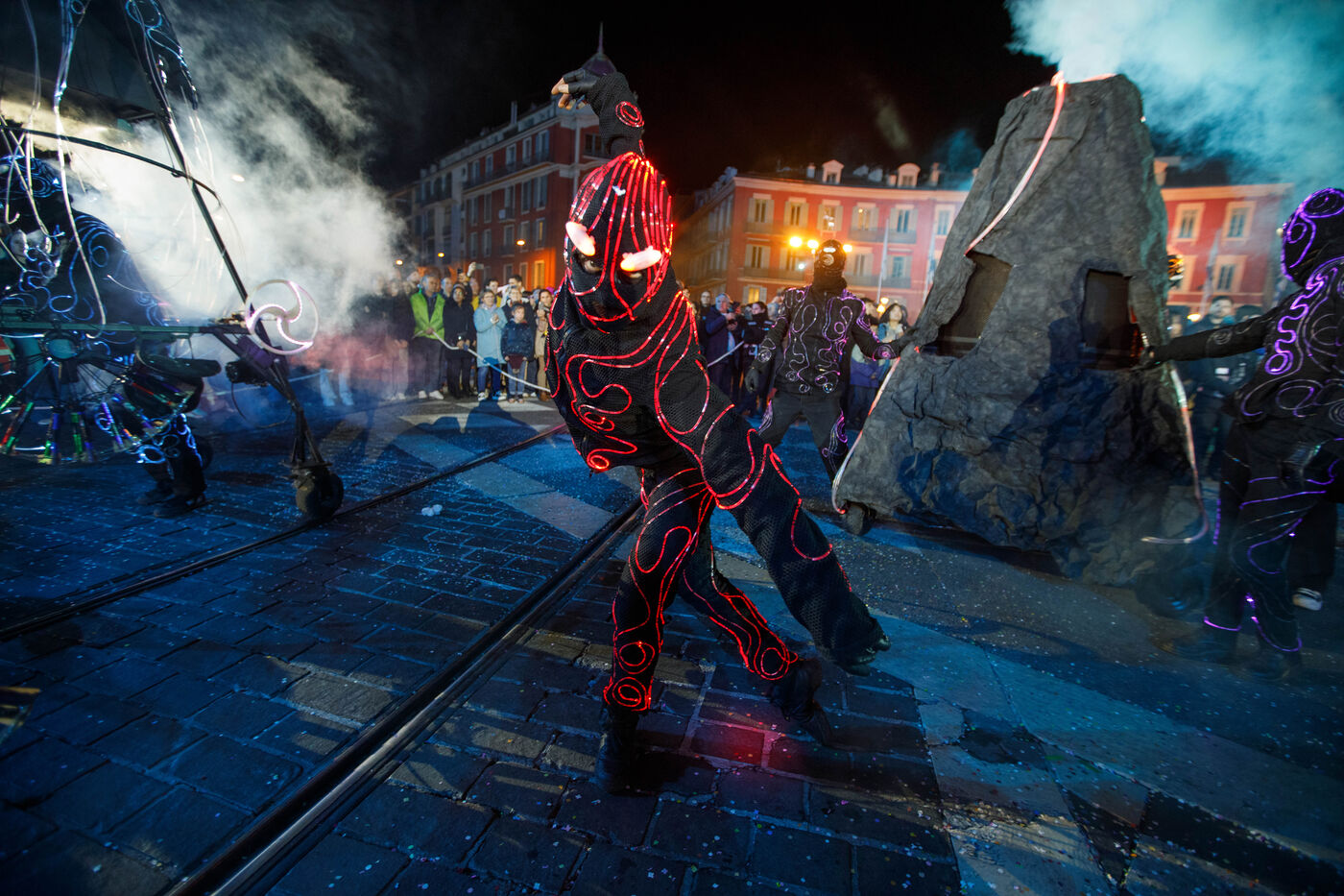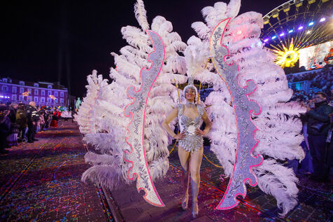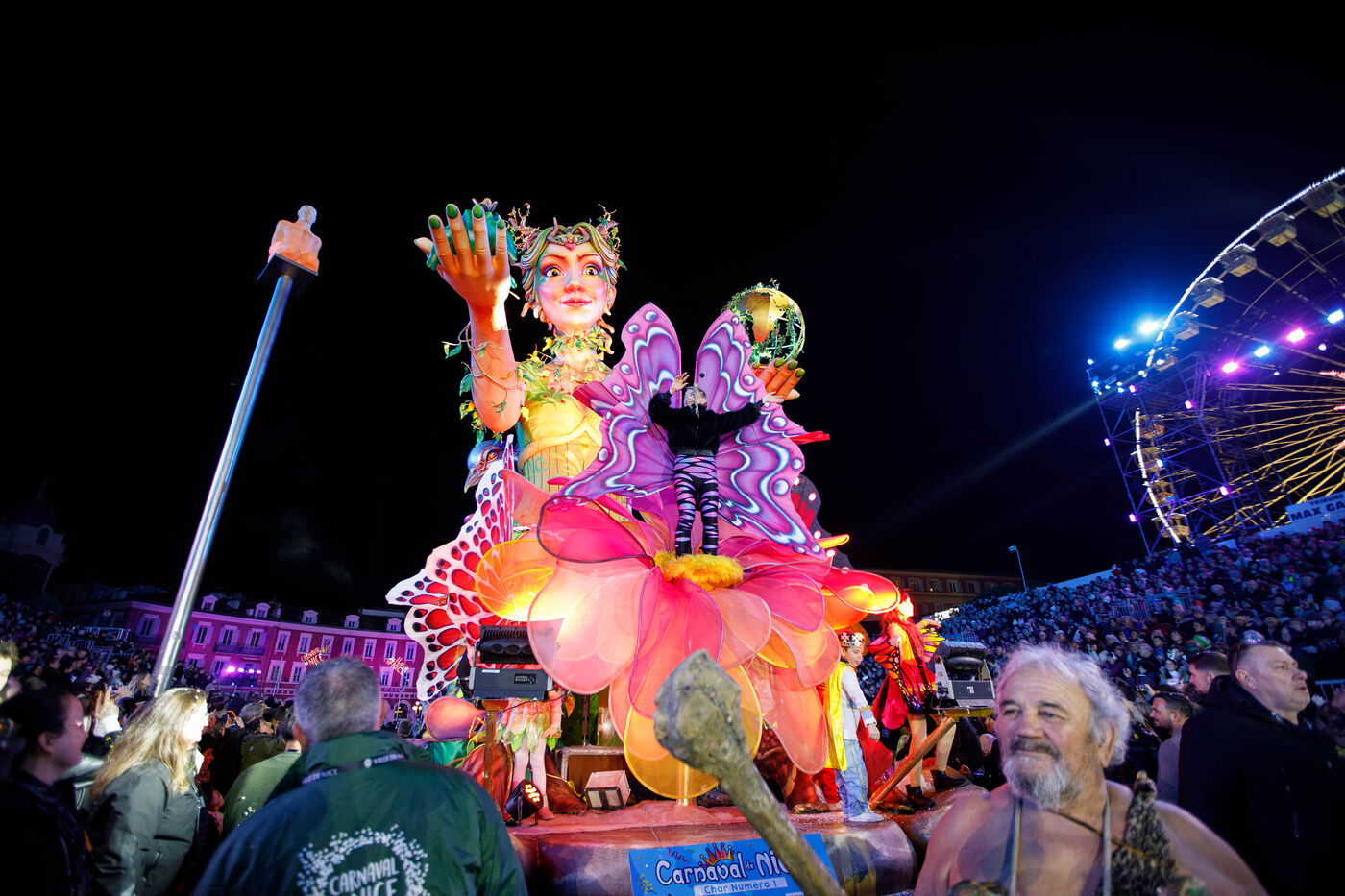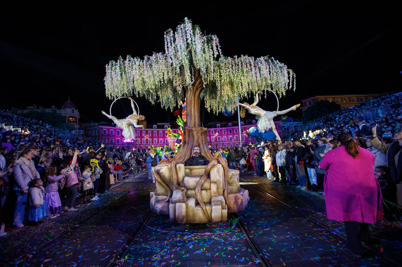 Vue du premier défilé illuminé lors de l'inauguration du Carnaval de Nice 2026, place Masséna. Les chars illuminés défilent devant le public pour le lancement officiel de l'édition 2026 du carnaval, intitulée « Vive la Reine ».