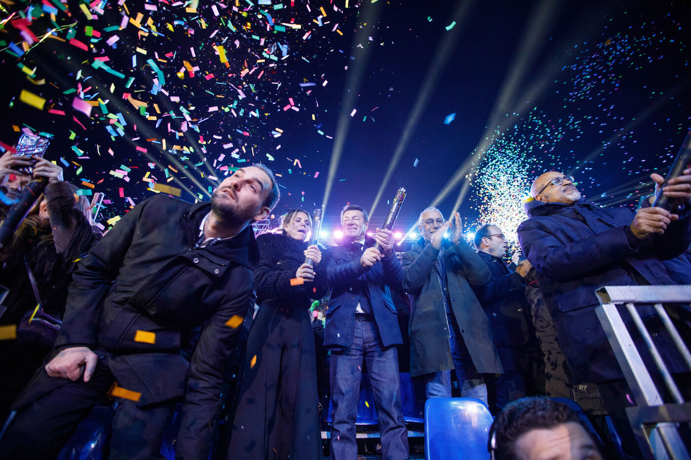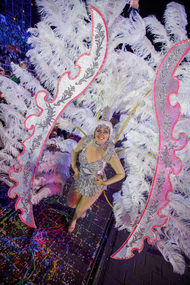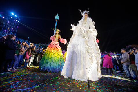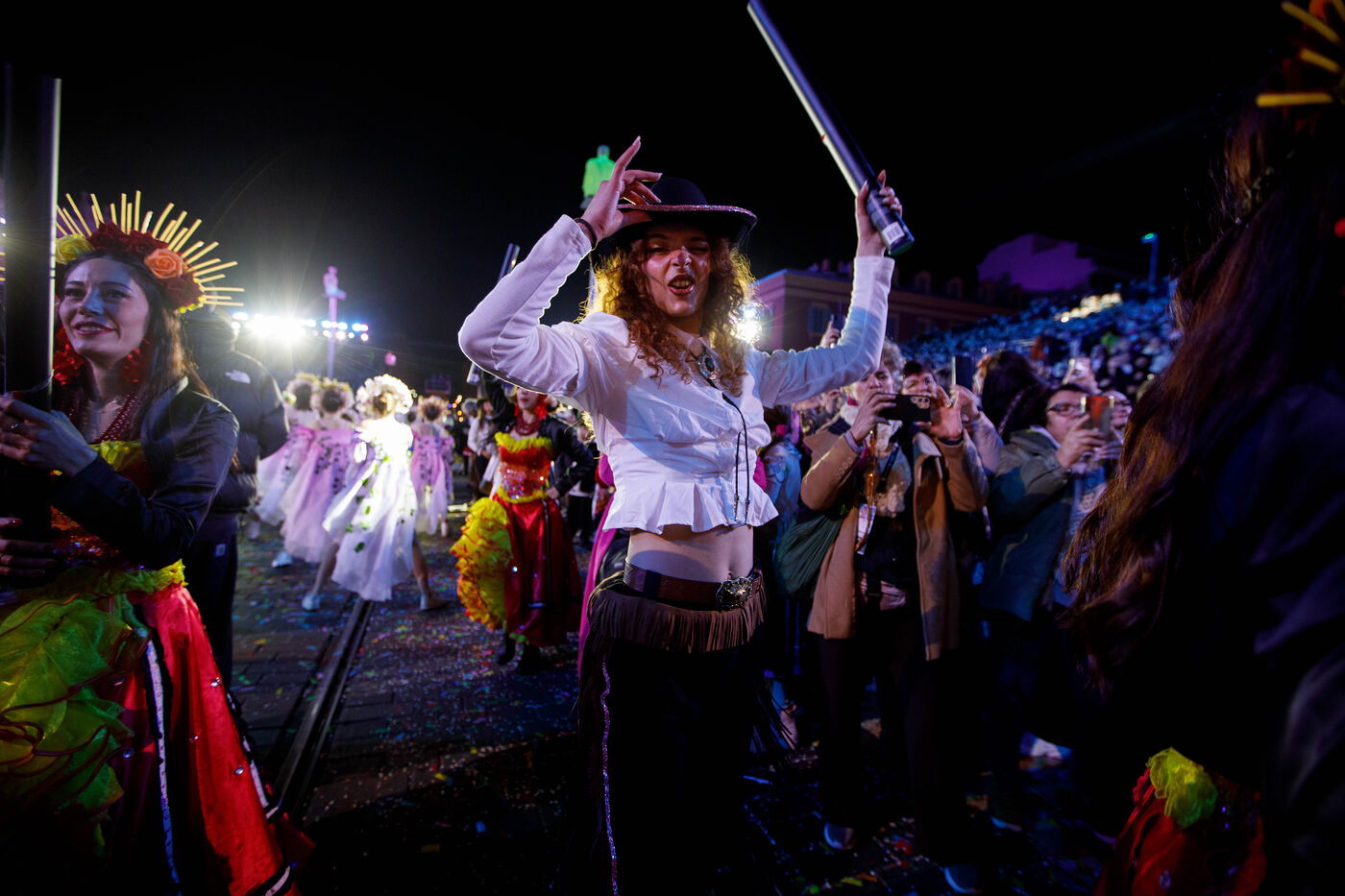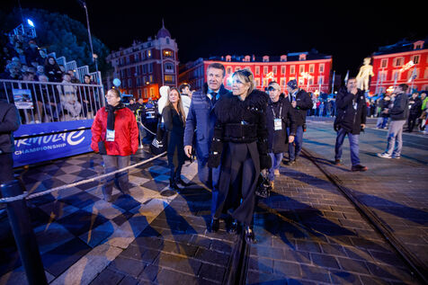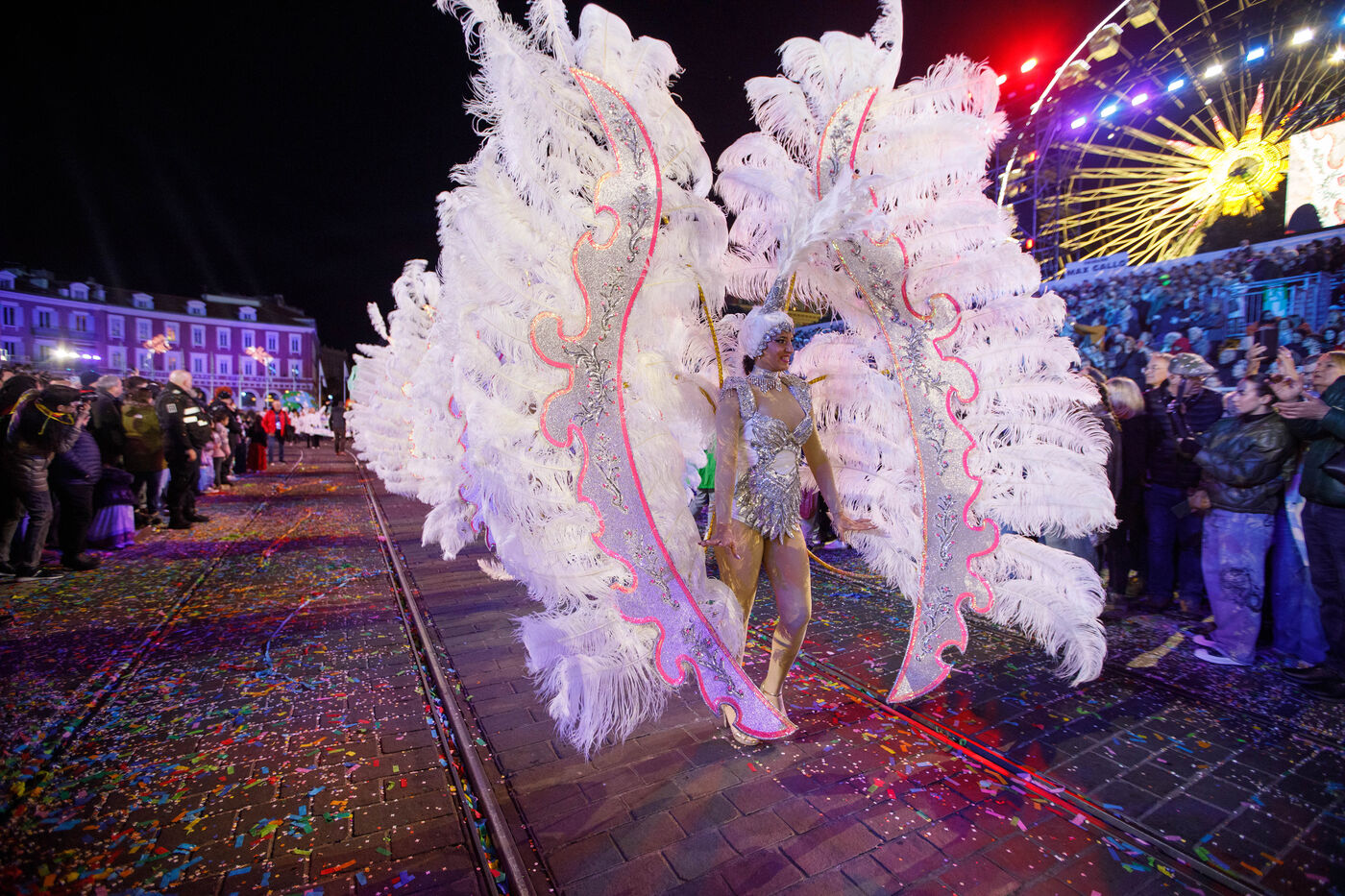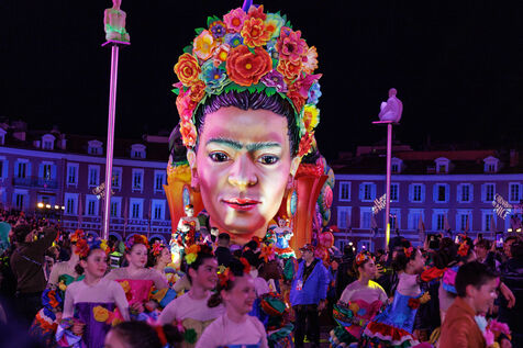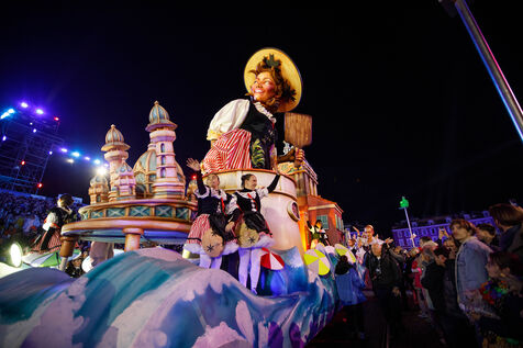 Vue du premier défilé illuminé lors de l'inauguration du Carnaval de Nice 2026, place Masséna. Les chars illuminés défilent devant le public pour le lancement officiel de l'édition 2026 du carnaval, intitulée « Vive la Reine ».