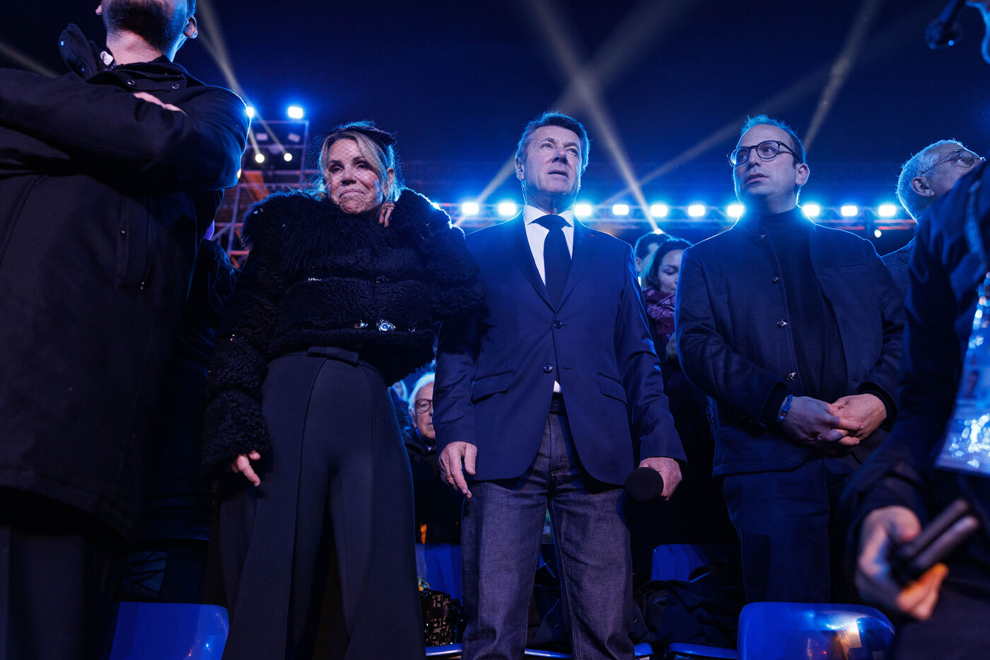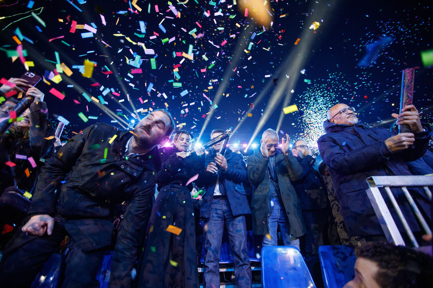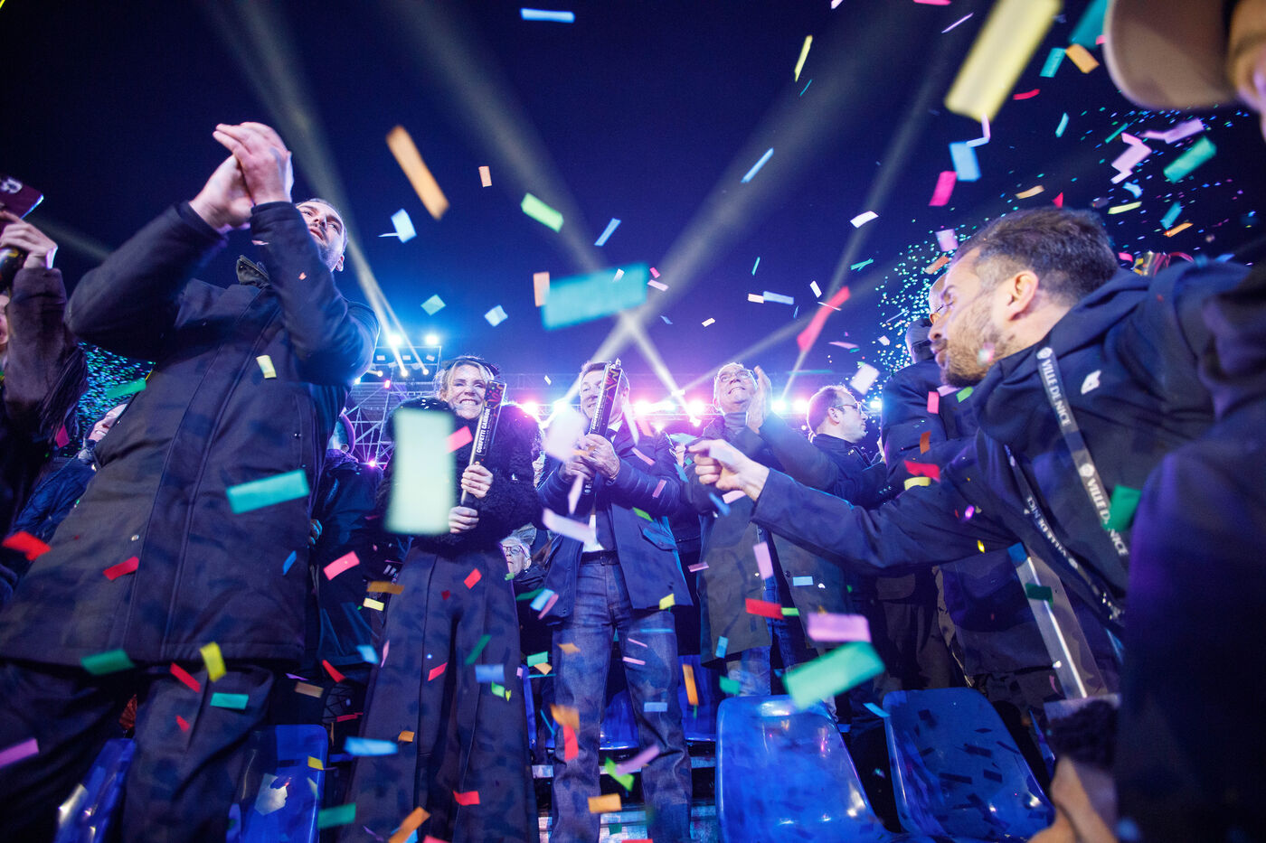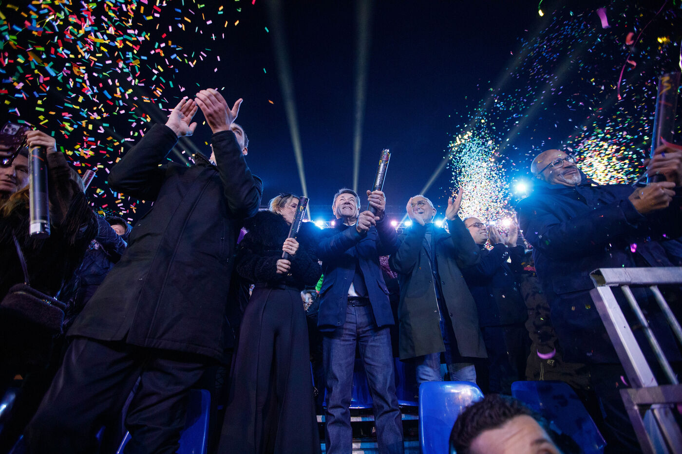 Vue du premier défilé illuminé lors de l'inauguration du Carnaval de Nice 2026, place Masséna. Les chars illuminés défilent devant le public pour le lancement officiel de l'édition 2026 du carnaval, intitulée « Vive la Reine ».
