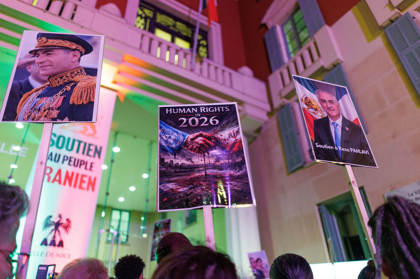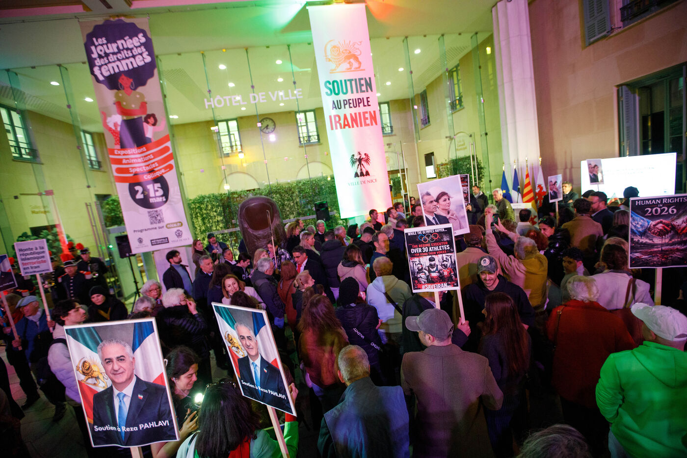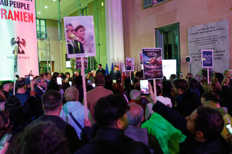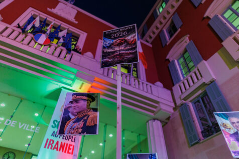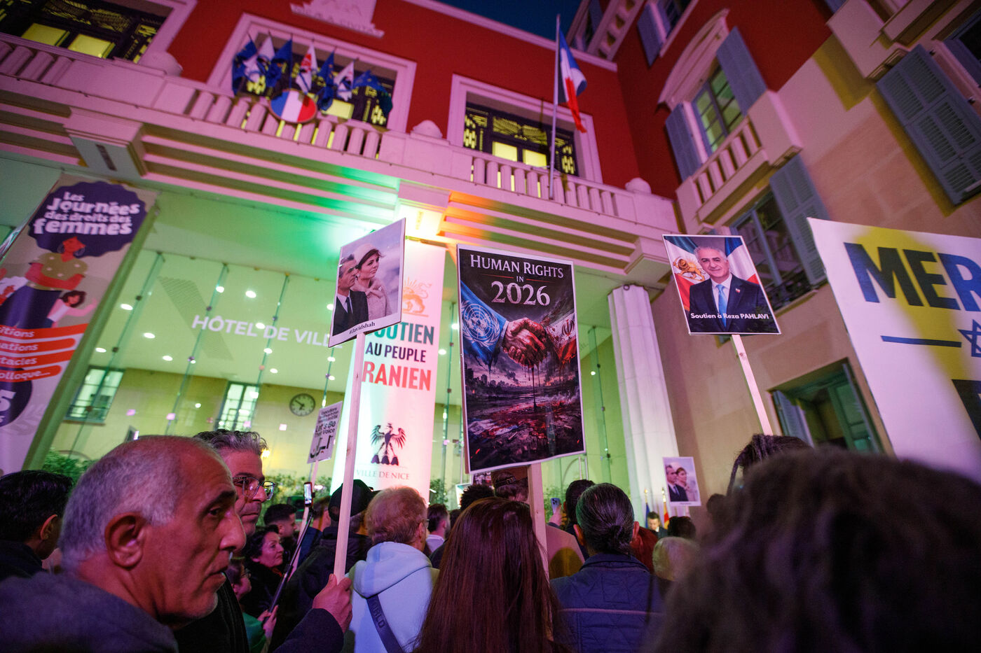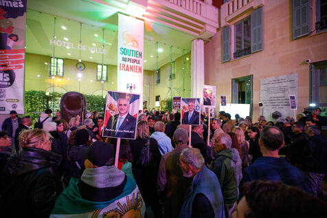 Rally in support of the Iranian people on the steps of Nice City Hall this Monday. The event is being held in the presence of the mayor of Nice, president of the Nice Côte d'Azur Metropolis, and members of the City Council. The municipality had previously displayed the colors of Iran on the facade of City Hall to express its solidarity with Iranians engaged in their struggle for freedom.