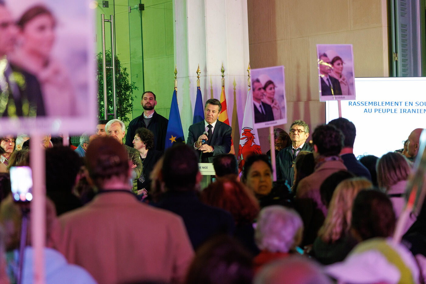 Rassemblement en soutien au peuple iranien sur le parvis de l’Hôtel de Ville de Nice, ce lundi. L’événement se tient en présence du maire de Nice, président de la Métropole Nice Côte d’Azur, et de membres du Conseil municipal. La municipalité avait précédemment affiché les couleurs de l’Iran sur la façade de l’Hôtel de Ville afin d’exprimer sa solidarité avec les Iraniennes et les Iraniens engagés dans leur combat pour la liberté.