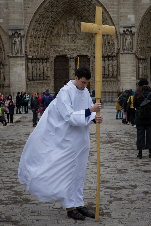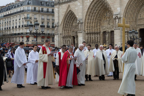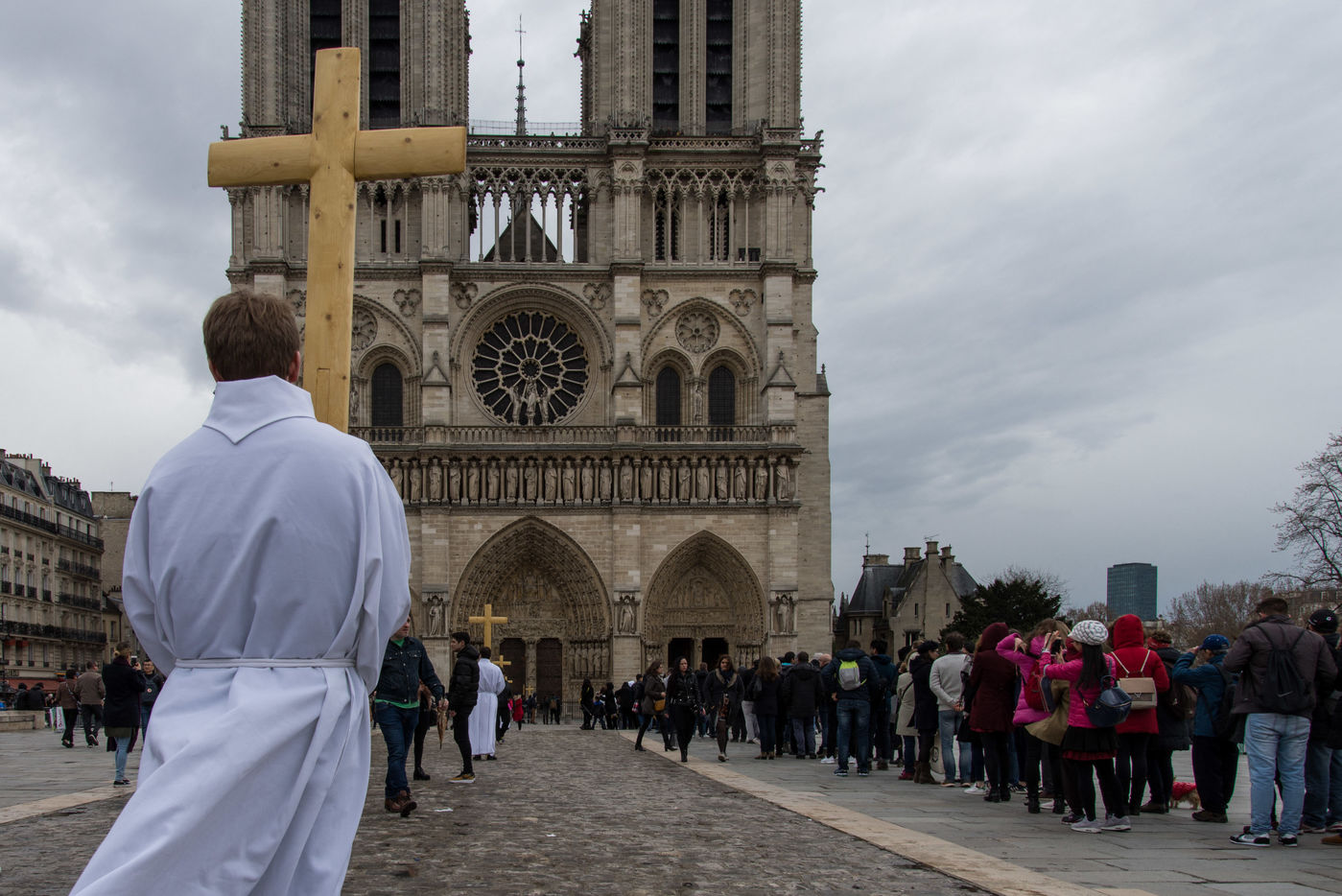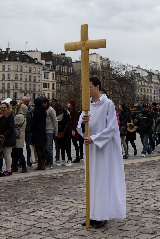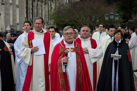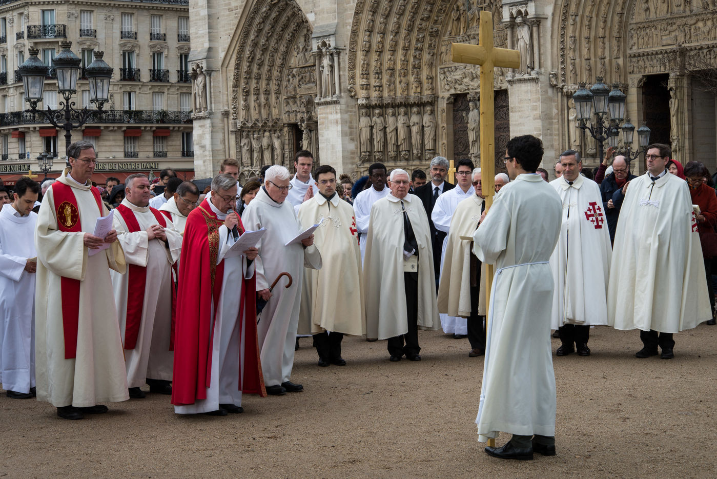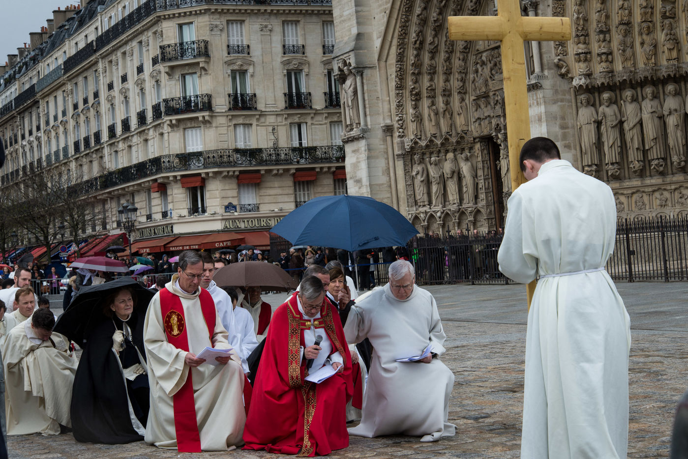 Chemin de Croix de Câreme sur le parvis de Notre Dame de Paris le Vendredi de la Semaine Sainte de Pâques avec Mgr Patrick Chauvet, recteur-archiprêtre de la cathédrale. Paris, 30 mars 2018.