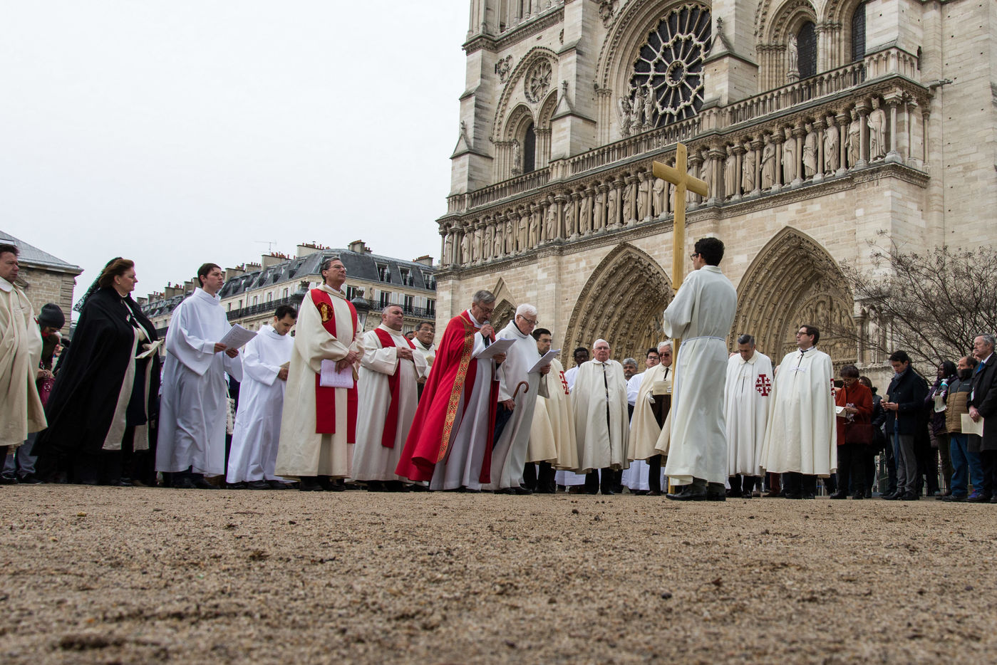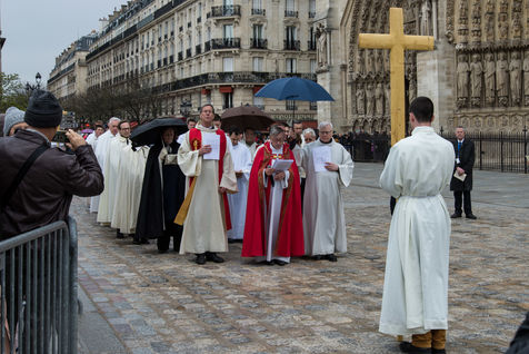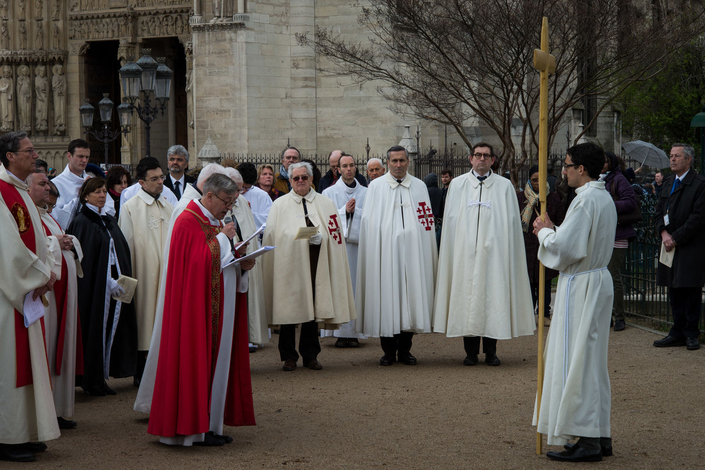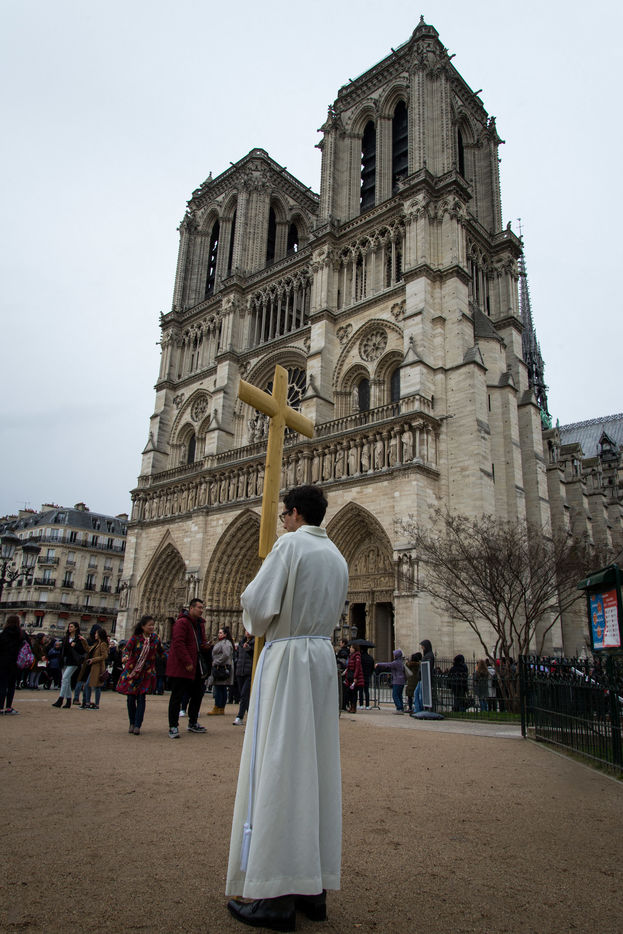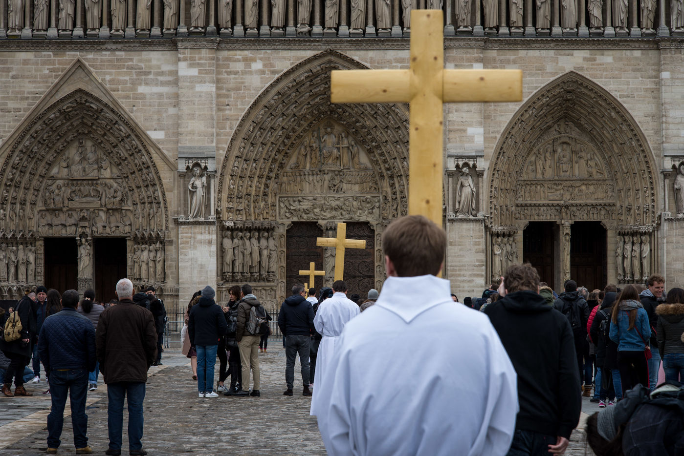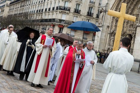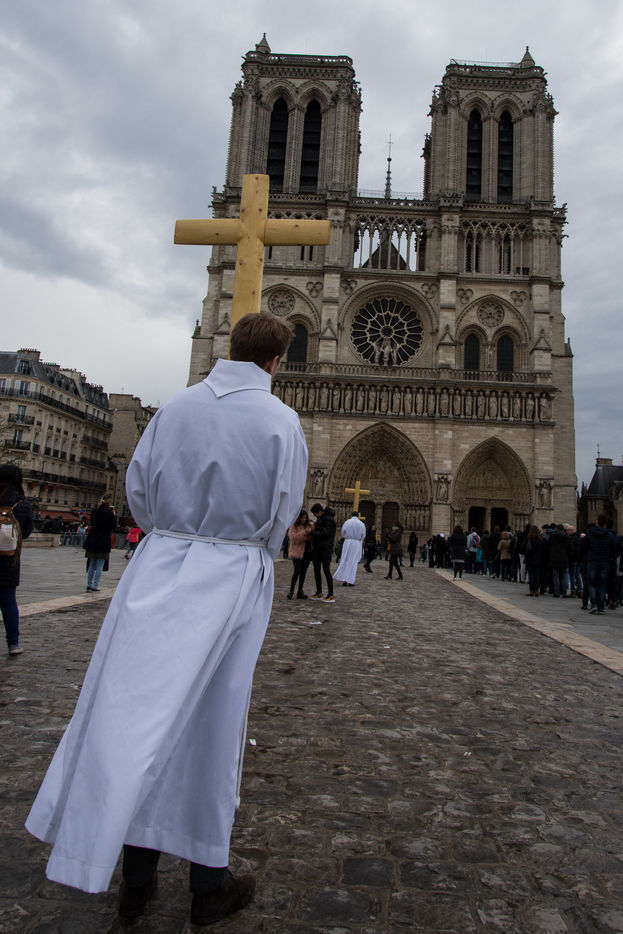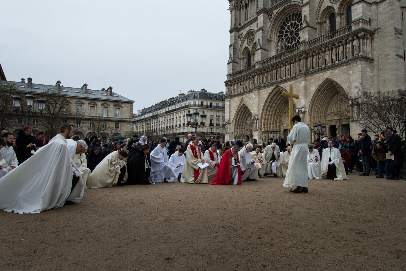 Chemin de Croix de Câreme sur le parvis de Notre Dame de Paris le Vendredi de la Semaine Sainte de Pâques avec Mgr Patrick Chauvet, recteur-archiprêtre de la cathédrale. Paris, 30 mars 2018.