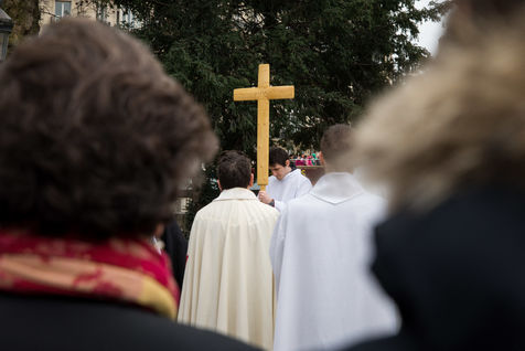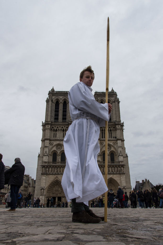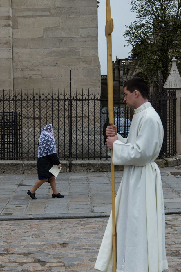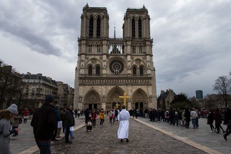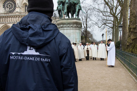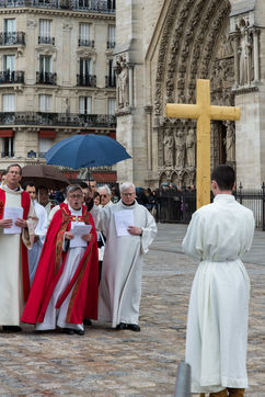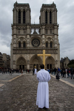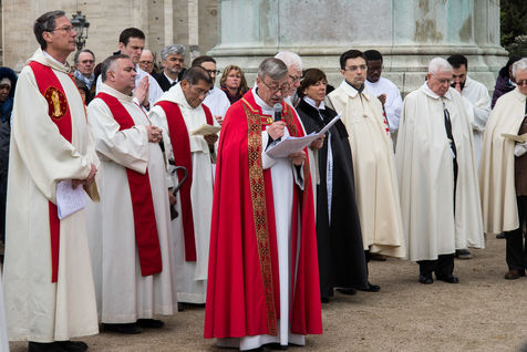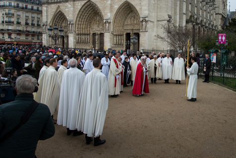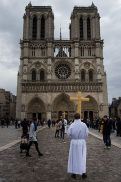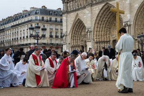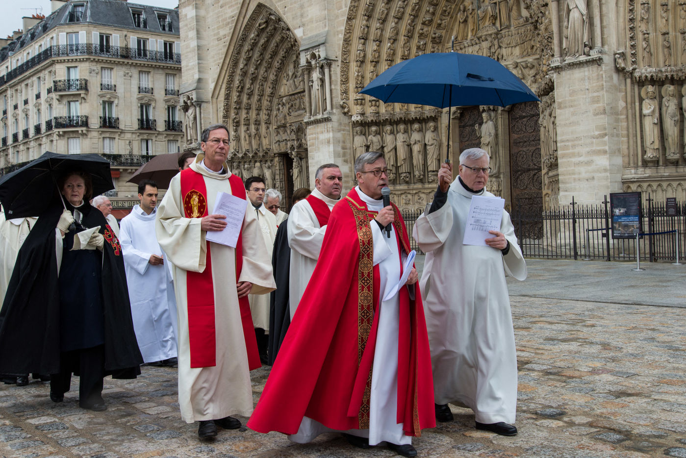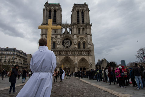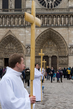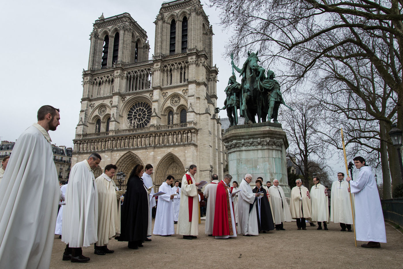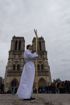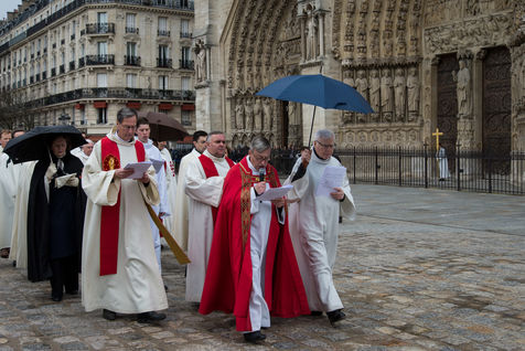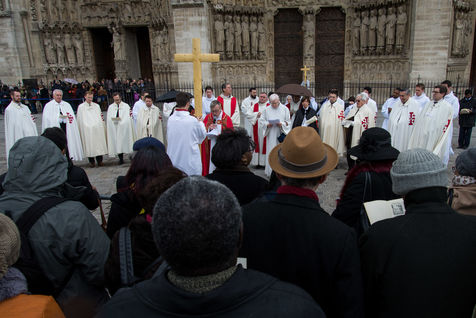Chemin de Croix de Câreme sur le parvis de Notre Dame de Paris le Vendredi de la Semaine Sainte de Pâques avec Mgr Patrick Chauvet, recteur-archiprêtre de la cathédrale. Paris, 30 mars 2018.