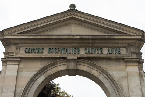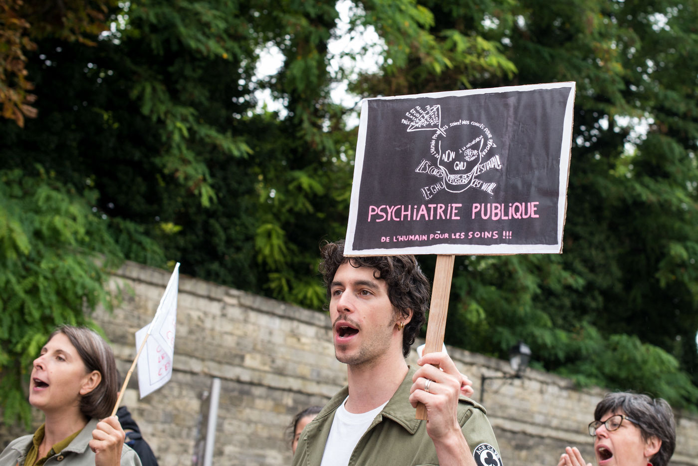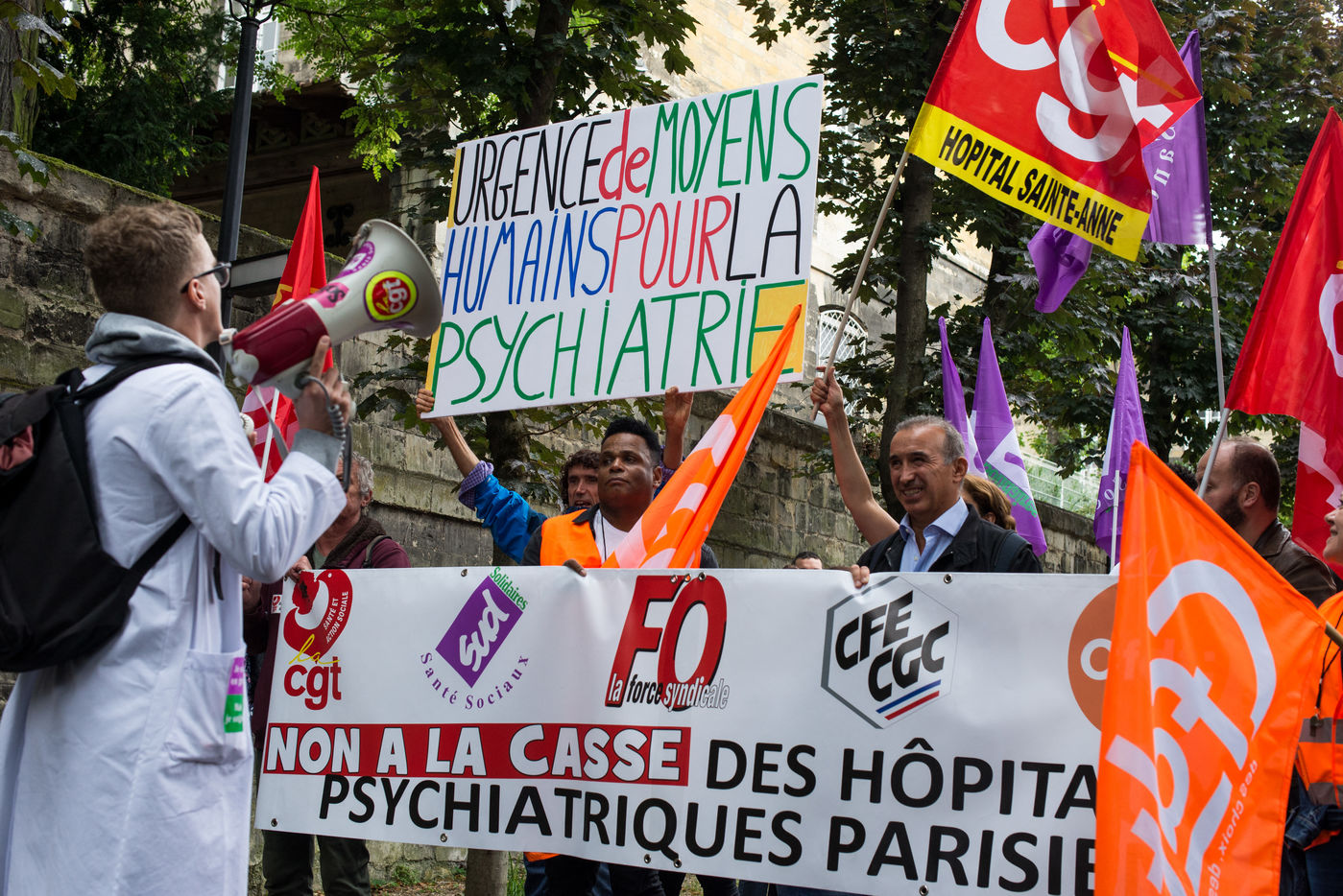 Pour la défense du service public de Santé, grève et manifestation à Sainte Anne. Le GHU (groupement hospitalo-universitaire), va voir le jour au 1er Janvier 2019 : il naîtra de la fusion des 3 hôpitaux psychiatriques parisiens actuels (Sainte Anne, Perray Vaucluse, Maison Blanche). Cette fusion, guidée par la seule volonté de réduire les dépenses de santé, va entraîner une dégradation de la qualité et de l'offre de soins par la diminution drastique des moyens humains. Paris, Centre hospitalier Sainte-Anne, 6 septembre 2018.
