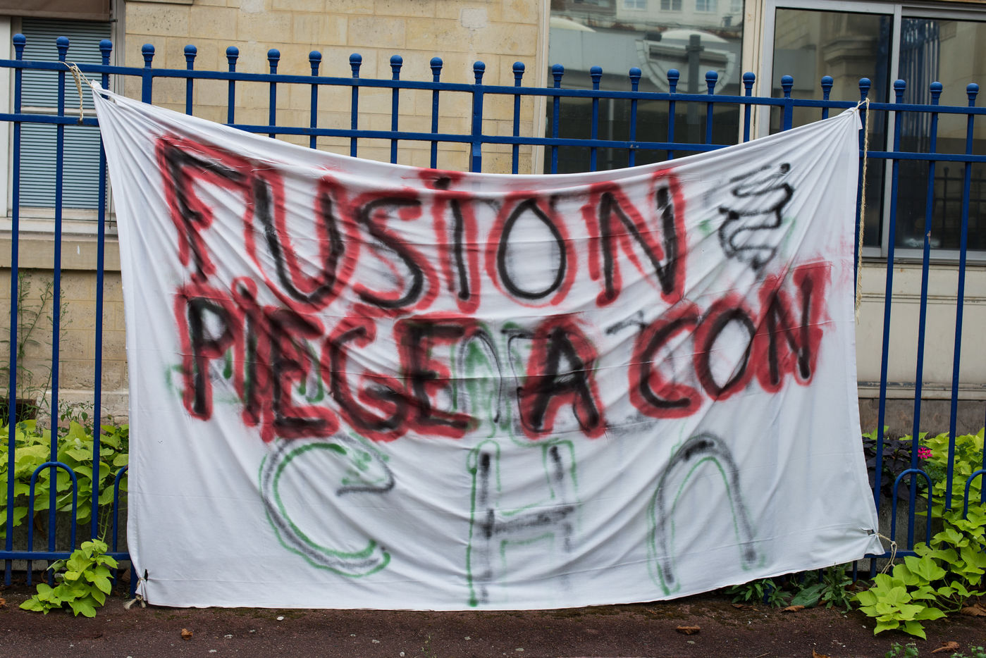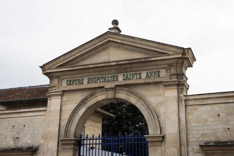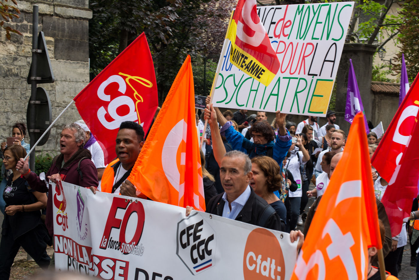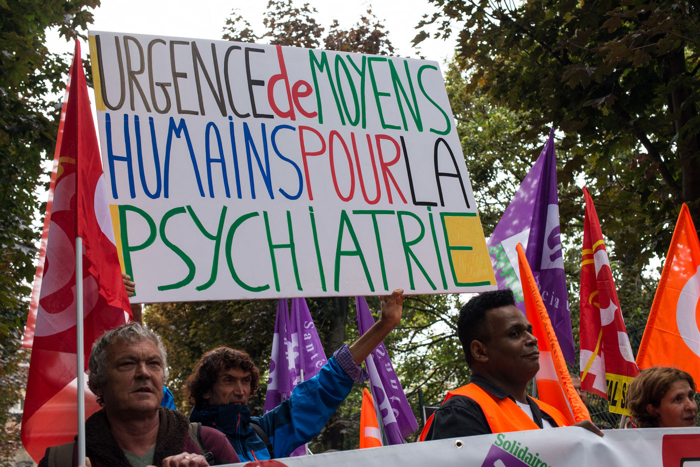 Pour la défense du service public de Santé, grève et manifestation à Sainte Anne. Le GHU (groupement hospitalo-universitaire), va voir le jour au 1er Janvier 2019 : il naîtra de la fusion des 3 hôpitaux psychiatriques parisiens actuels (Sainte Anne, Perray Vaucluse, Maison Blanche). Cette fusion, guidée par la seule volonté de réduire les dépenses de santé, va entraîner une dégradation de la qualité et de l'offre de soins par la diminution drastique des moyens humains. Paris, Centre hospitalier Sainte-Anne, 6 septembre 2018.