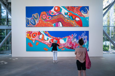 Mirdidingkingathi Juwarnda exhibition by Sally Gabori at the Cartier Foundation for Contemporary Art in Paris. Considered one of Australia's greatest contemporary artists, Sally Gabori began painting in 2005, around the age of 80. She develops a unique work with vibrant colors.