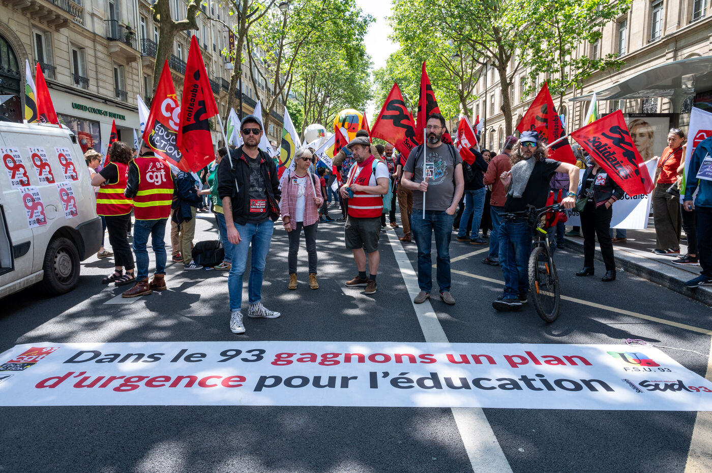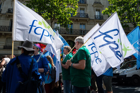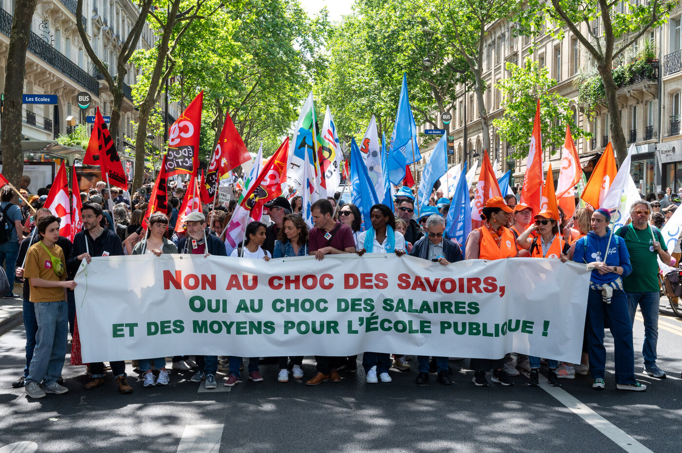 Manifestation contre le "choc des savoirs" à l'appel des syndicats de l'éducation à Place de la Sorbonne, Paris. La mobilisation des personnels de l'Education nationale se poursuit contre la reforme voulue par Gabriel Attal, notamment contre les groupes de niveau.