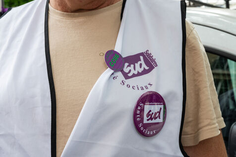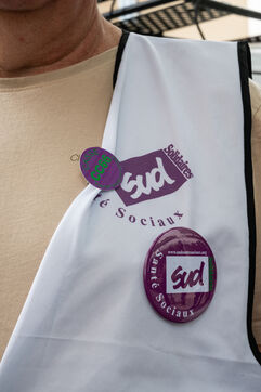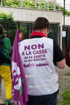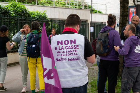 Gathering of medico-social professionals in front of the FEHAP headquarters (Federation of non-profit private hospital and assistance establishments, Federation des Etablissements Hospitaliers et d?Aide a la Personne prives non lucratifs).