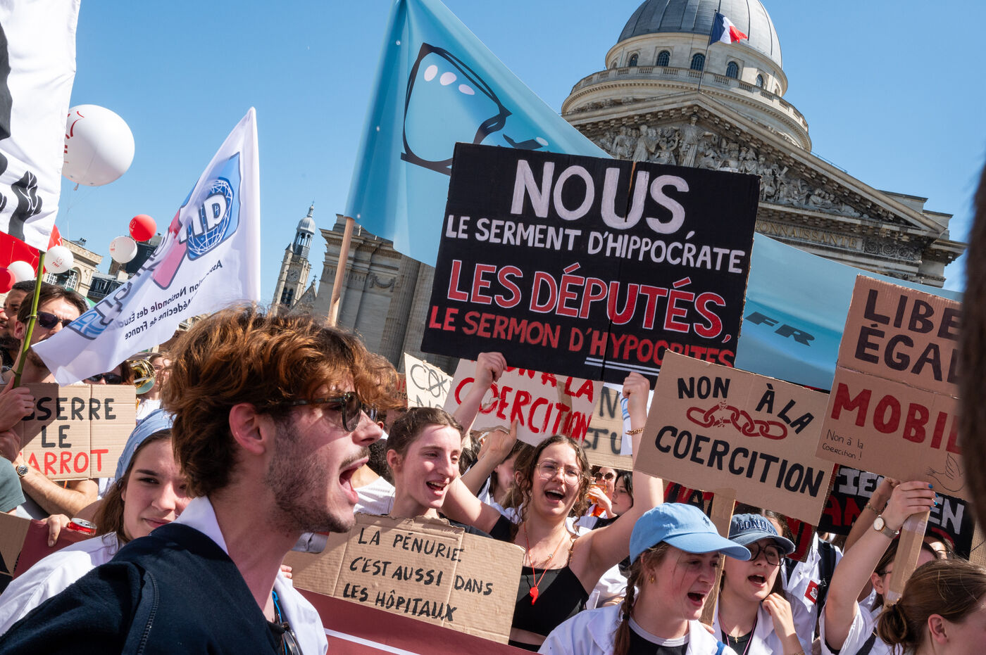 Manifestation en soutien aux internes et en defense de la médecine libérale à la Place du Pantheon à Paris. Les syndicats d’internes et jeunes médecins organisent une grève et une manifestation pour défendre la liberté d’installation et la pratique libérale.