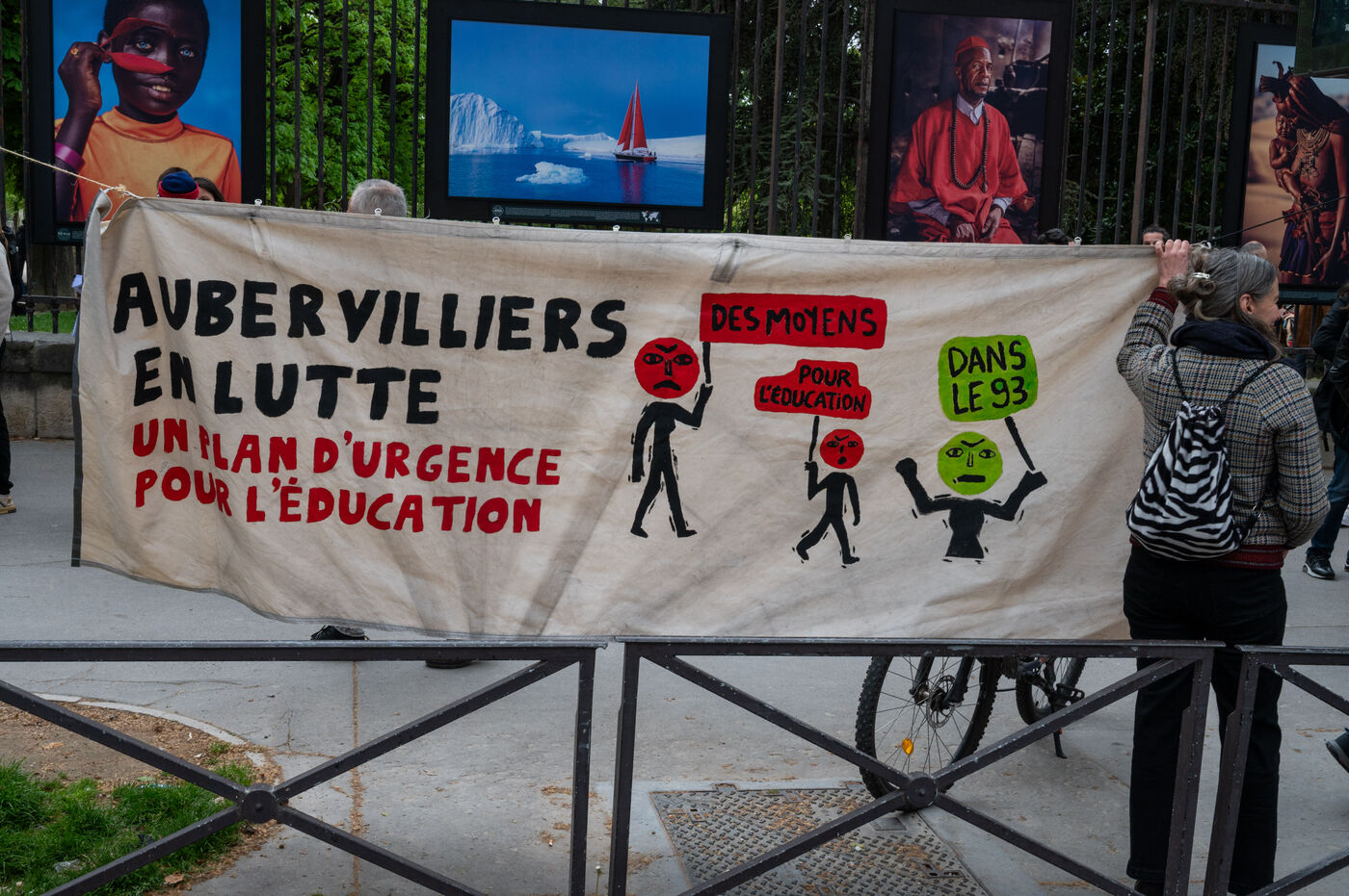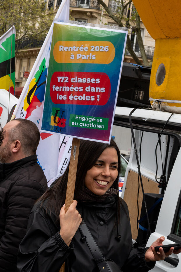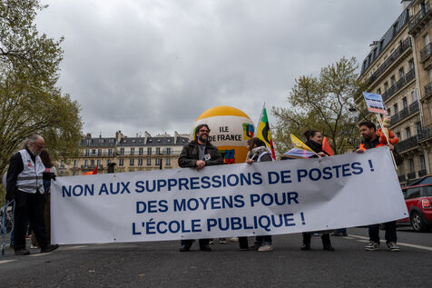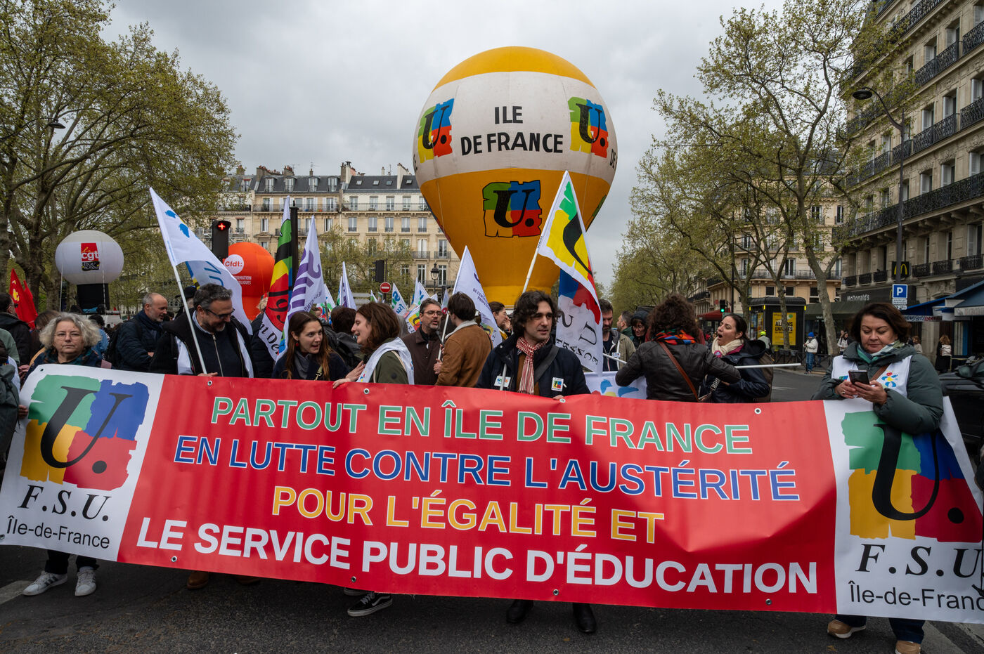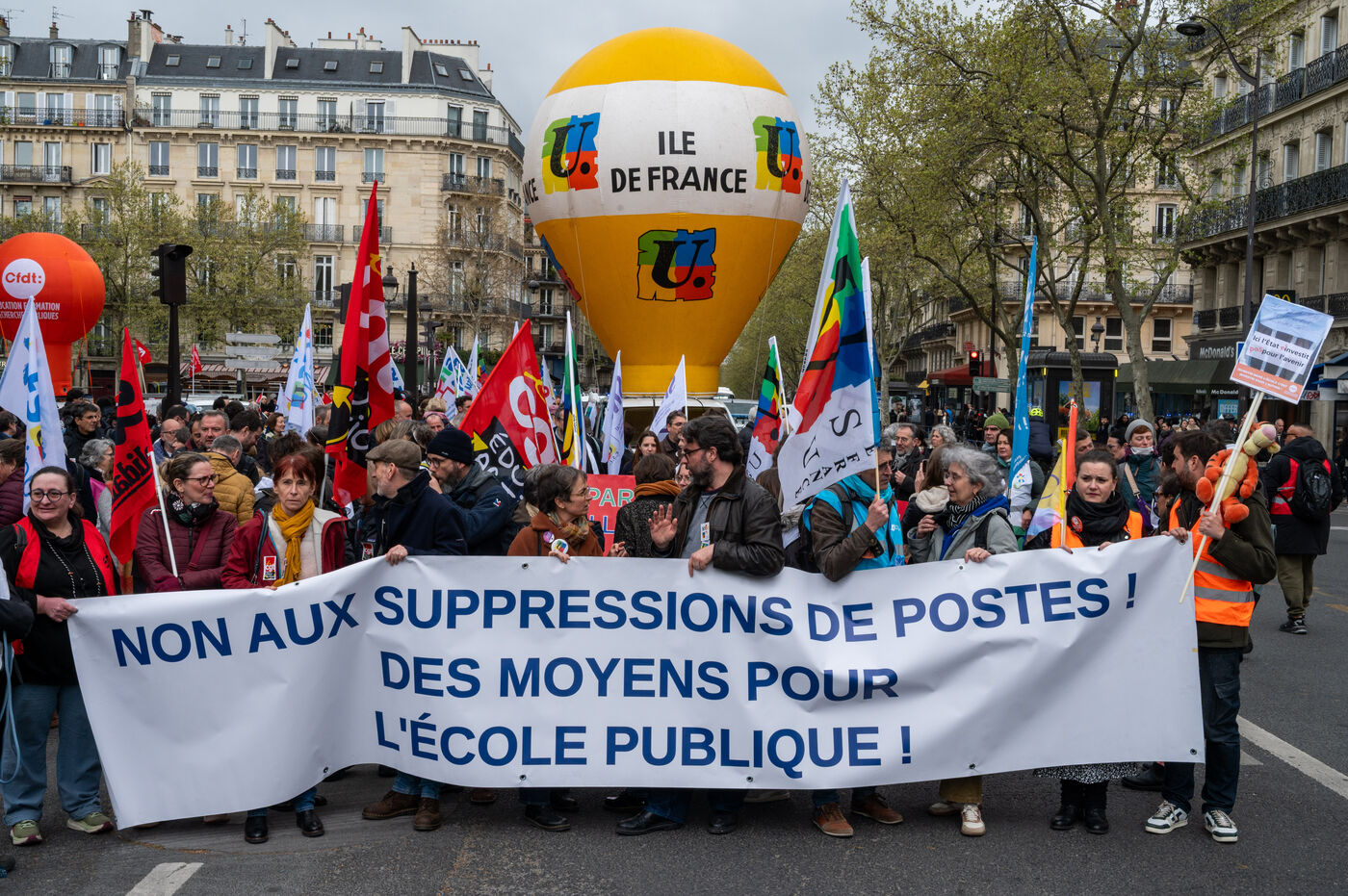 Demonstration by the inter-union education group FSU, UNSA, CFDT, CGT, SUD against job cuts and for better wages in Paris. Day of strike in public establishments and mobilization against the closure of classes, against the elimination of positions.