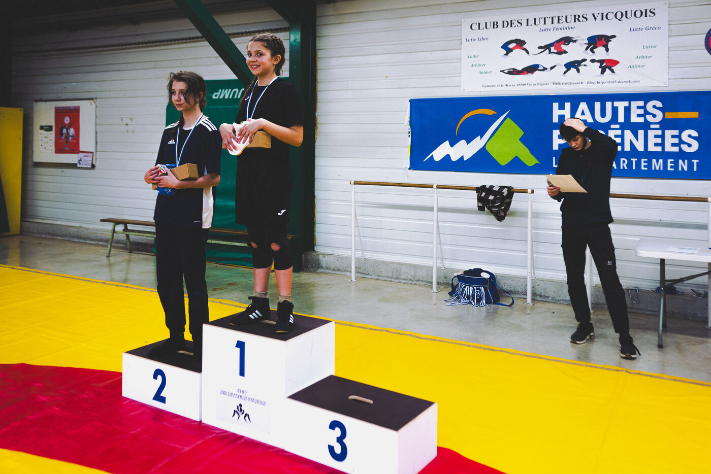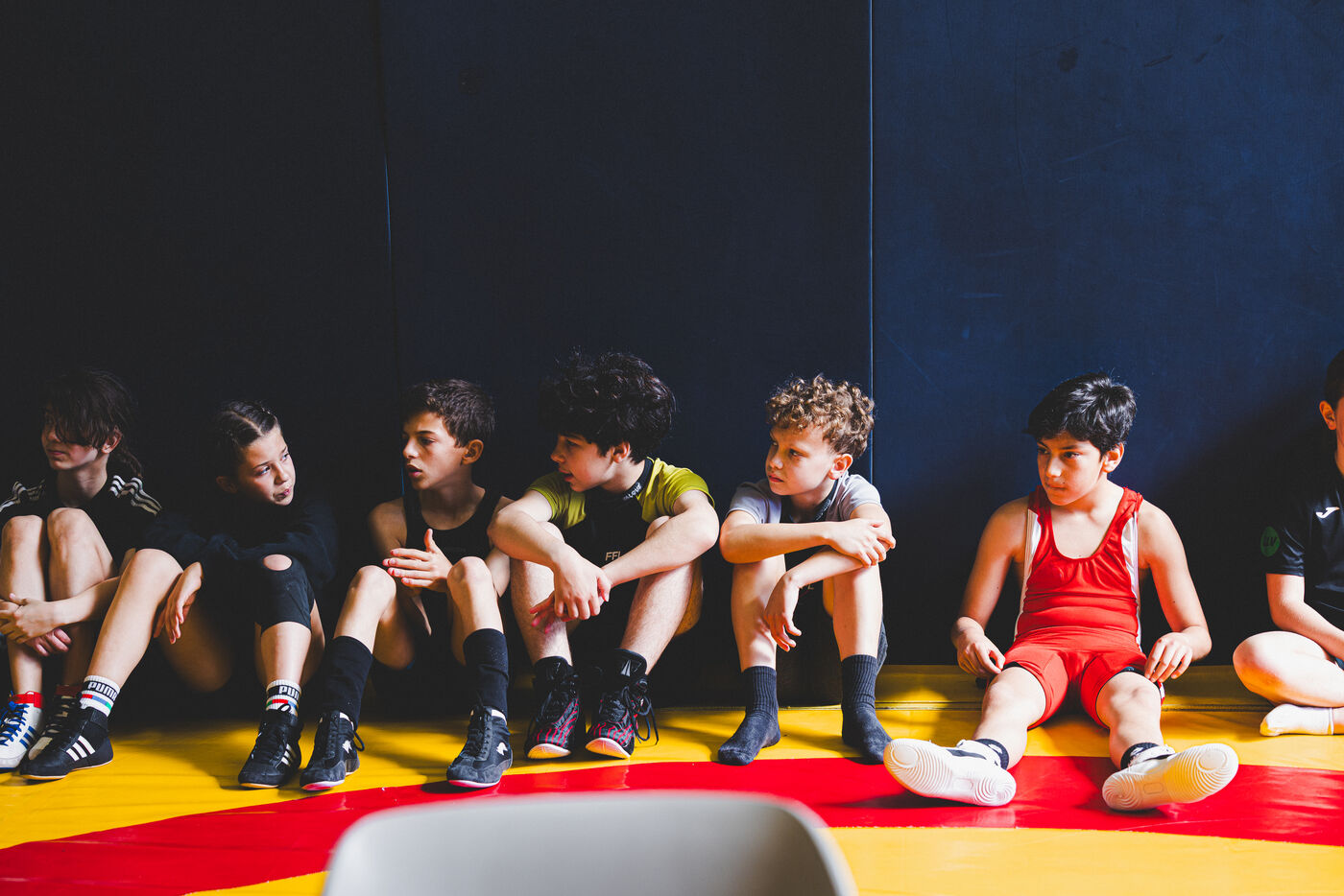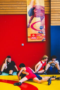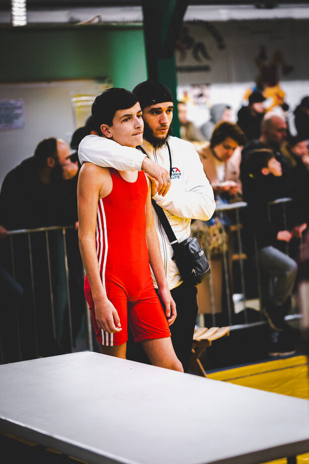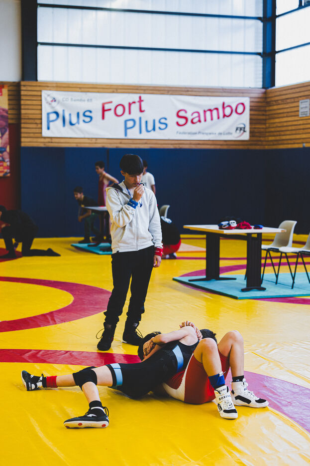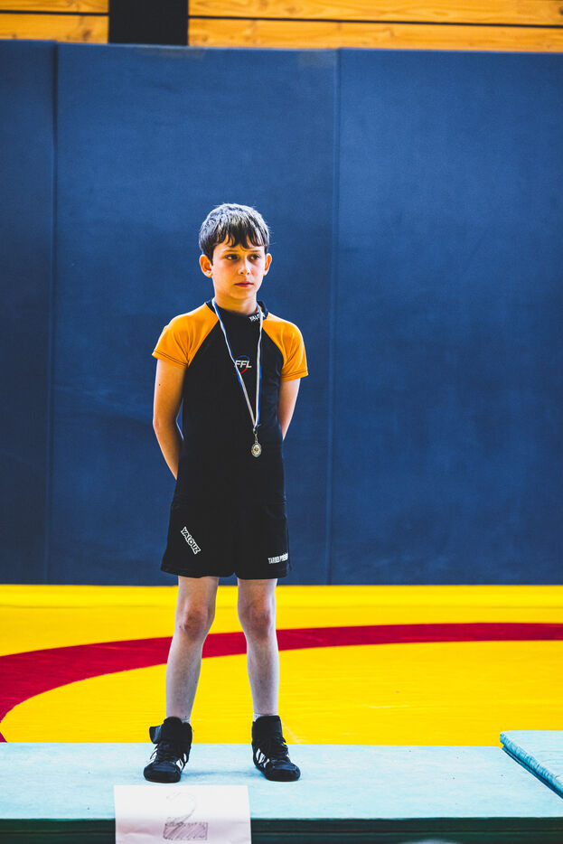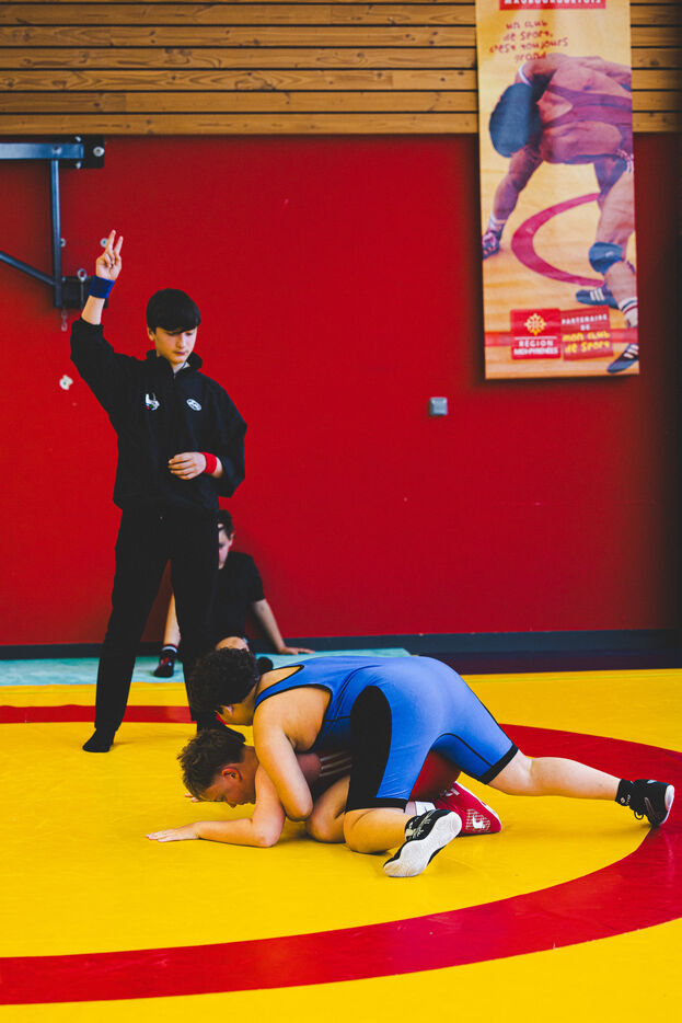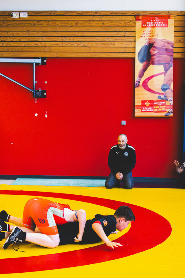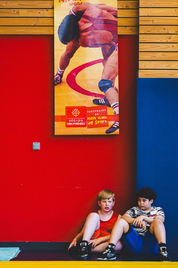 This series shows various wrestling competitions in Bigorre, South-West of France. Maubourguet and Vic-en-Bigorre Wrestling Club hosted competitions bringing together around one hundred junior wrestlers from clubs in Occitanie, including Montauban, Toulouse, Tarbes, Maubourguet, and Vic-en-Bigorre. Girls and boys competed in often spectacular mixed matches in front of their families. This sport, which attracts a diverse audience in Occitanie, benefits from the experience and wrestling culture of coaches of Chechen origin. The development of the Bigourdane school of wrestling is greatly indebted to the late Charly Cancel, a national referee and regional and departmental wrestling administrator, whose sons have continued his work in the Bigorre region.